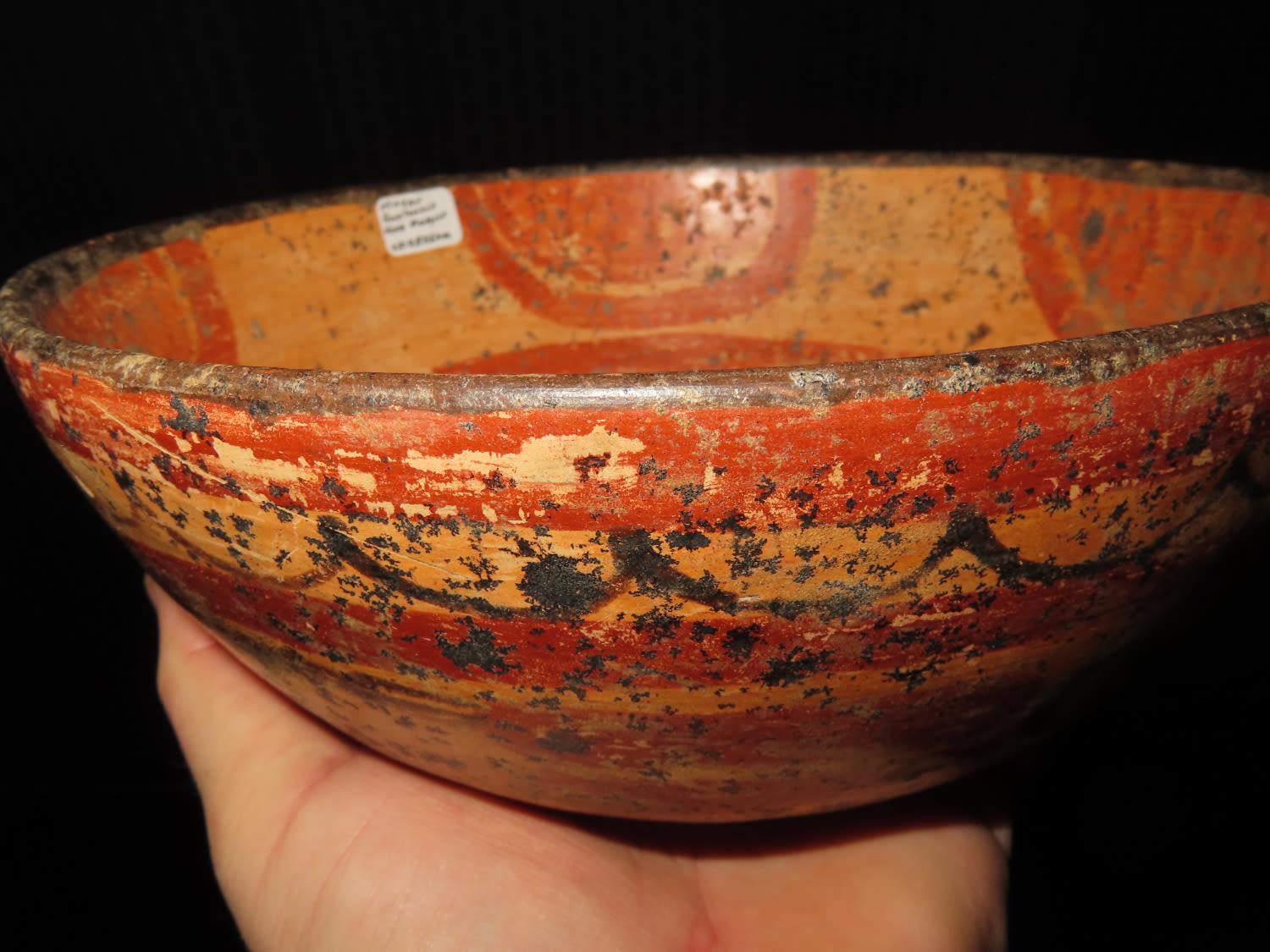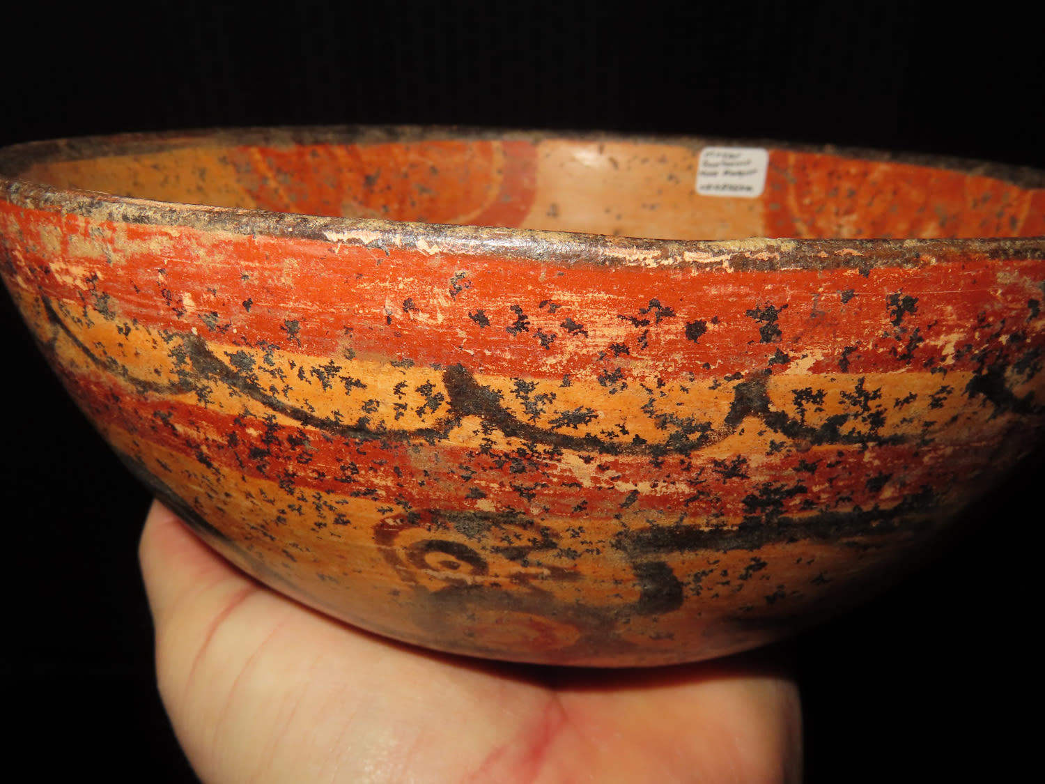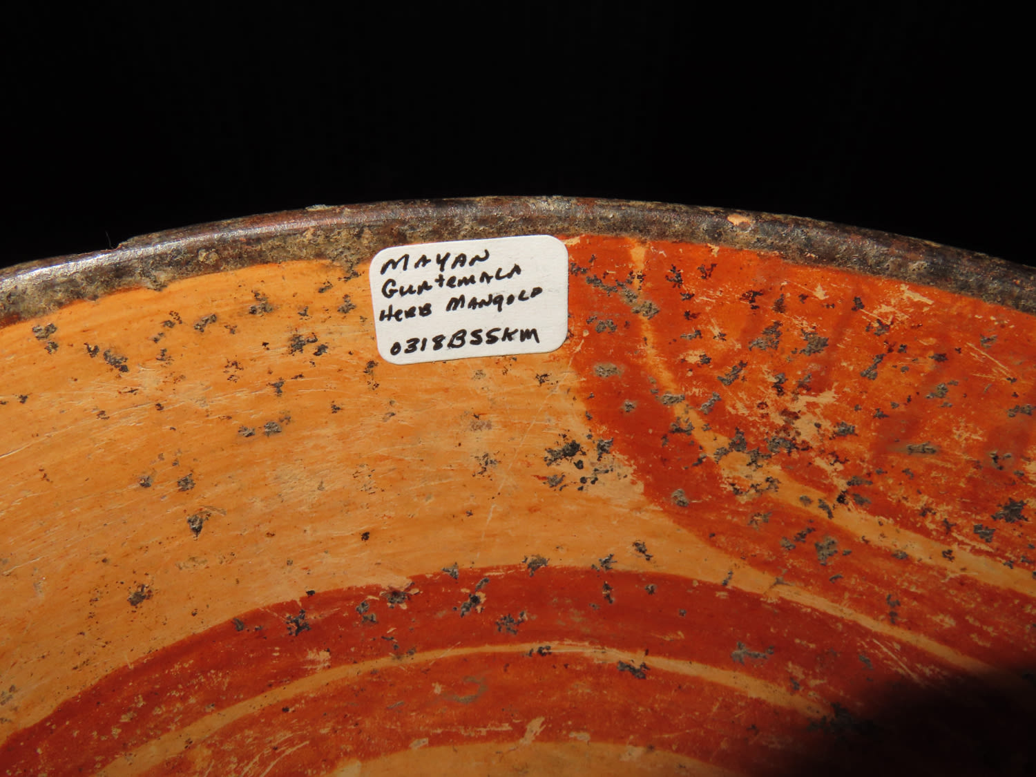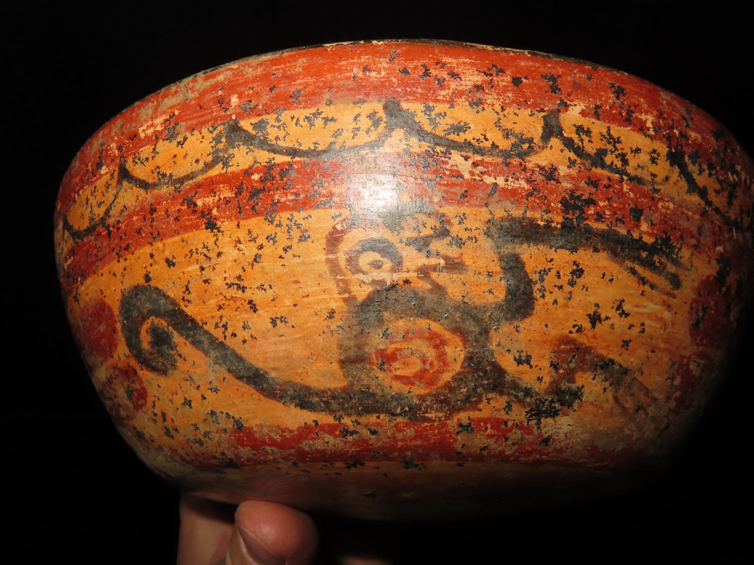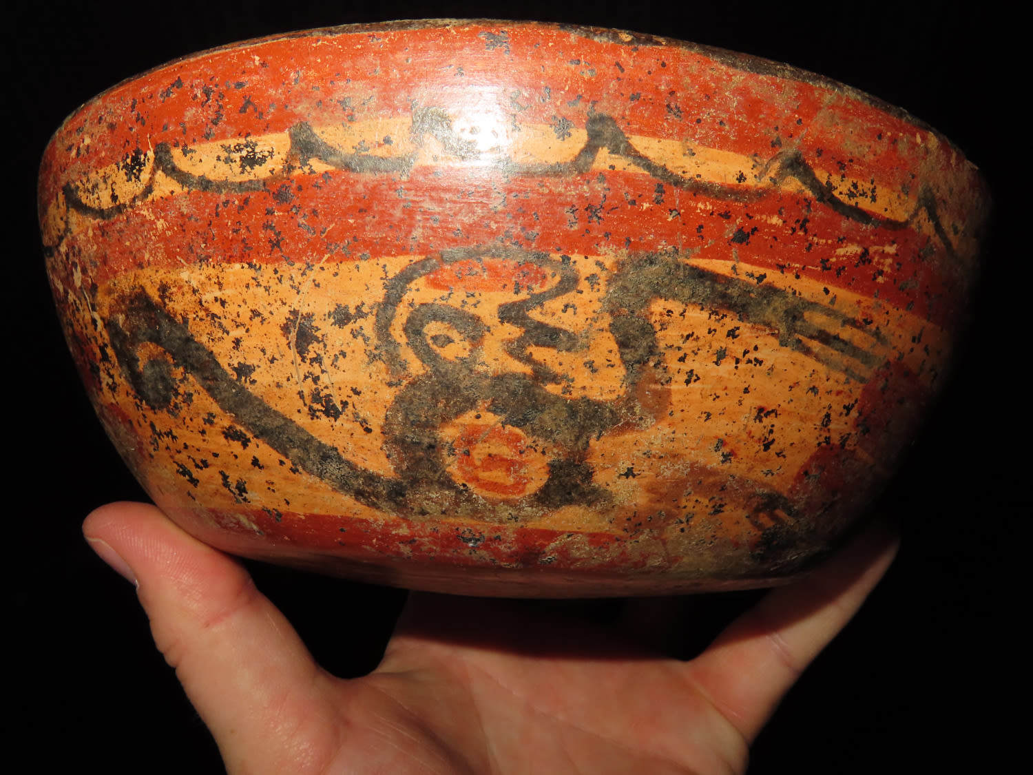 7 3/4″ MAYAN POLYCHROME PAINTED POTTERY EFFIGY BOWL, PRECOLUMBIAN, HOWLER MONKEYS AROUND THE OUTSIDE WITH BEAUTIFUL FLOWER DESIGN ON THE INSIDE, SOLID EXAMPLE WITH ALL ORIGINAL PAINT, EX HERB MANGOLD, DENNIS DEROSEAR, EXCELLENT QUALTIY EXAMPLE