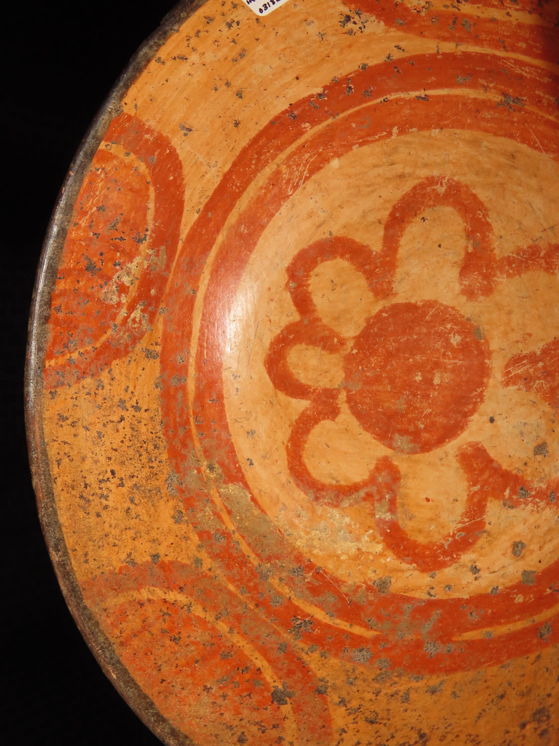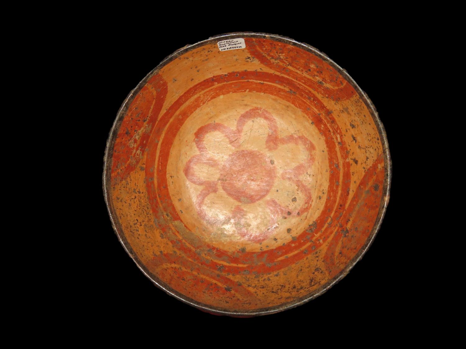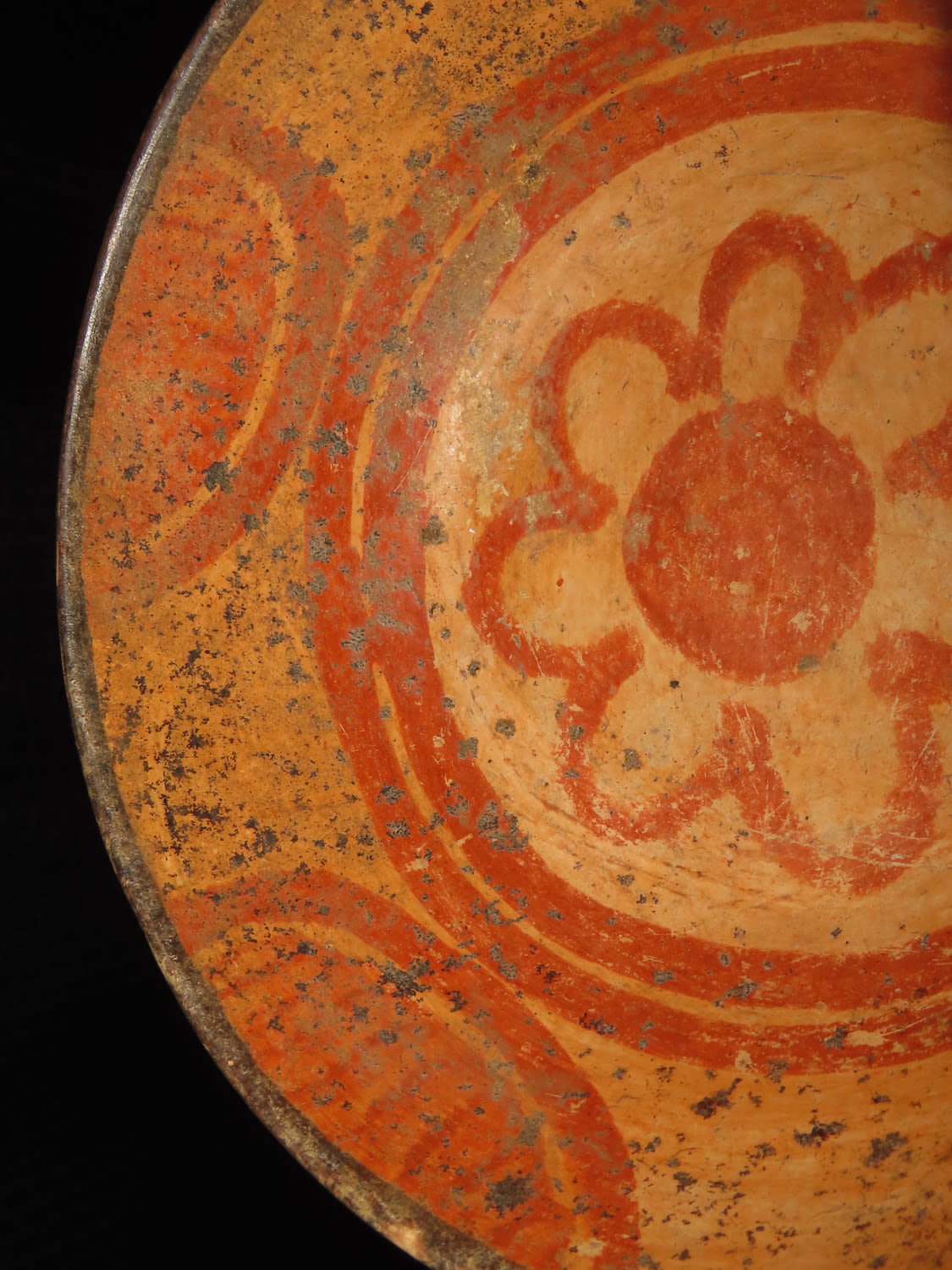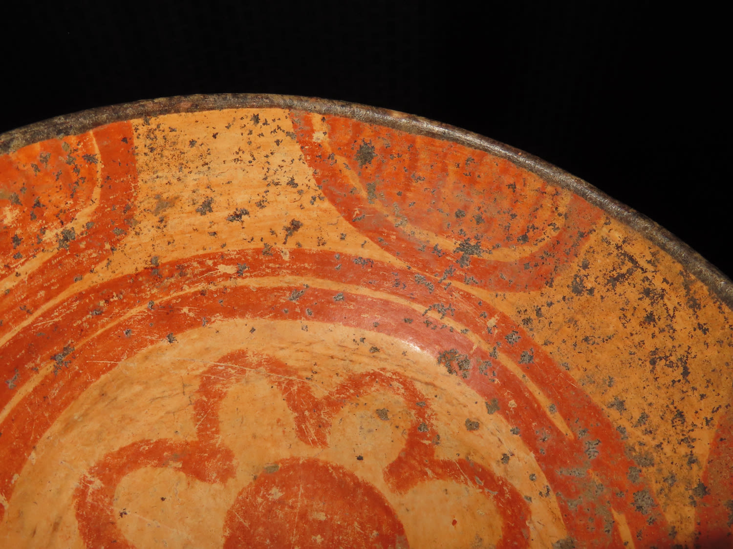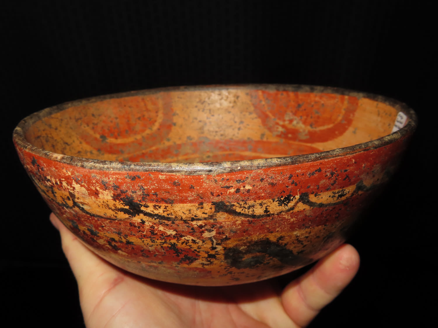 7 3/4″ MAYAN POLYCHROME PAINTED POTTERY EFFIGY BOWL, PRECOLUMBIAN, HOWLER MONKEYS AROUND THE OUTSIDE WITH BEAUTIFUL FLOWER DESIGN ON THE INSIDE, SOLID EXAMPLE WITH ALL ORIGINAL PAINT, EX HERB MANGOLD, DENNIS DEROSEAR, EXCELLENT QUALTIY EXAMPLE