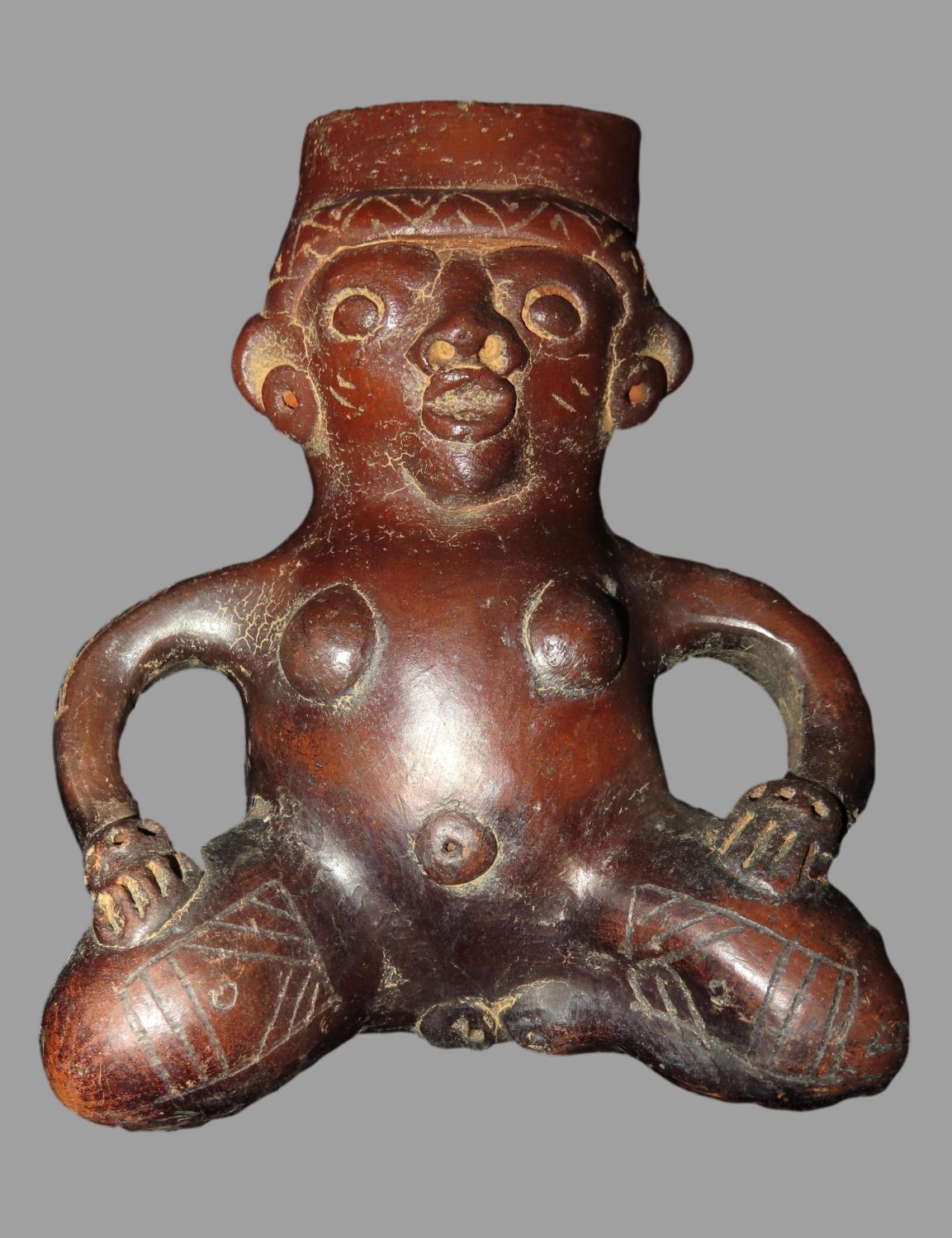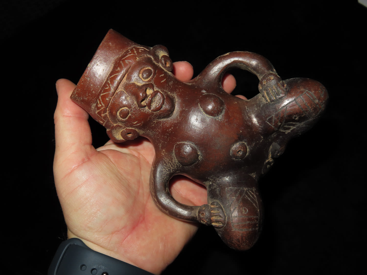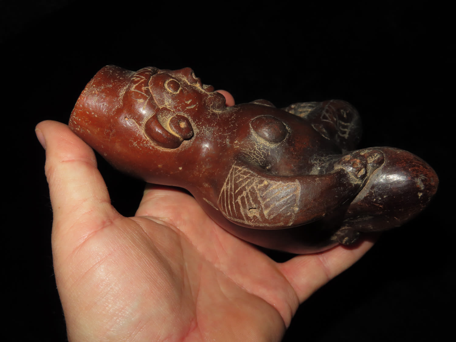 AMAZING 6″ TALL HUMAN EFFIGY VESSEL W/ RATTLE LEGS FROM MEXCIO, VERY DETAILED FEMALE FIGURE WITH ENGRAVED TATTOOS & LEGS THAT RATTLE!