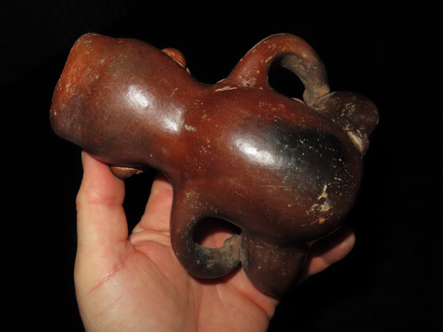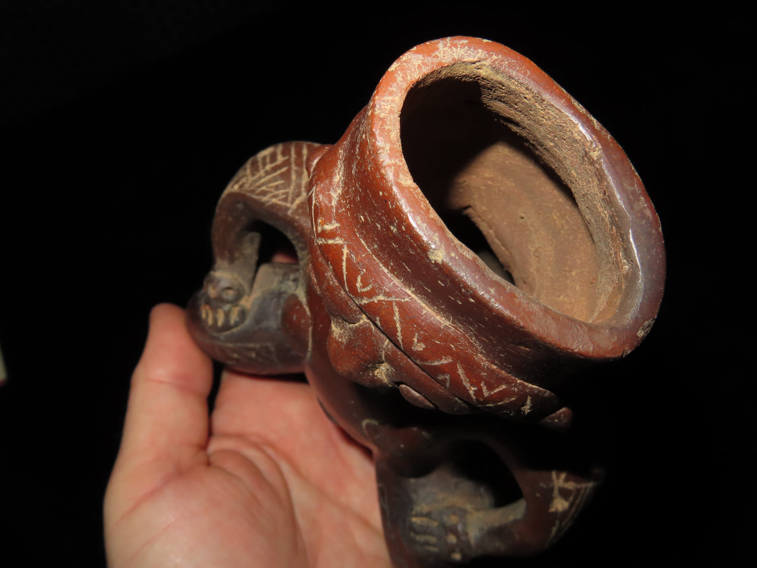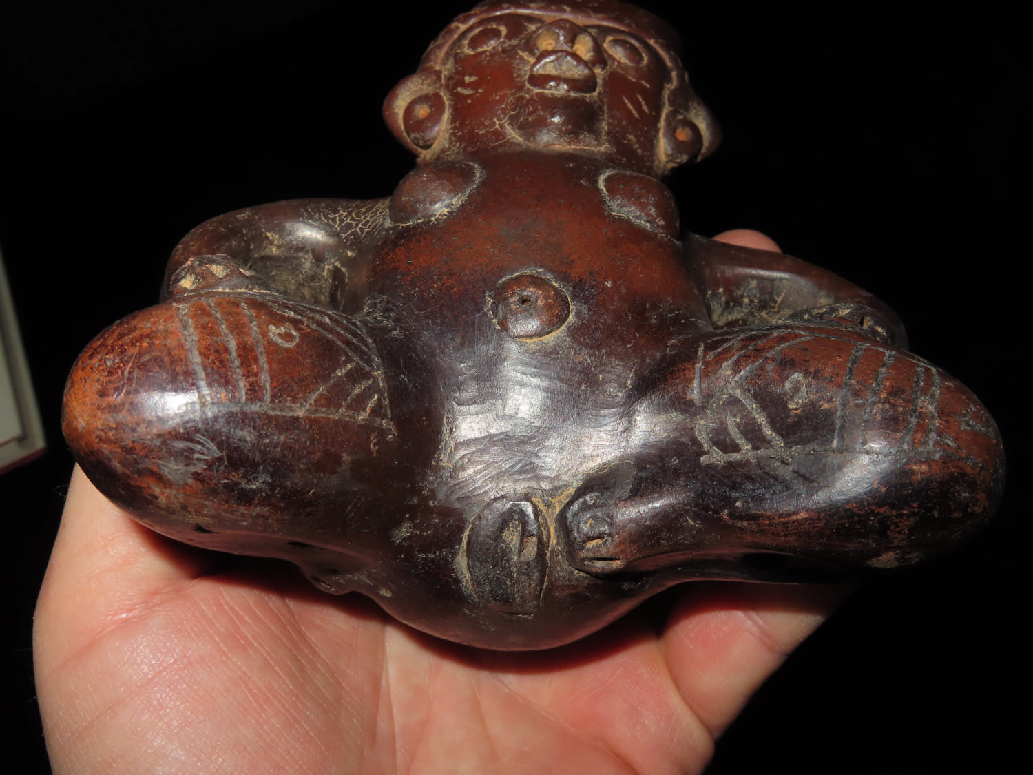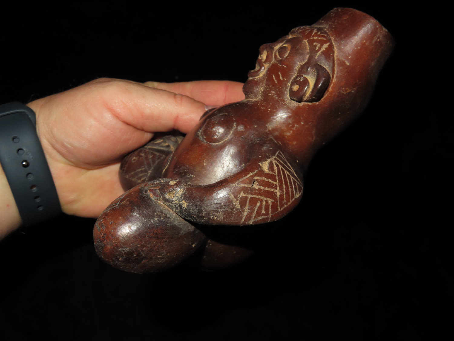 AMAZING 6″ TALL HUMAN EFFIGY VESSEL W/ RATTLE LEGS FROM MEXCIO, VERY DETAILED FEMALE FIGURE WITH ENGRAVED TATTOOS & LEGS THAT RATTLE!