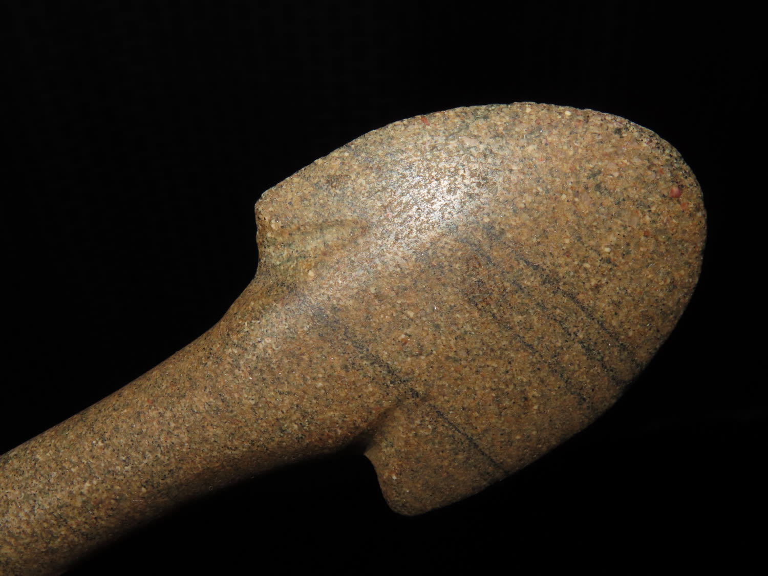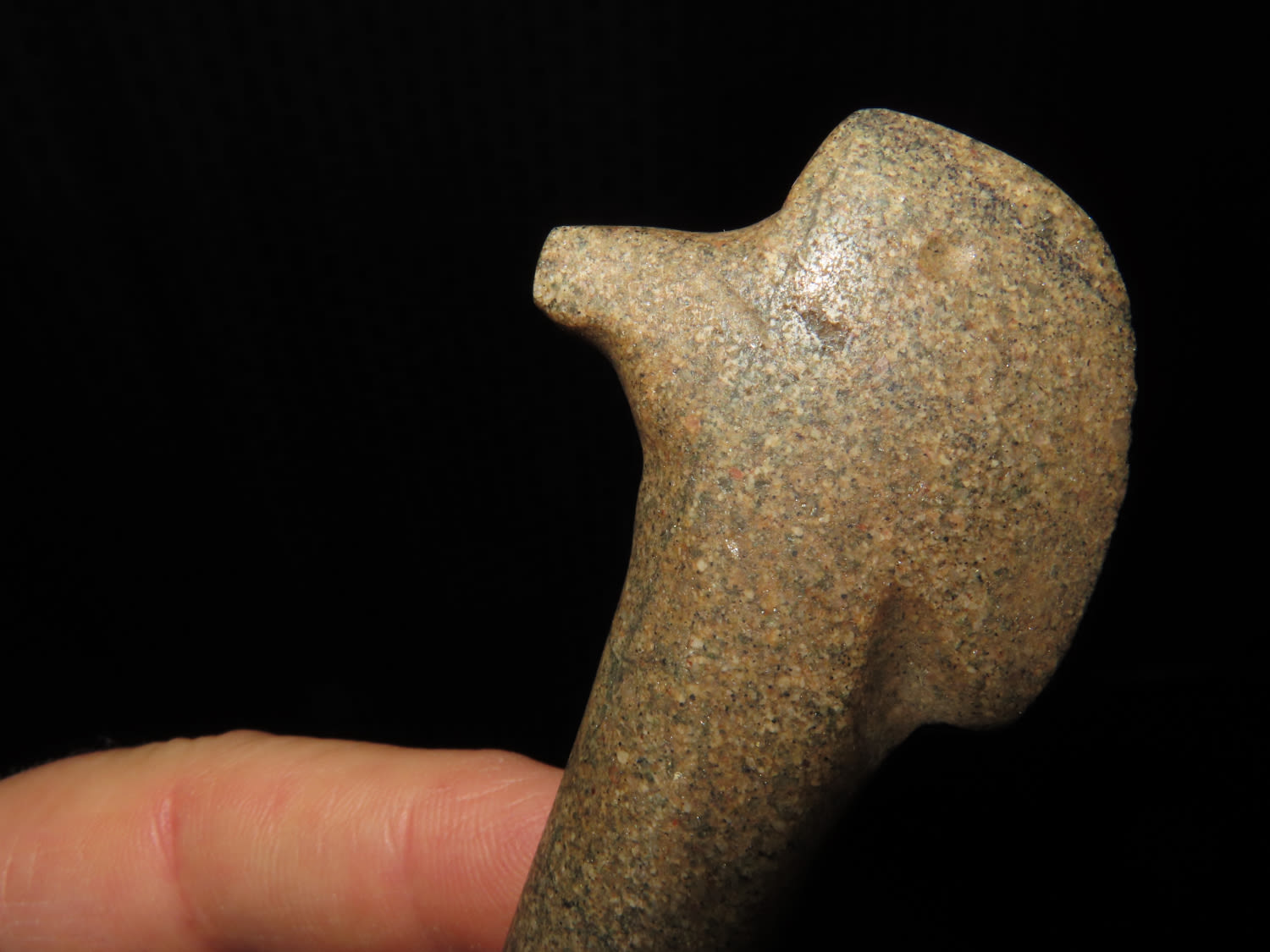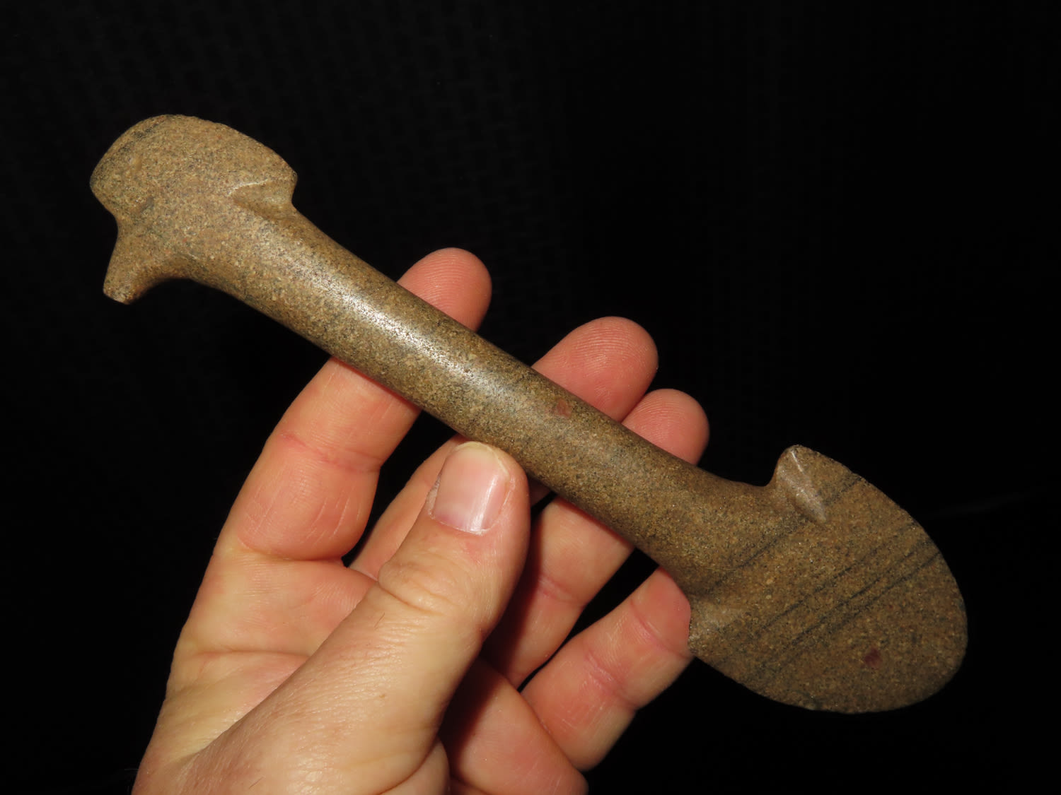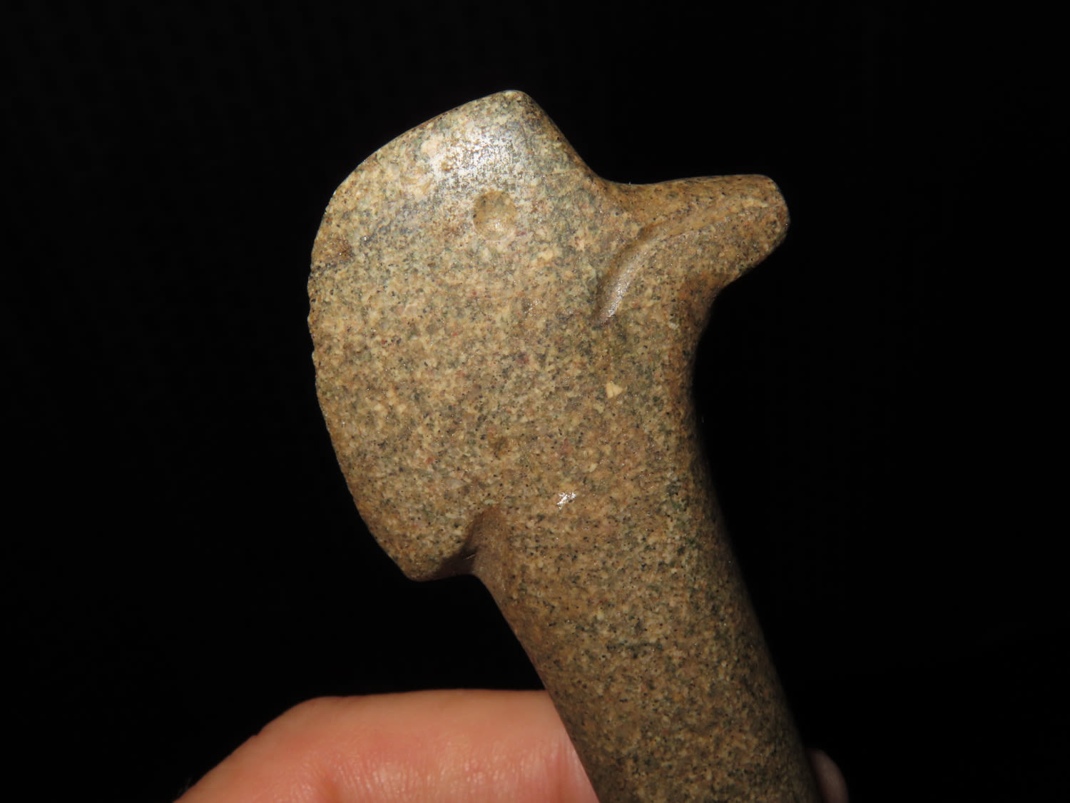7 1/8″ RARE BIRD EFFIGY SPUD / SCEPTRE FROM PERU, VERY UNIQUE PIECE OF STONE, NICELY POLISHED, SHARP BIT, DETAILED BIRD HEAD ON TOP