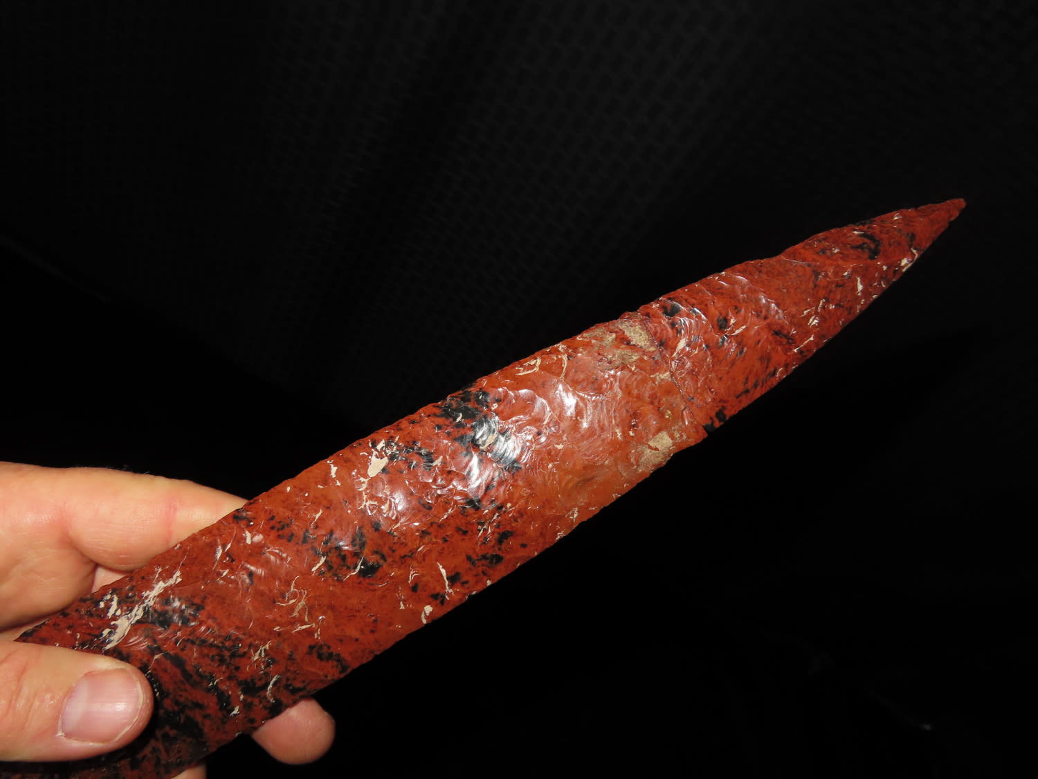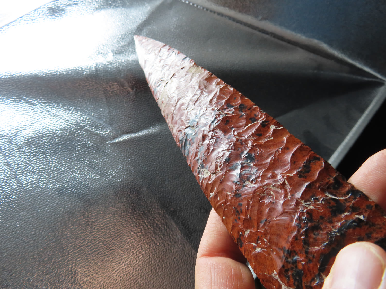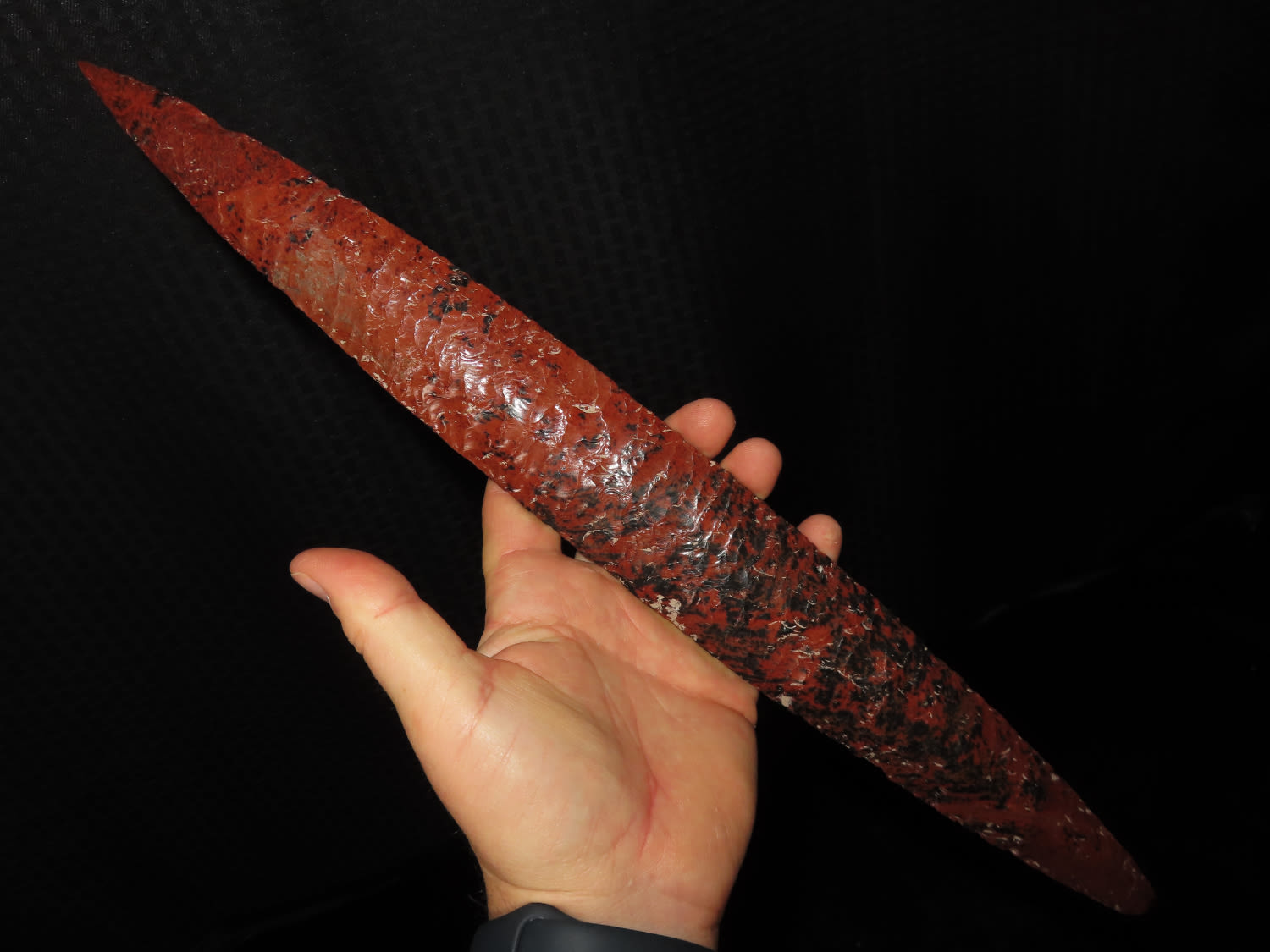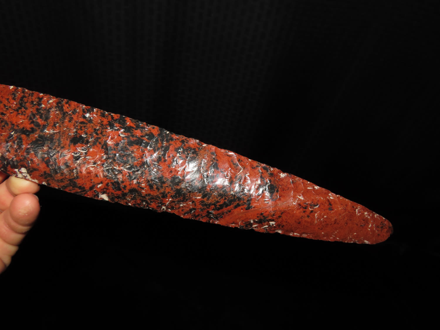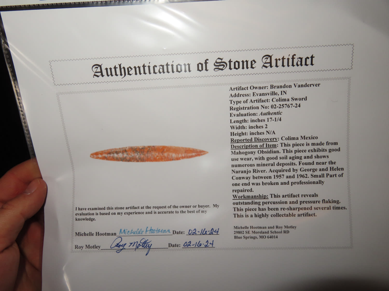 17 1/4″ MASSIVE COLIMA SWORD, ROY MOTLEY COA, FOUND NEAR THE NARANJO RIVER OUTSIDE OF COLIMA MEXICO, EX GEORGE & HELEN CONWAY, LEN WEIDNER, & BRANDON VANDERVER. INCLUDED ARE PICTURES OF THE ITEMS WHEN THEY WERE AQUIRED IN THE 1950’S, THEY WERE KEPT UNDER THE FLOOR BOARDS OF THE FINDERS HOUSE FOR SAFETY, WRAPPED UP IN BURLAP GUNNY SACKS. BROKEN & TIGHTLY GLUED IN ONE SPOT NEAR THE END