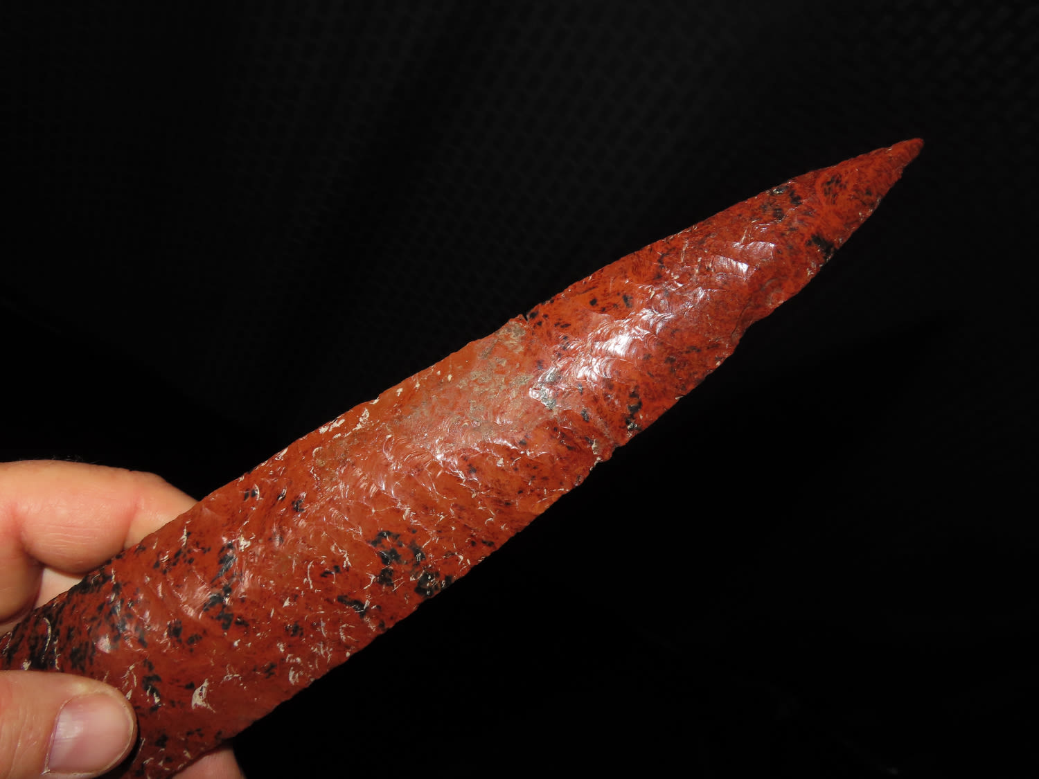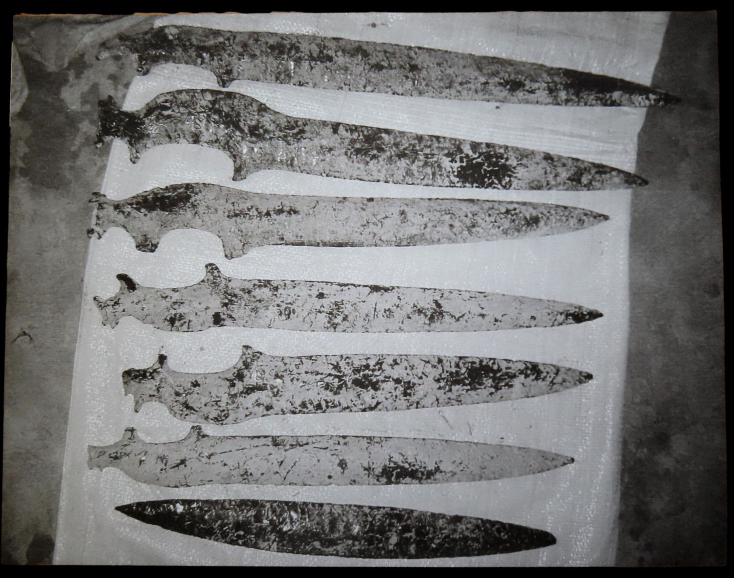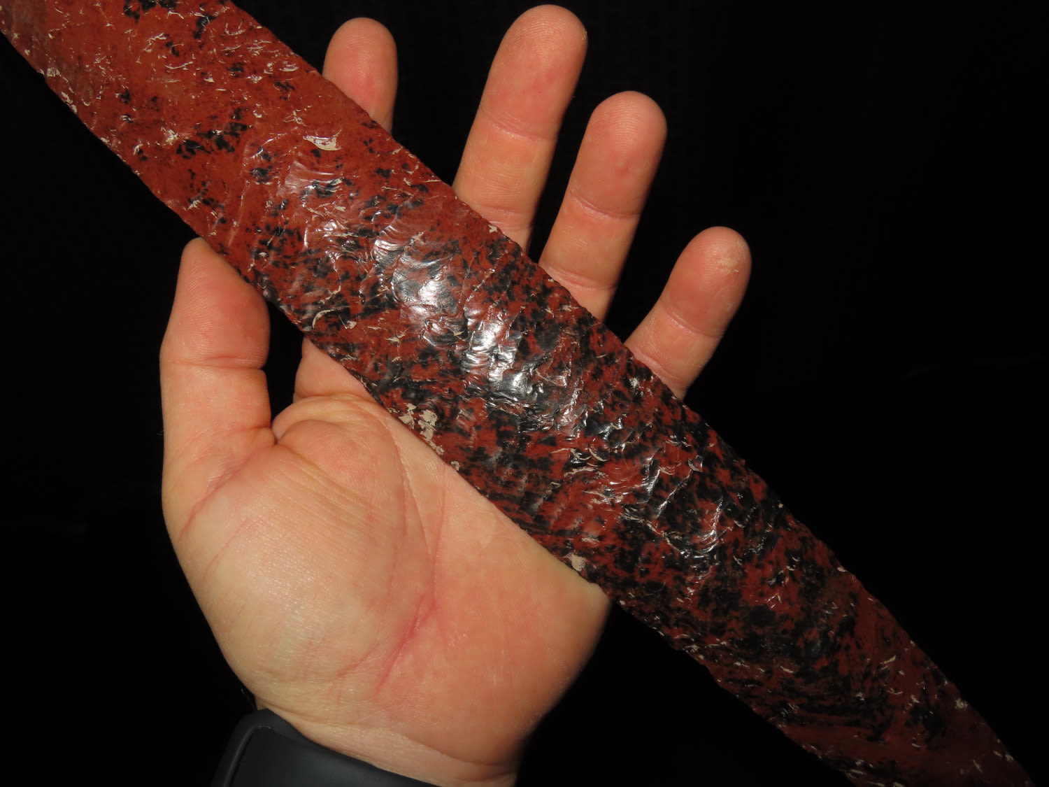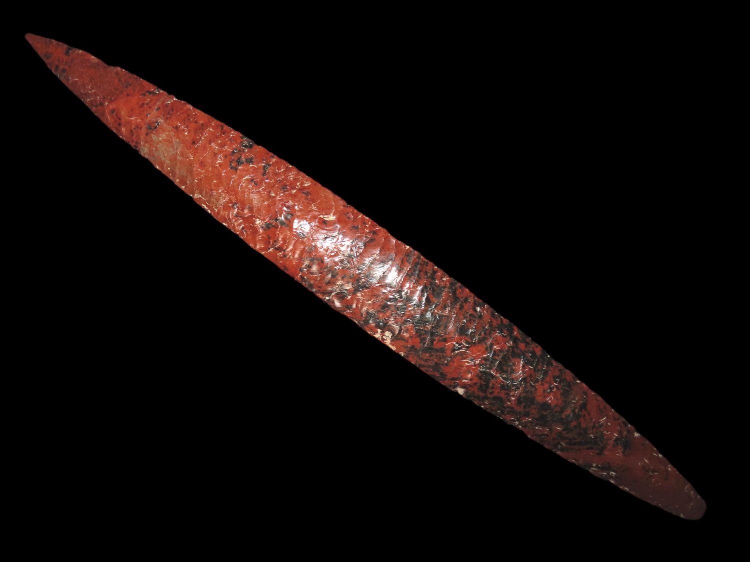 17 1/4″ MASSIVE COLIMA SWORD, ROY MOTLEY COA, FOUND NEAR THE NARANJO RIVER OUTSIDE OF COLIMA MEXICO, EX GEORGE & HELEN CONWAY, LEN WEIDNER, & BRANDON VANDERVER. INCLUDED ARE PICTURES OF THE ITEMS WHEN THEY WERE AQUIRED IN THE 1950’S, THEY WERE KEPT UNDER THE FLOOR BOARDS OF THE FINDERS HOUSE FOR SAFETY, WRAPPED UP IN BURLAP GUNNY SACKS. BROKEN & TIGHTLY GLUED IN ONE SPOT NEAR THE END