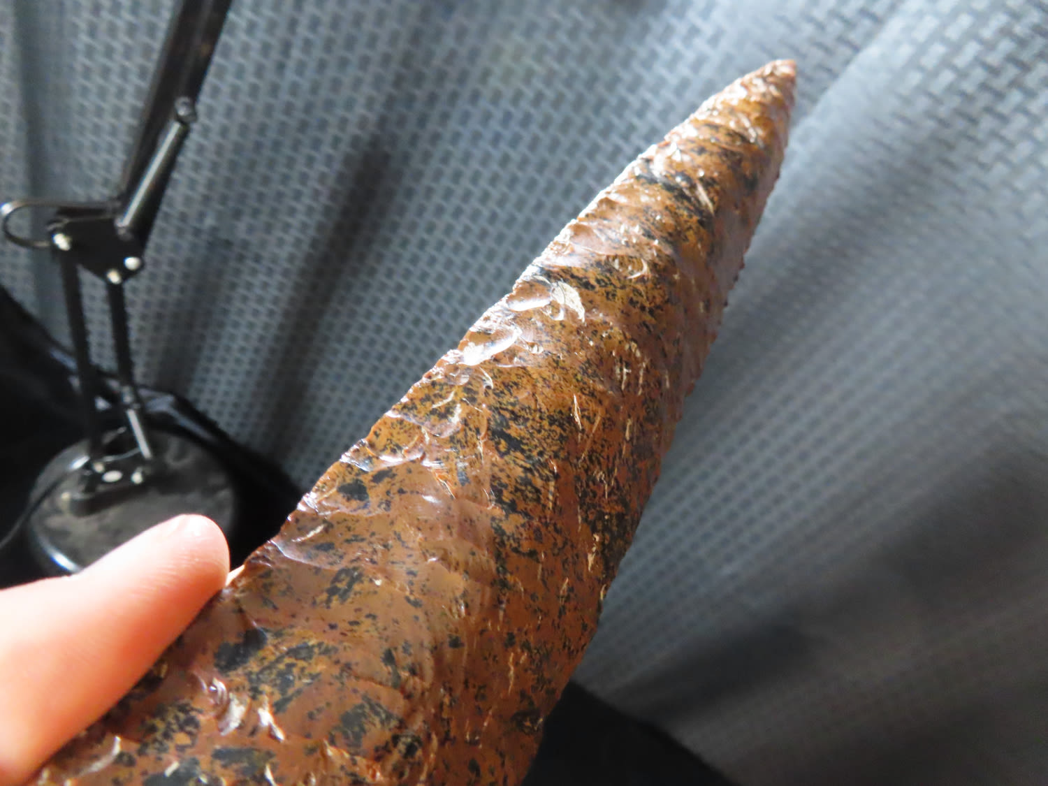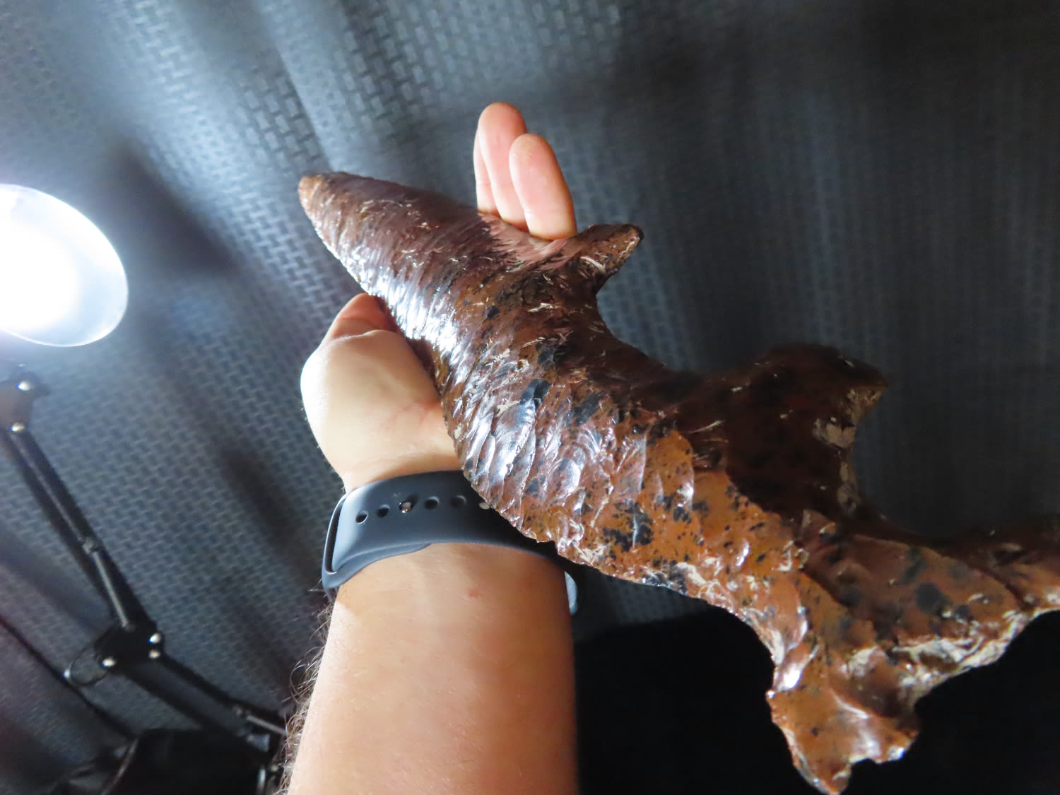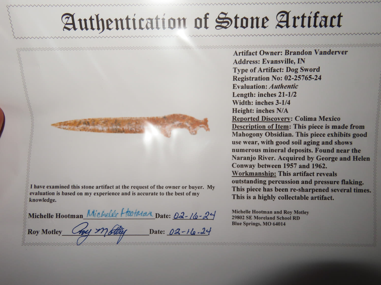 21 1/2″ MASSIVE COLIMA DOG EFFIGY SWORD, MOTLEY COA, FOUND NEAR THE NARANJO RIVER IN COLIMA MEXICO, EX GEORGE & HELEN CONWAY, LEN WEIDNER, BRANDON VANDERVER. INCLUDED ARE PICTURES OF THE ITEMS WHEN THEY WERE AQUIRED IN THE 1950’S, THEY WERE KEPT UNDER THE FLOOR BOARDS OF THE FINDERS HOUSE FOR SAFETY, WRAPPED UP IN BURLAP GUNNY SACKS. THIS IS THE LARGEST & FINEST EXAMPLE EVER SOLD IN AUCTION. THE FEW THAT HAVE SOLD IN THE PAST WERE USUALLY DAMAGED, BROKEN & GLUED, AND/OR 5-10″ SHORTER THAN THIS ONE. THIS ONE IS PRISTINE!!!