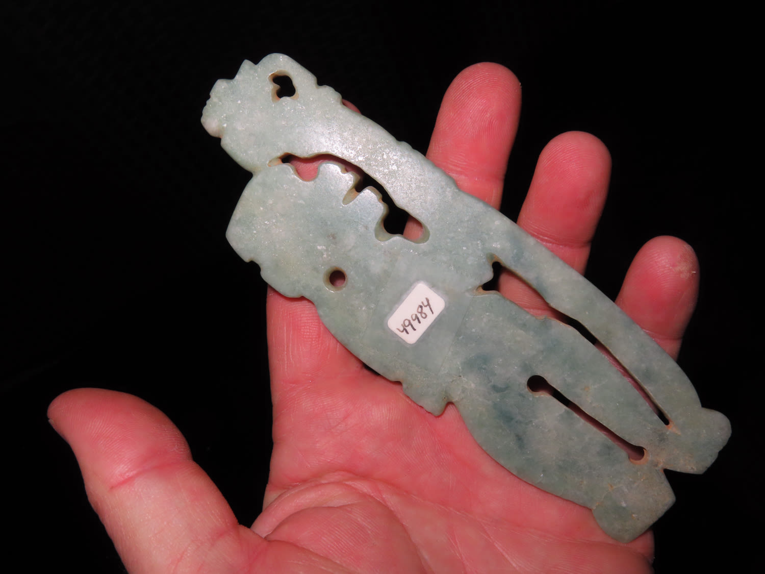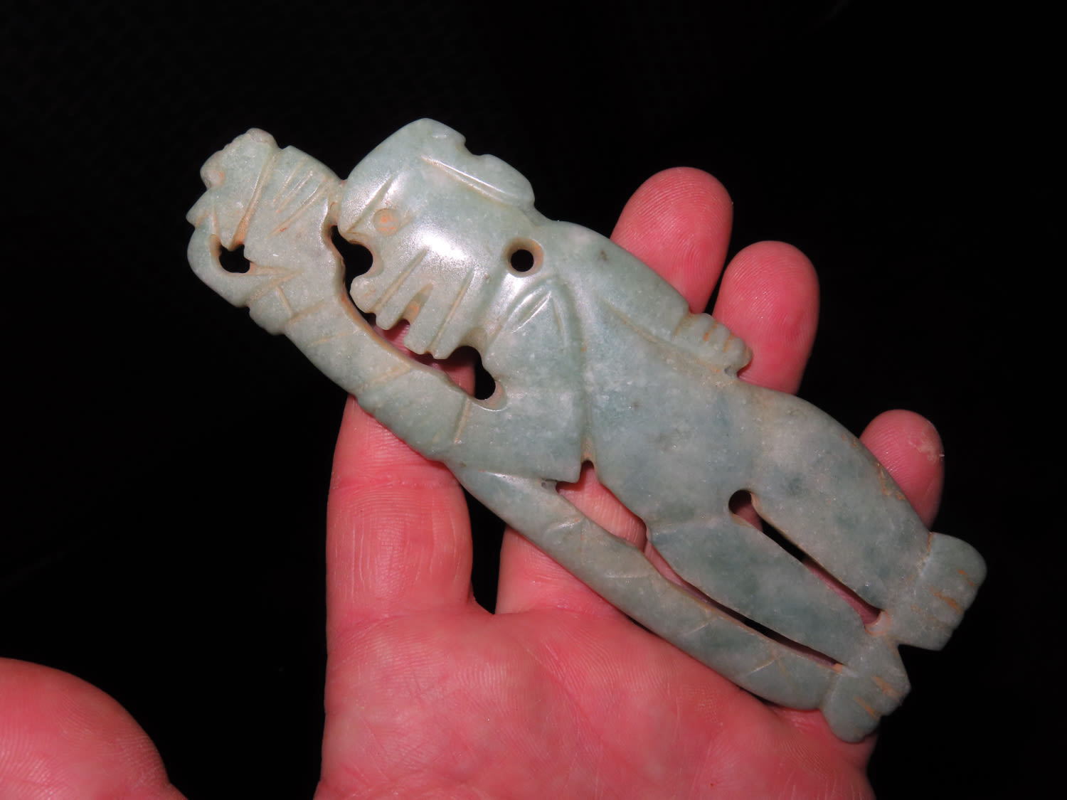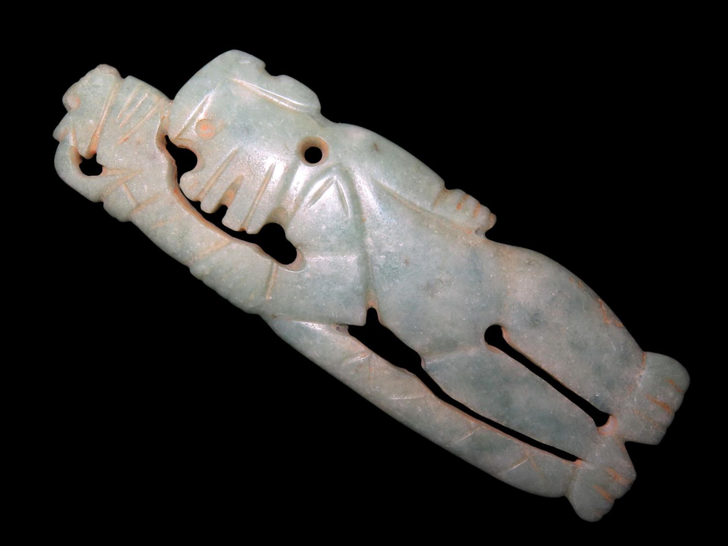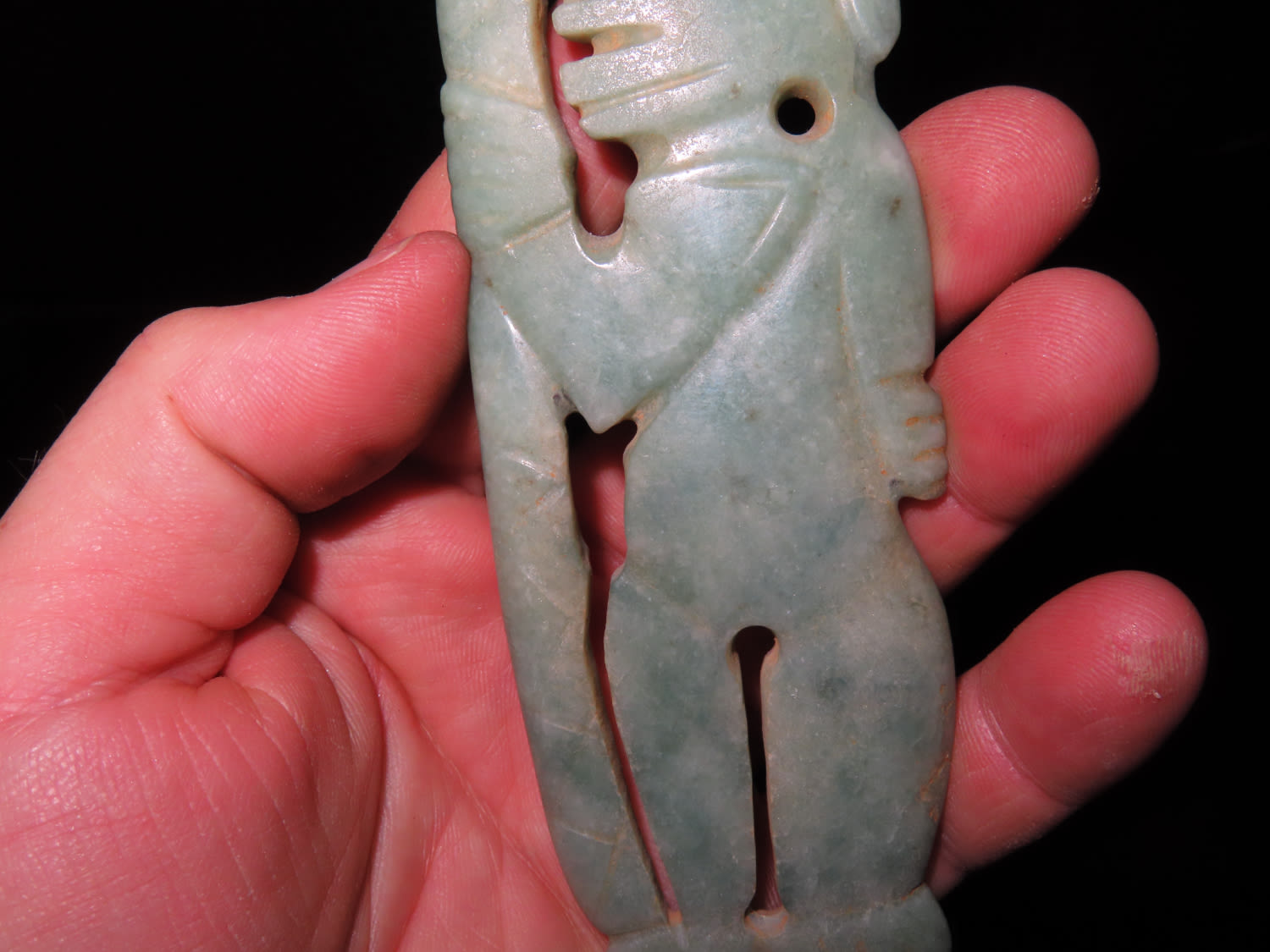 INCREDIBLE 5 1/2″ JADE HUMAN EFFIGY PENDANT / AXE GOD FROM COSTA RICA, THE FIGURE IS HOLDING A SNAKE OR STAFF WITH A BIRD ON TOP, HIGHLY TRANSLUCENT WITH AMAZING POLISH, JUST A FANTASTIC HIGH GRADE EXAMPLE, PRECOLUMBIAN ARTIFACT, GORGET