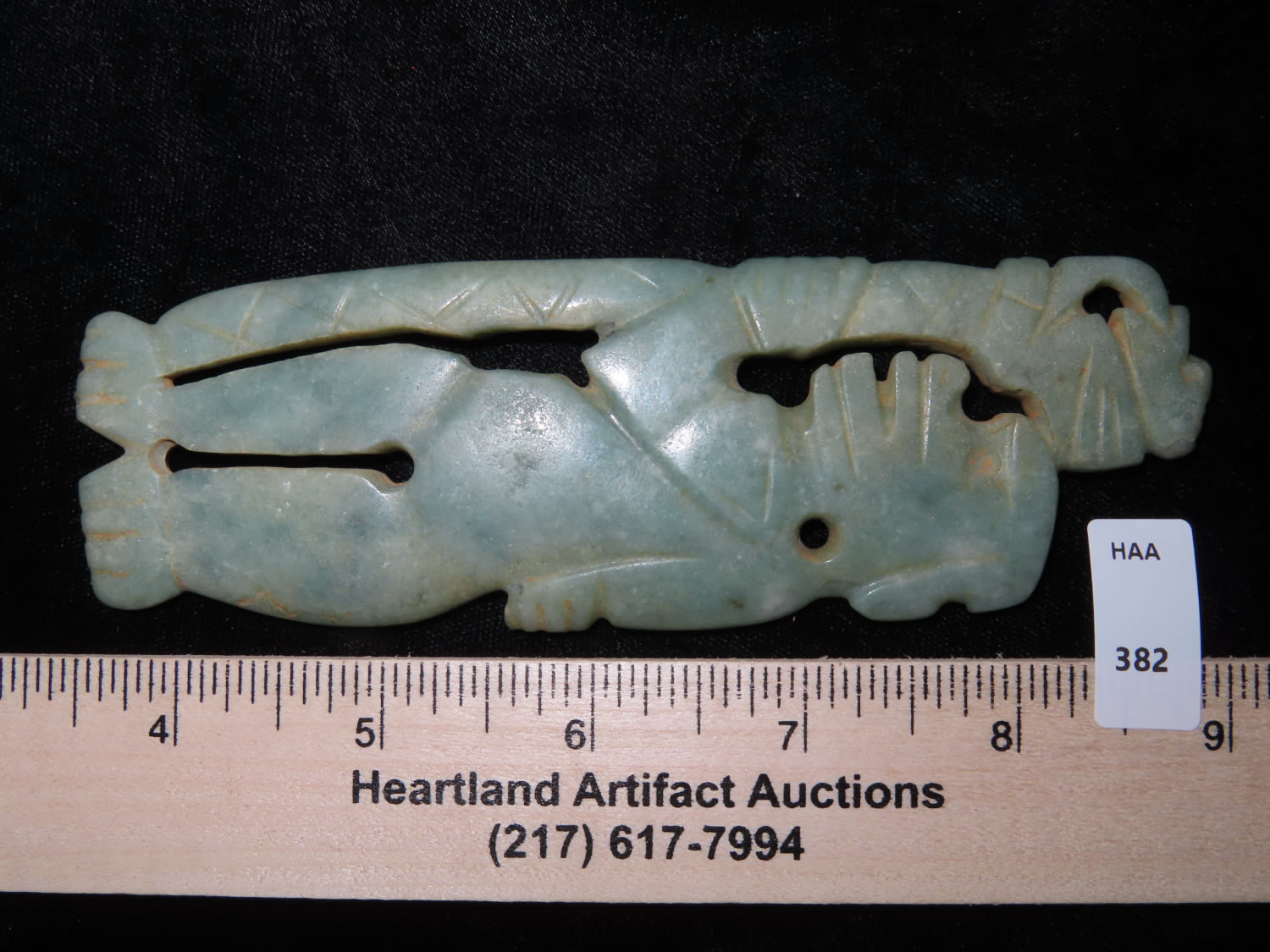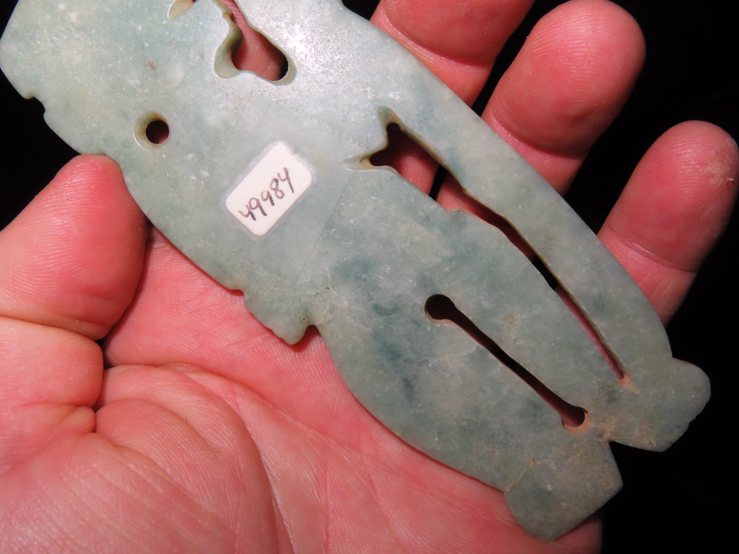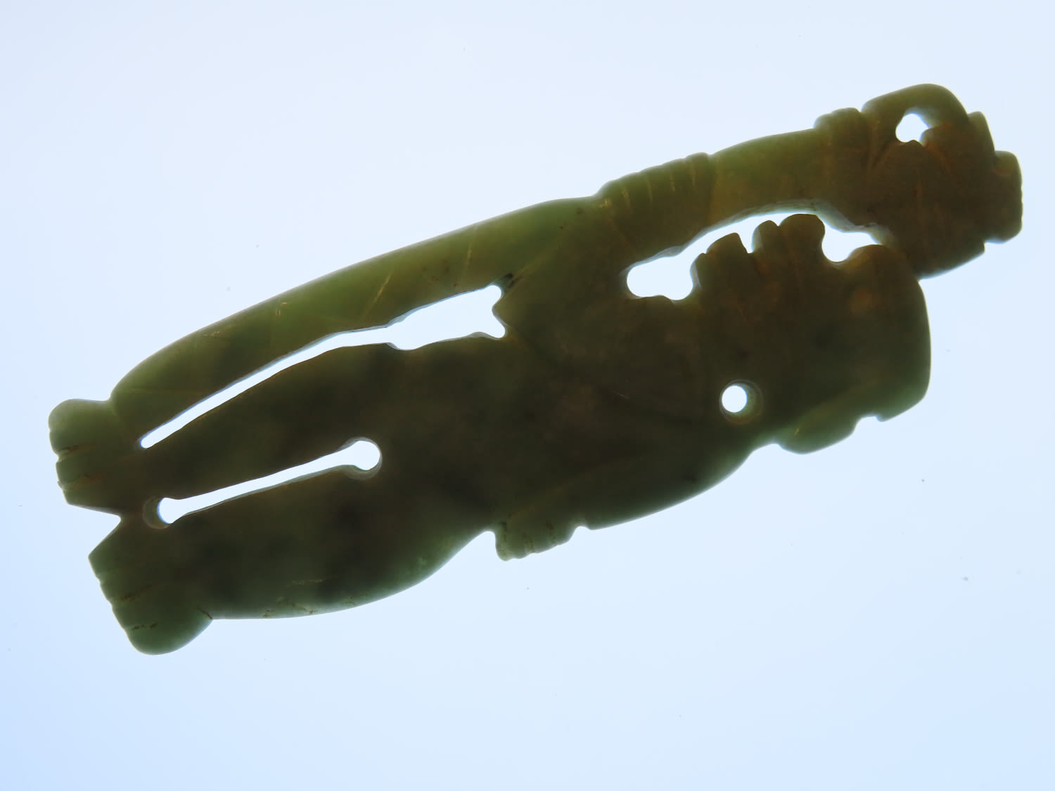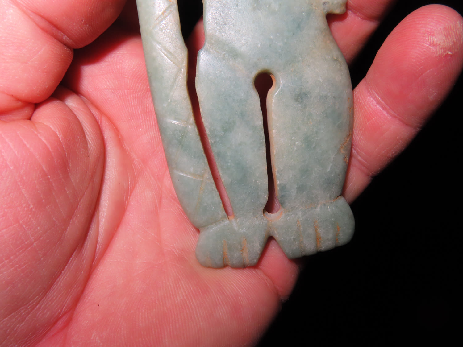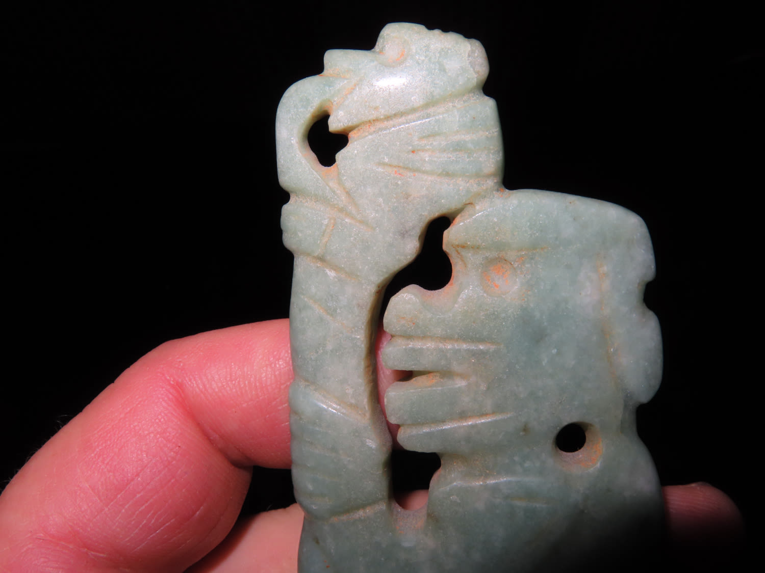 INCREDIBLE 5 1/2″ JADE HUMAN EFFIGY PENDANT / AXE GOD FROM COSTA RICA, THE FIGURE IS HOLDING A SNAKE OR STAFF WITH A BIRD ON TOP, HIGHLY TRANSLUCENT WITH AMAZING POLISH, JUST A FANTASTIC HIGH GRADE EXAMPLE, PRECOLUMBIAN ARTIFACT, GORGET