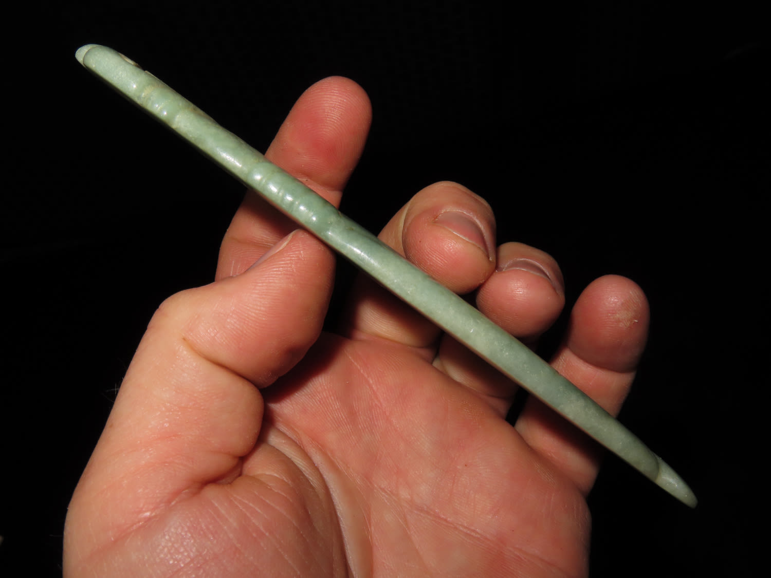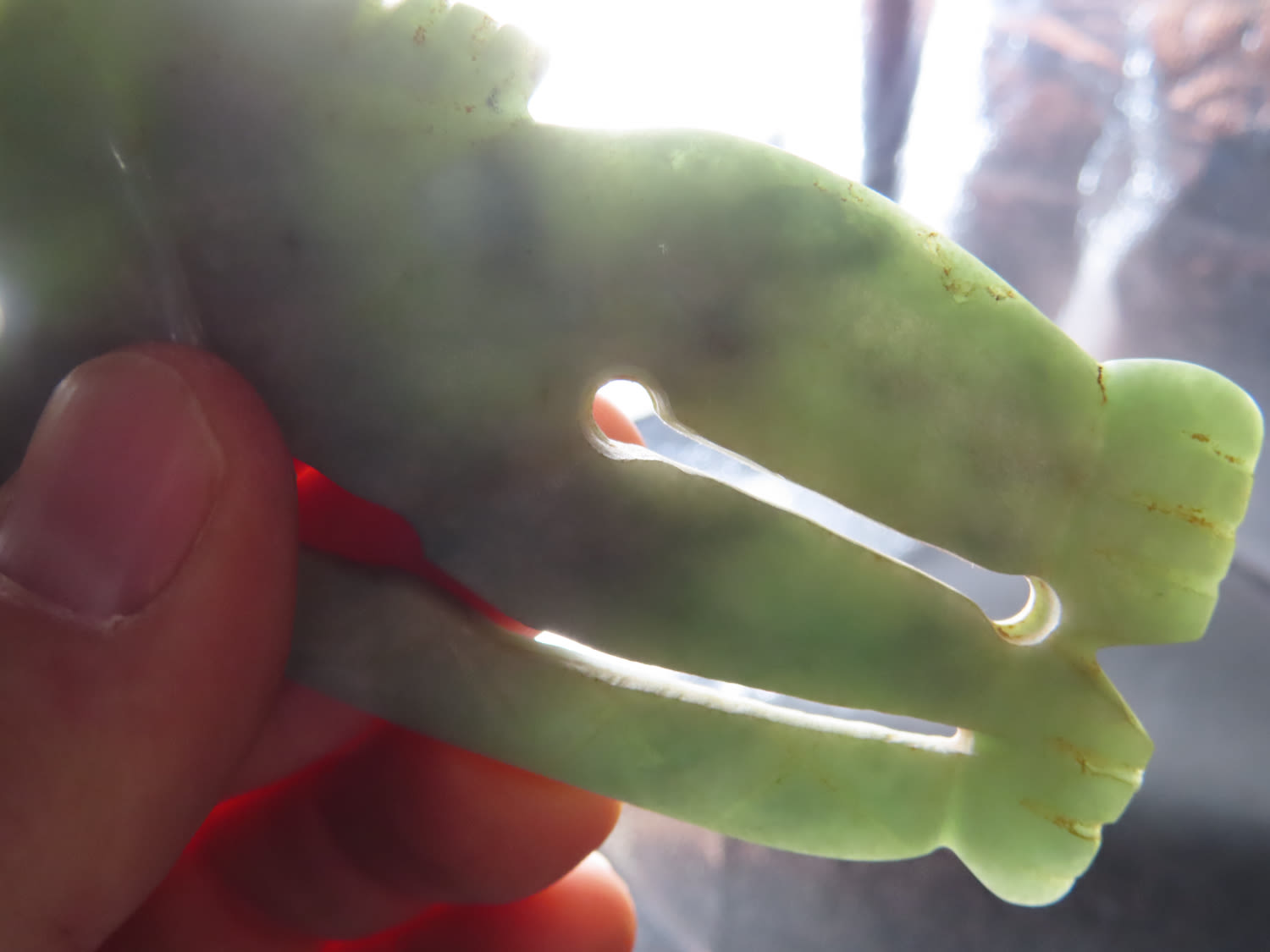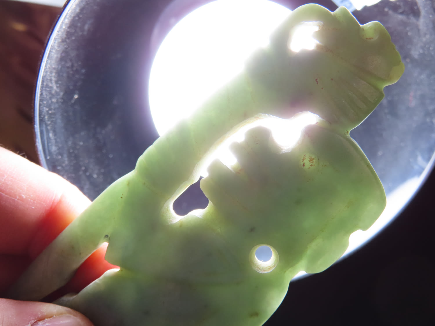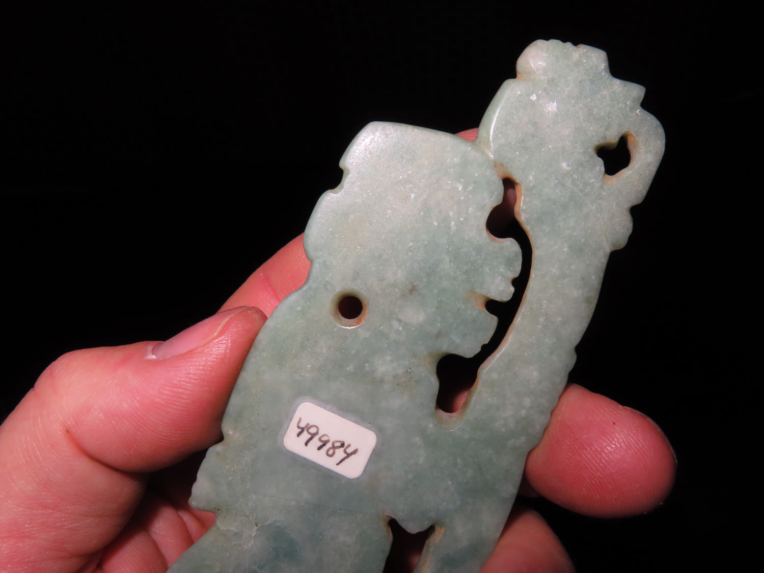 INCREDIBLE 5 1/2″ JADE HUMAN EFFIGY PENDANT / AXE GOD FROM COSTA RICA, THE FIGURE IS HOLDING A SNAKE OR STAFF WITH A BIRD ON TOP, HIGHLY TRANSLUCENT WITH AMAZING POLISH, JUST A FANTASTIC HIGH GRADE EXAMPLE, PRECOLUMBIAN ARTIFACT, GORGET
