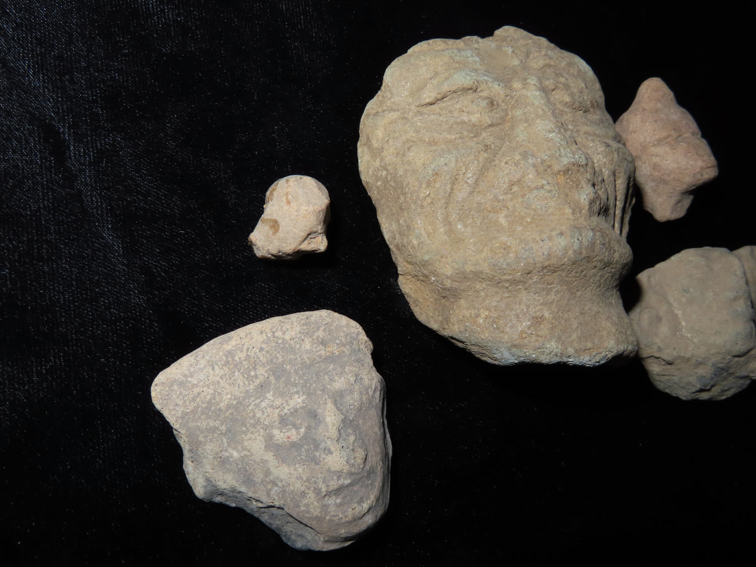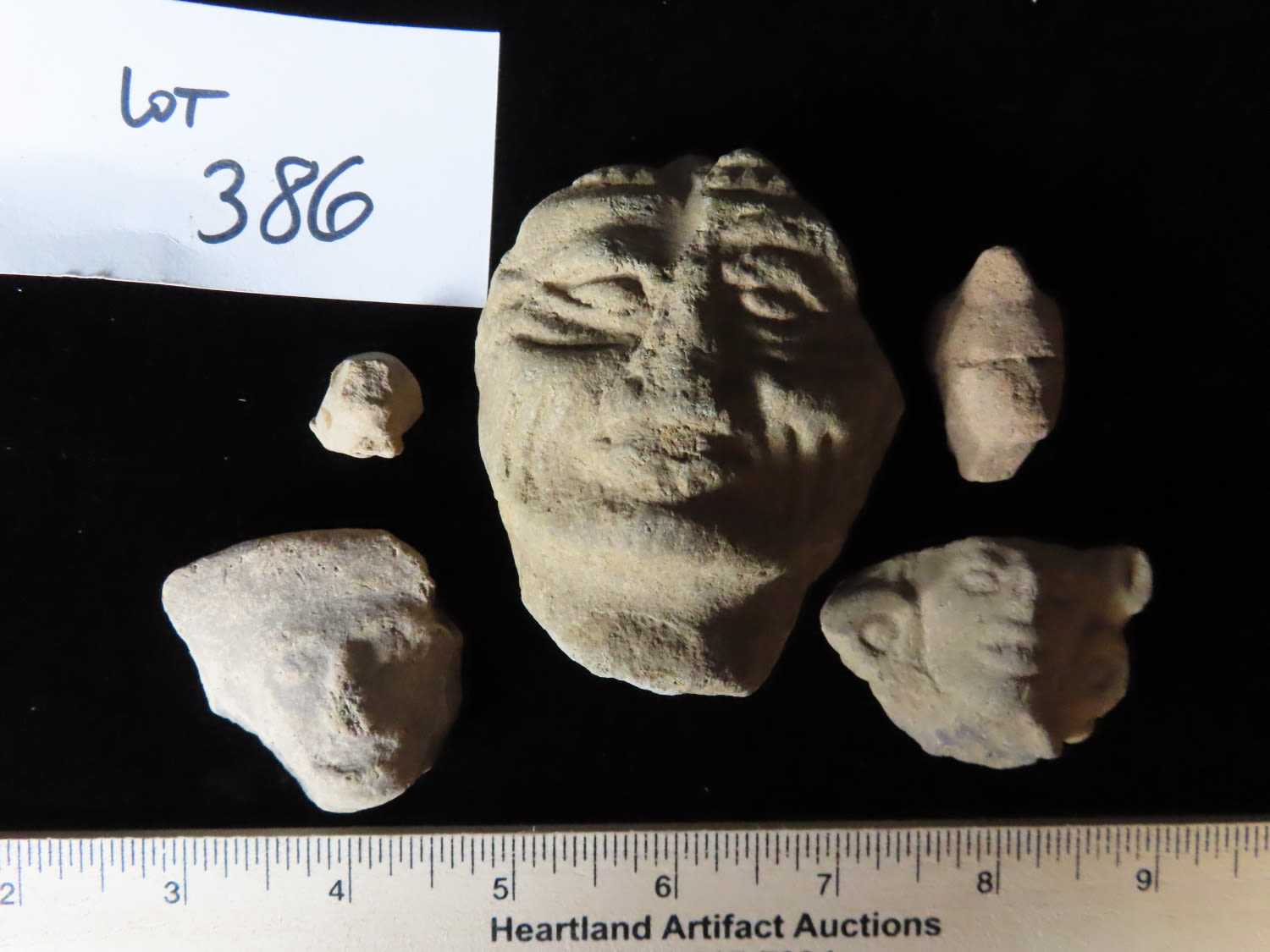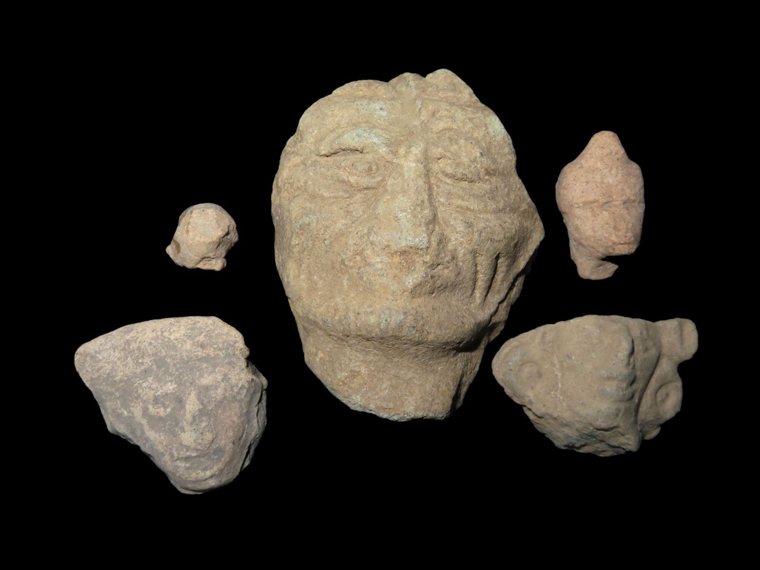 LOT OF 5 PRECOLUMBIAN HUMAN EFFIGY HEADS, NICE DETAILED EXAMPLES, PRE-COLUMBIAN ARTIFACTS FROM MEXICO