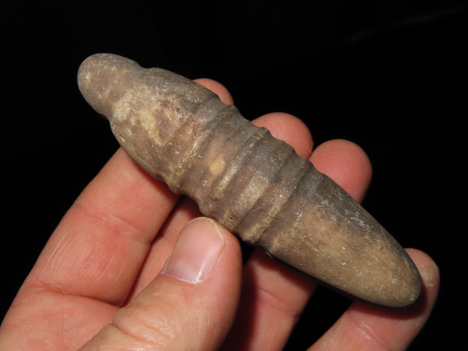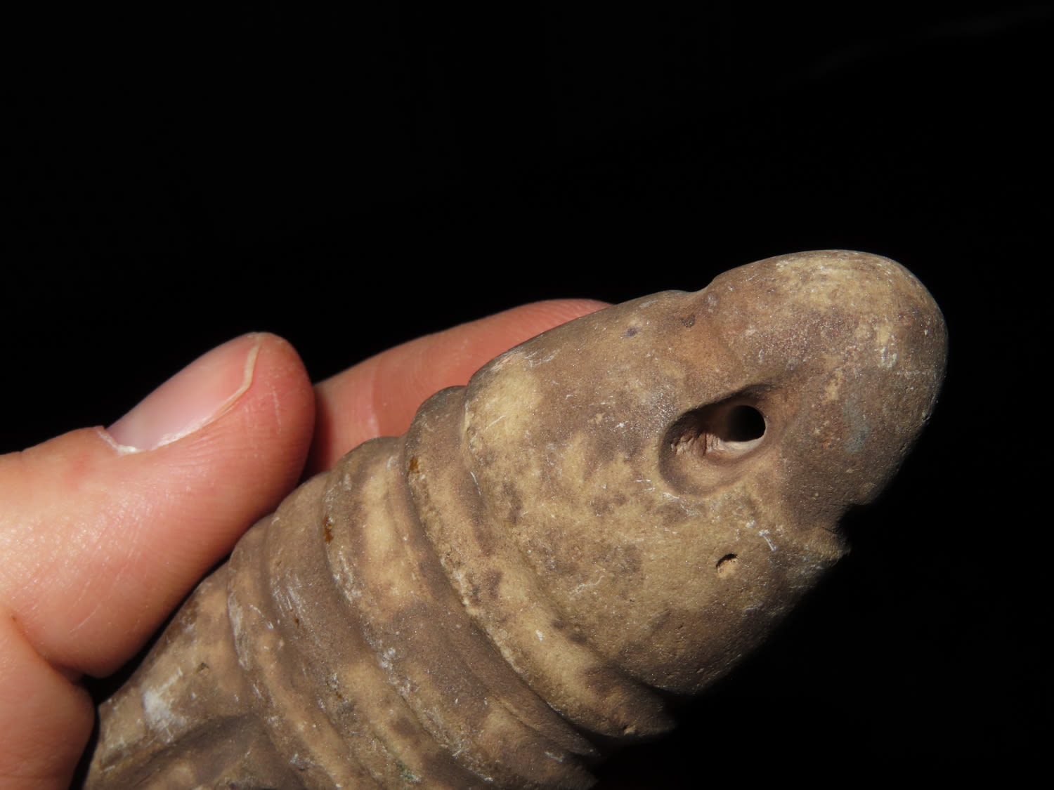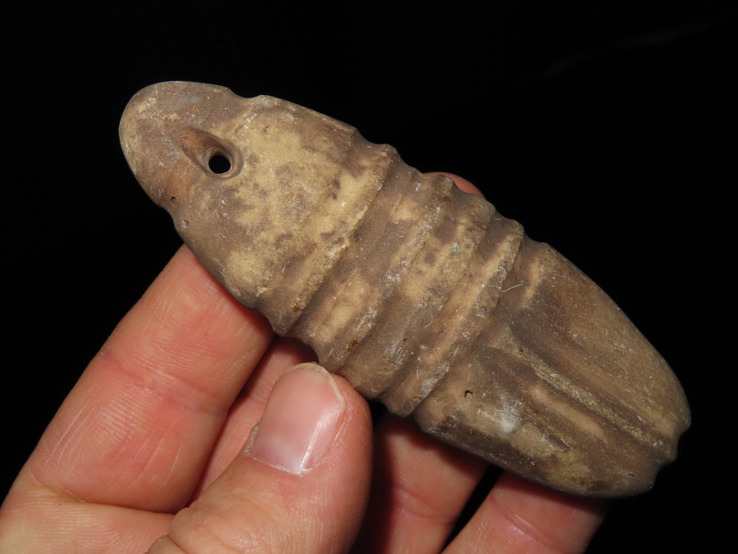 3 1/2″ ENGRAVED EFFIGY STONE PENDANT / PLUMMET FROM MEXICO, INTERESTING PRECOLUMBIAN ARTIFACT, MULTIPL DEEP GROOVES FOR DECORATION