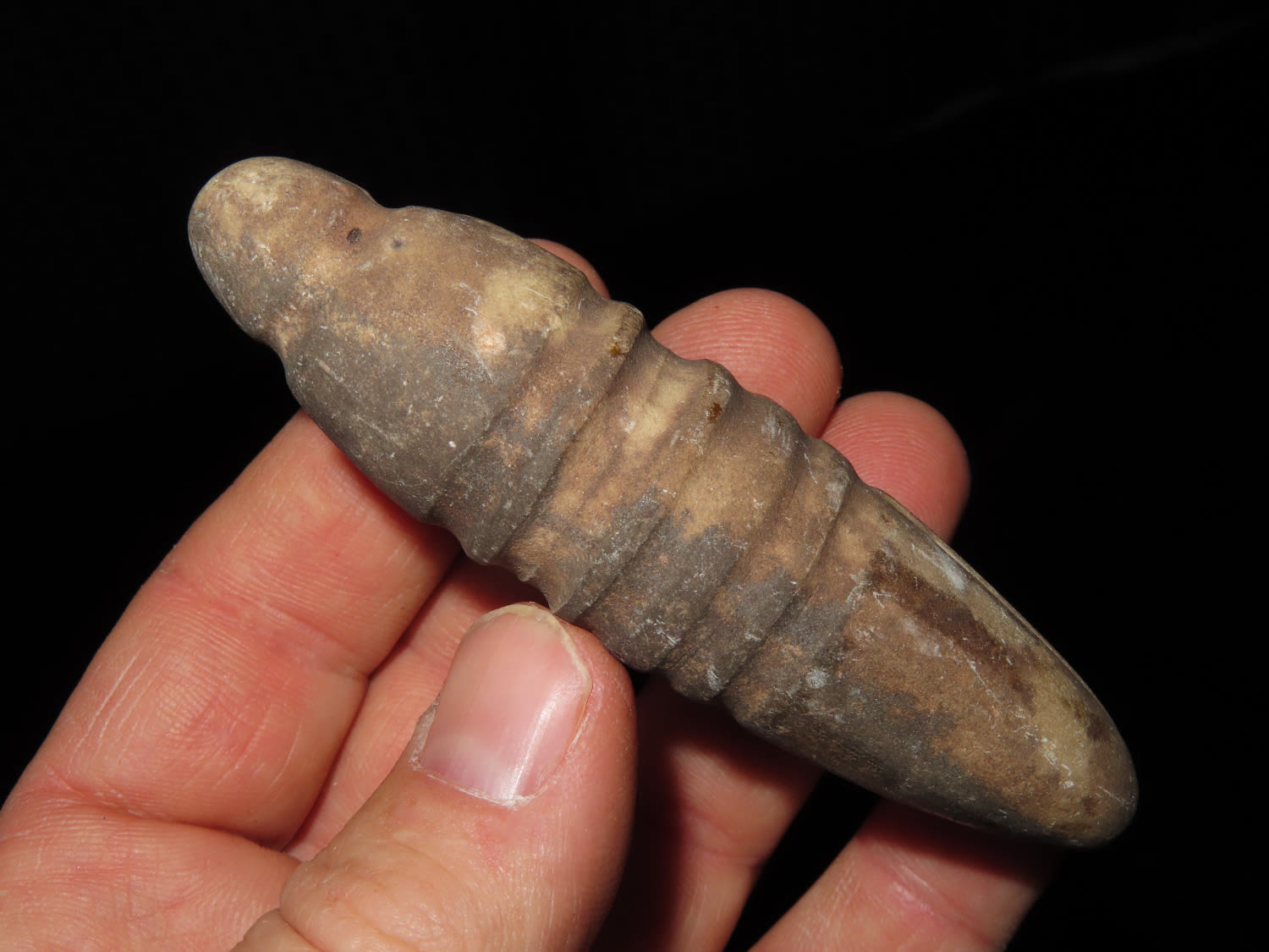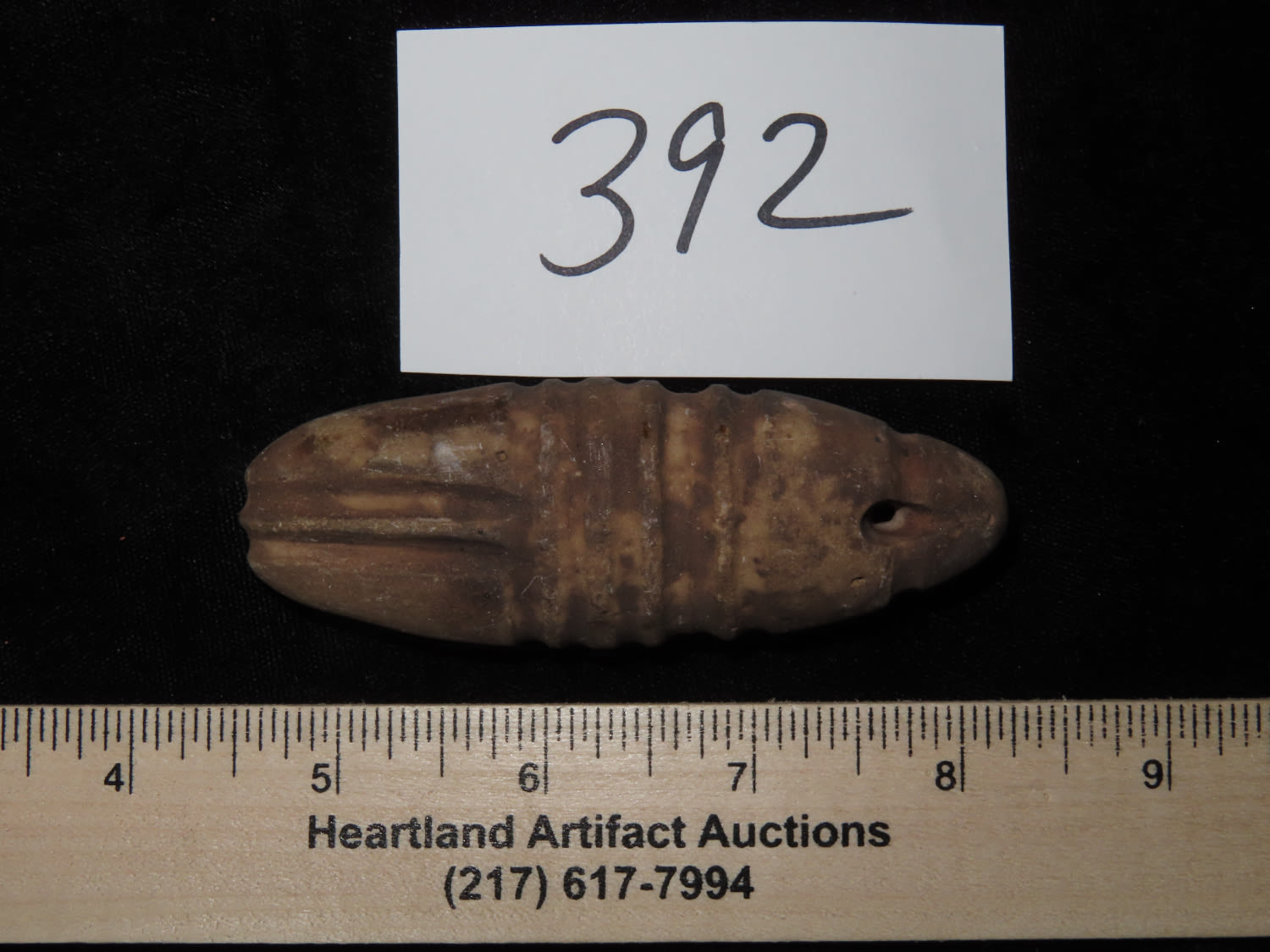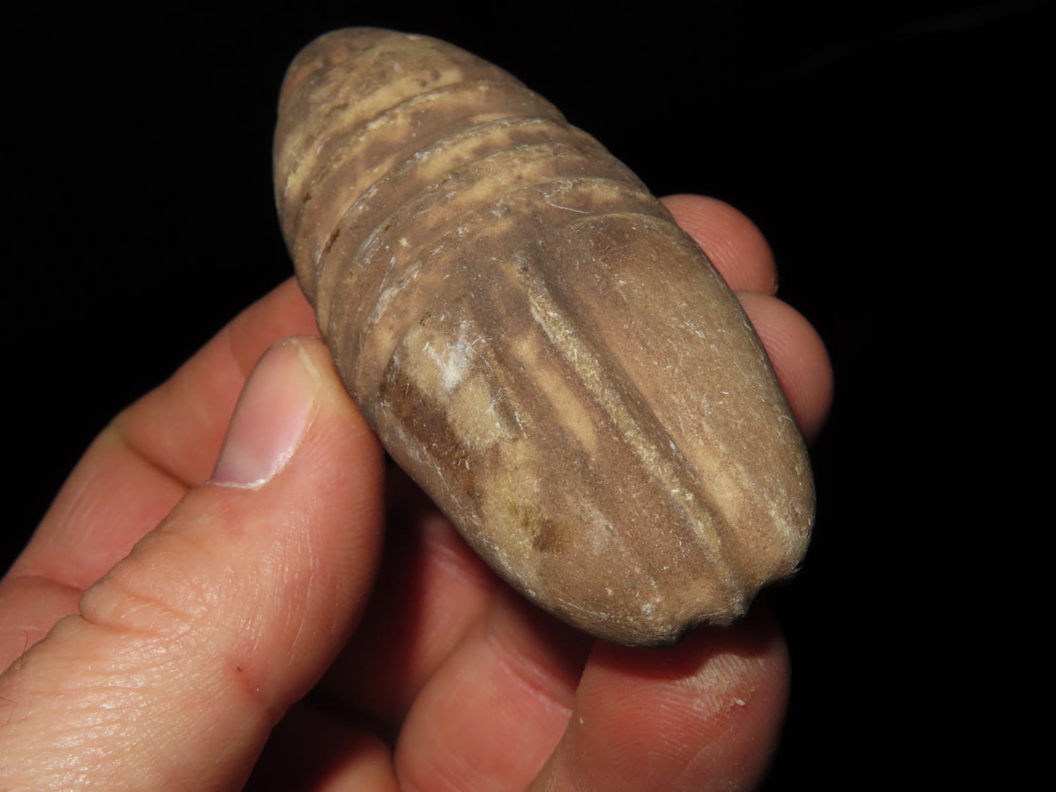 3 1/2″ ENGRAVED EFFIGY STONE PENDANT / PLUMMET FROM MEXICO, INTERESTING PRECOLUMBIAN ARTIFACT, MULTIPL DEEP GROOVES FOR DECORATION