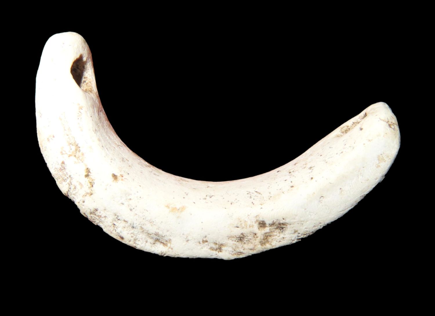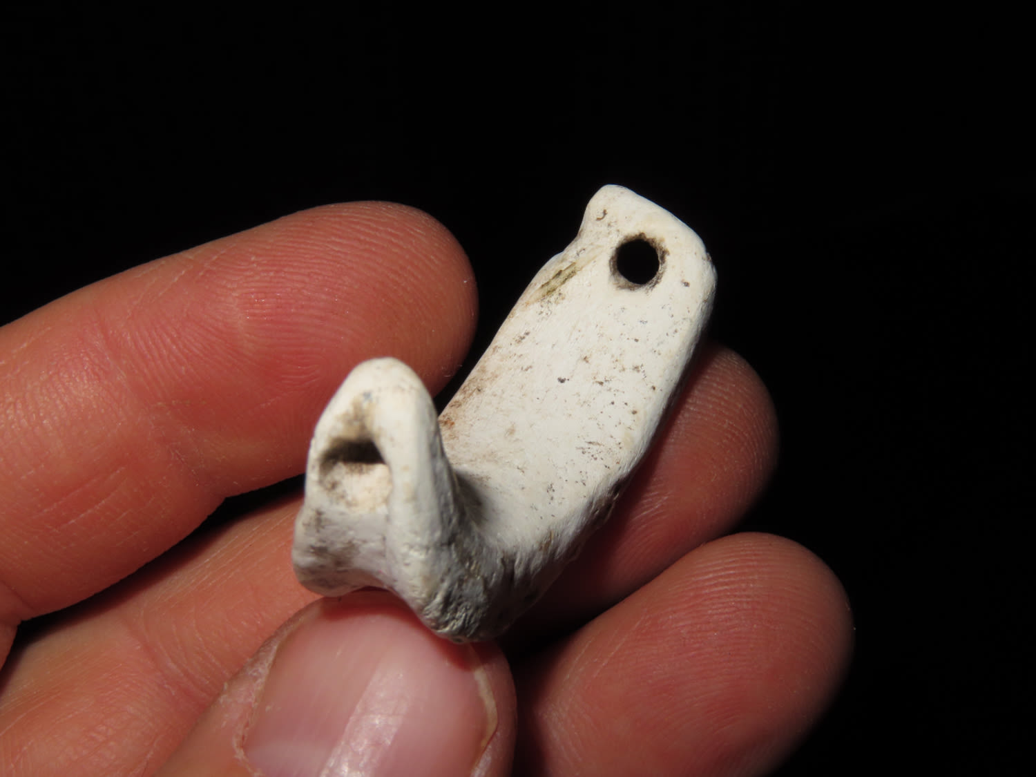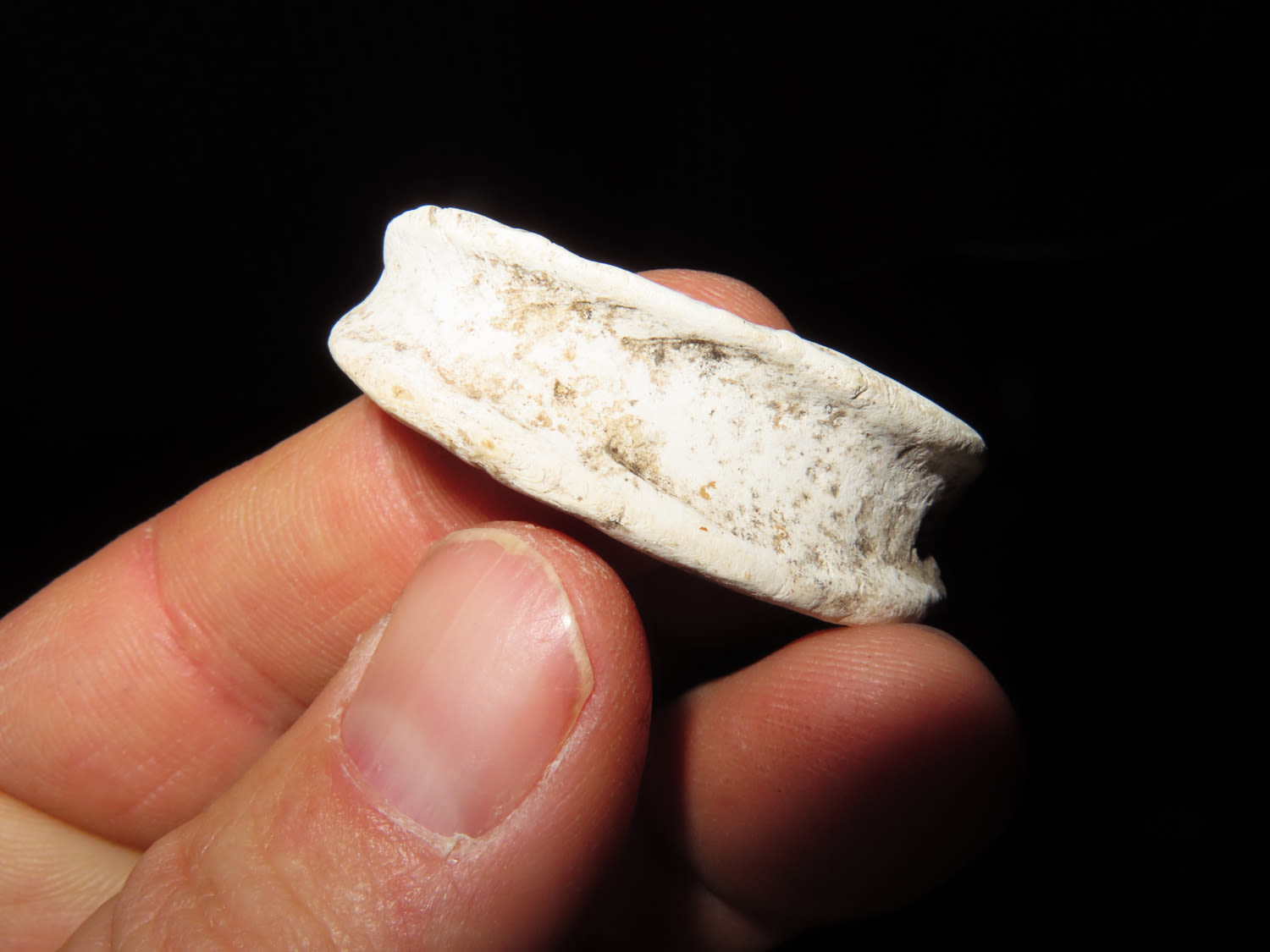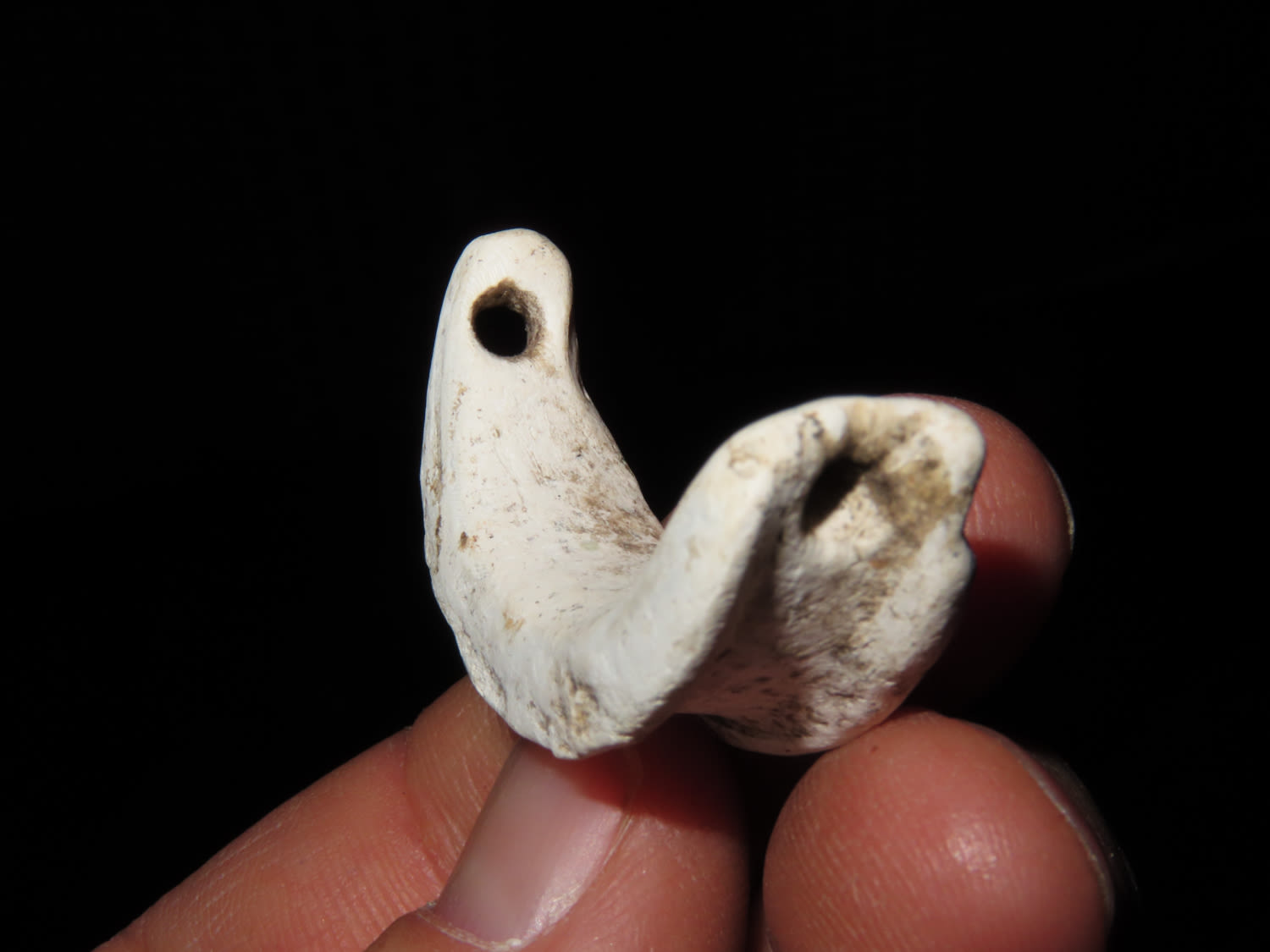 1 3/4″ COLIMA ATLATL THUMB REST FROM MEXICO, PRECOLUMBIAN DRILLED SHELL ARTIFACT, EX DR. HARNER COLLECTION, PENDANT BEAD