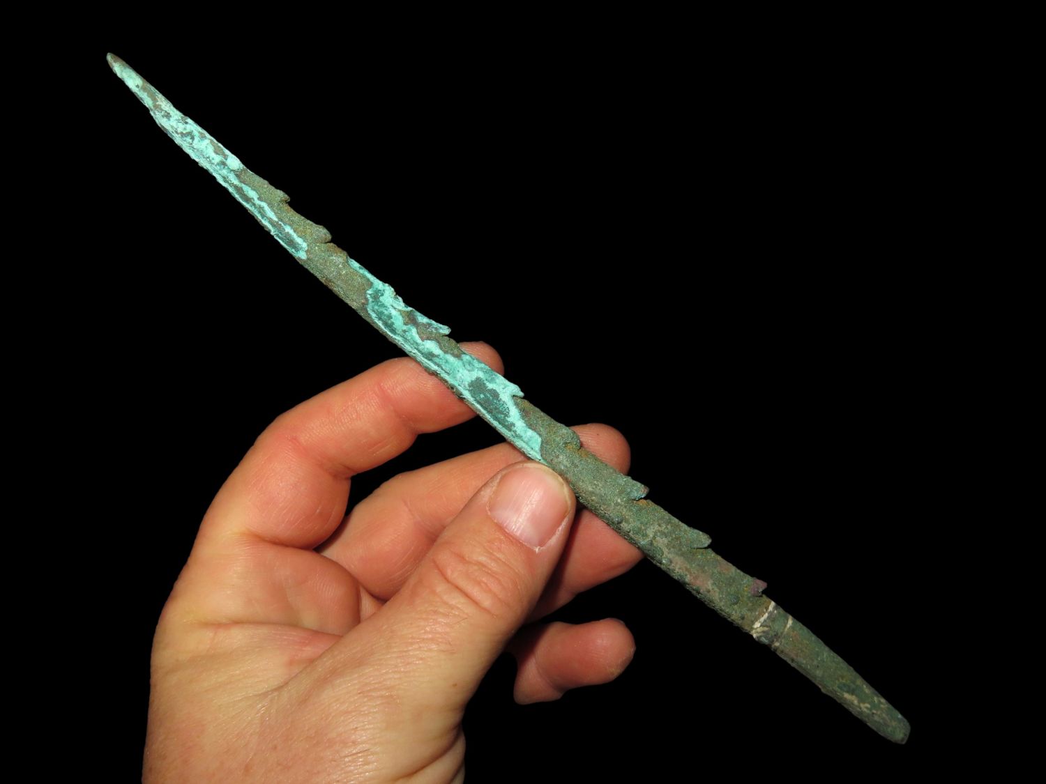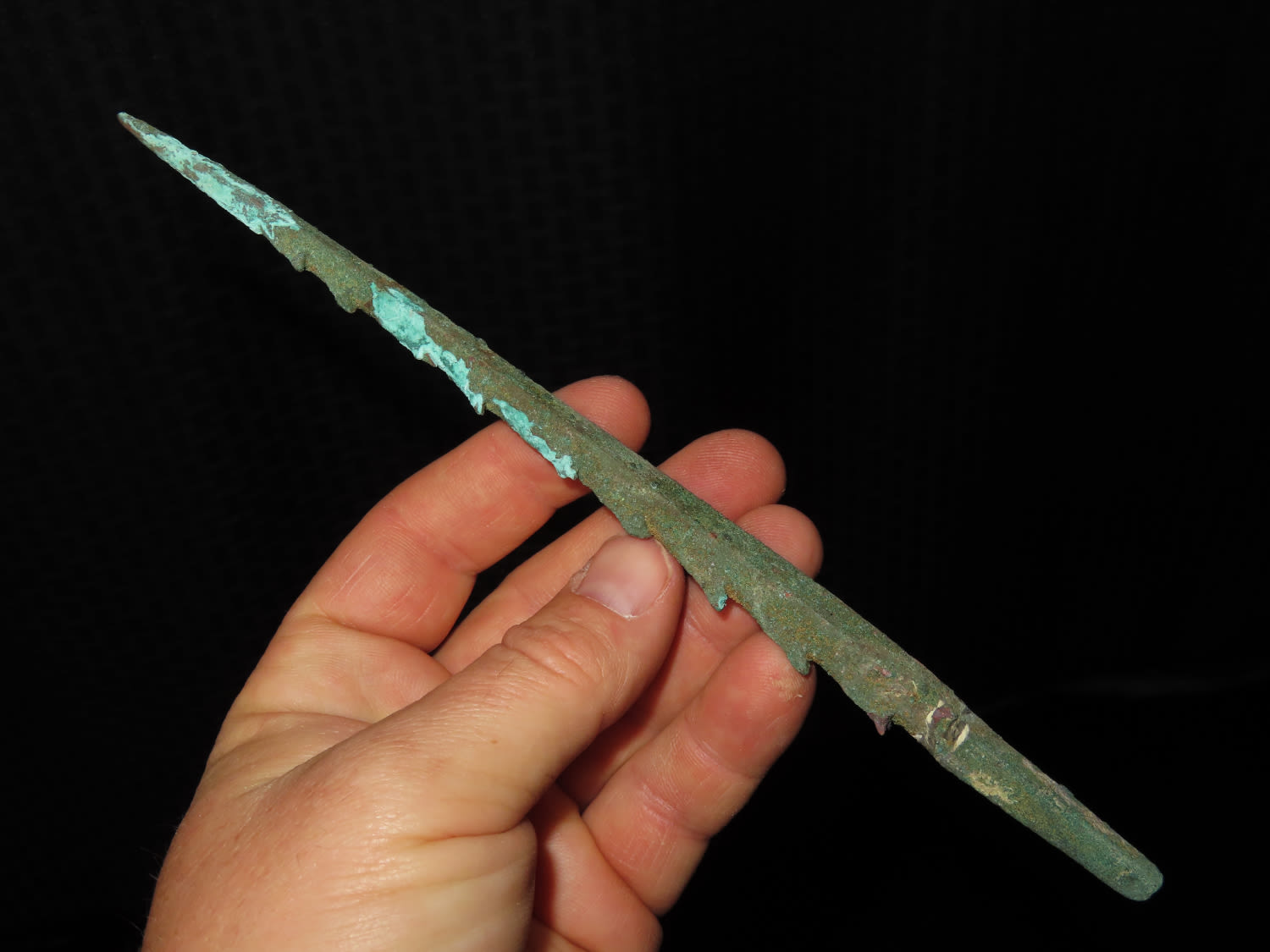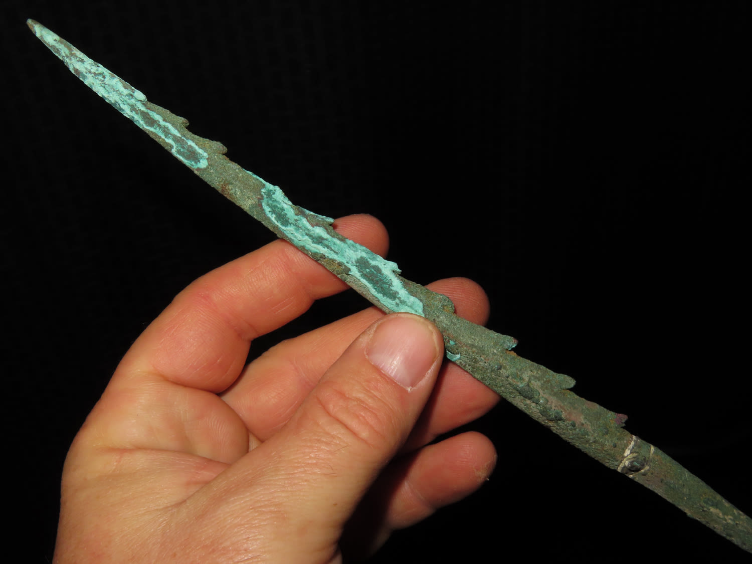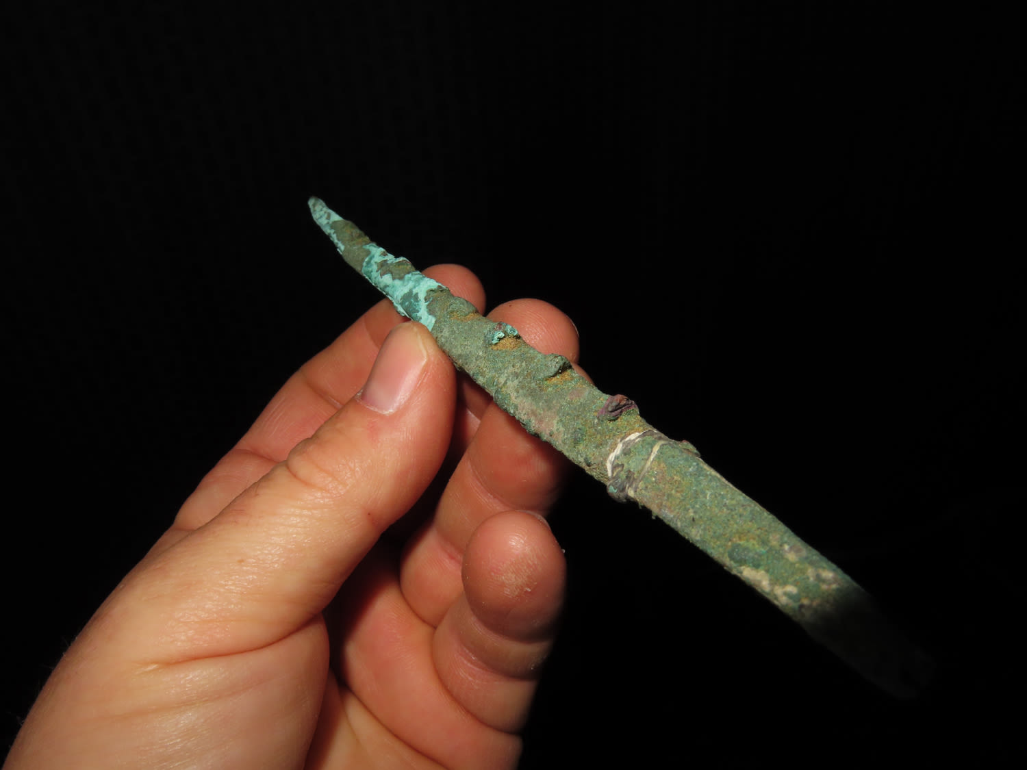 8 5/8″ MOCHE COPPER HARPOON FROM PERU, CIRCA 600-800AD, PRECOLUMBIAN FISHING TOOL/ WEAPON WITH GREAT PATINATION