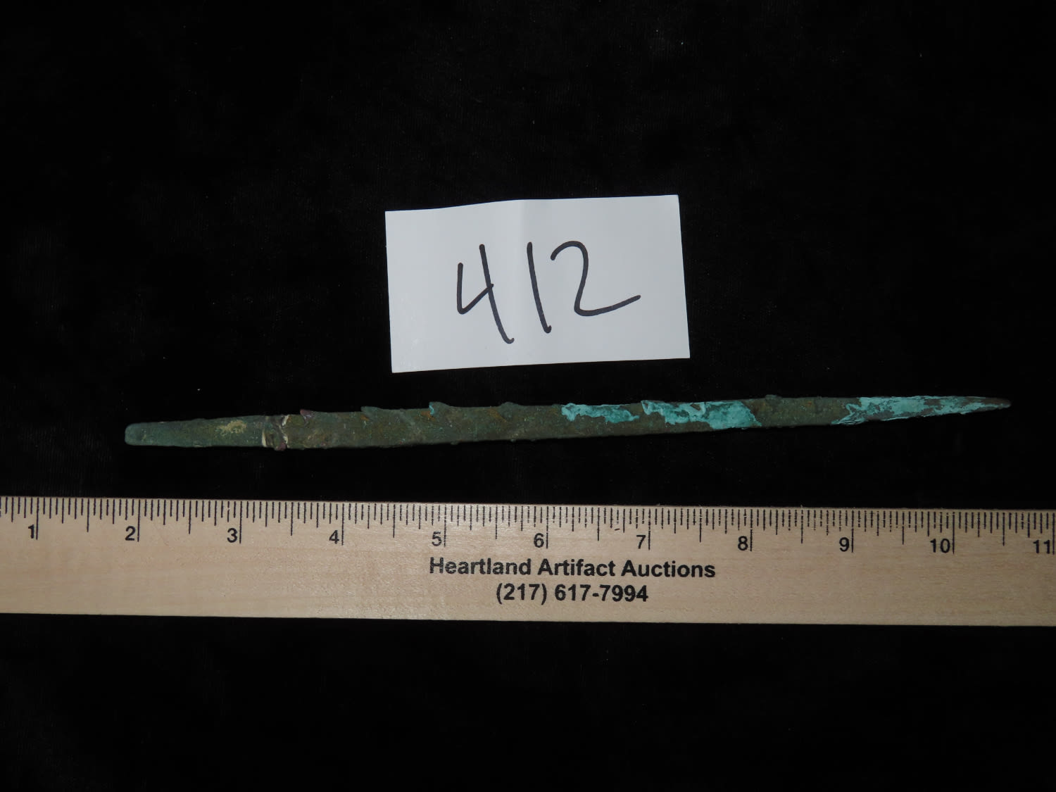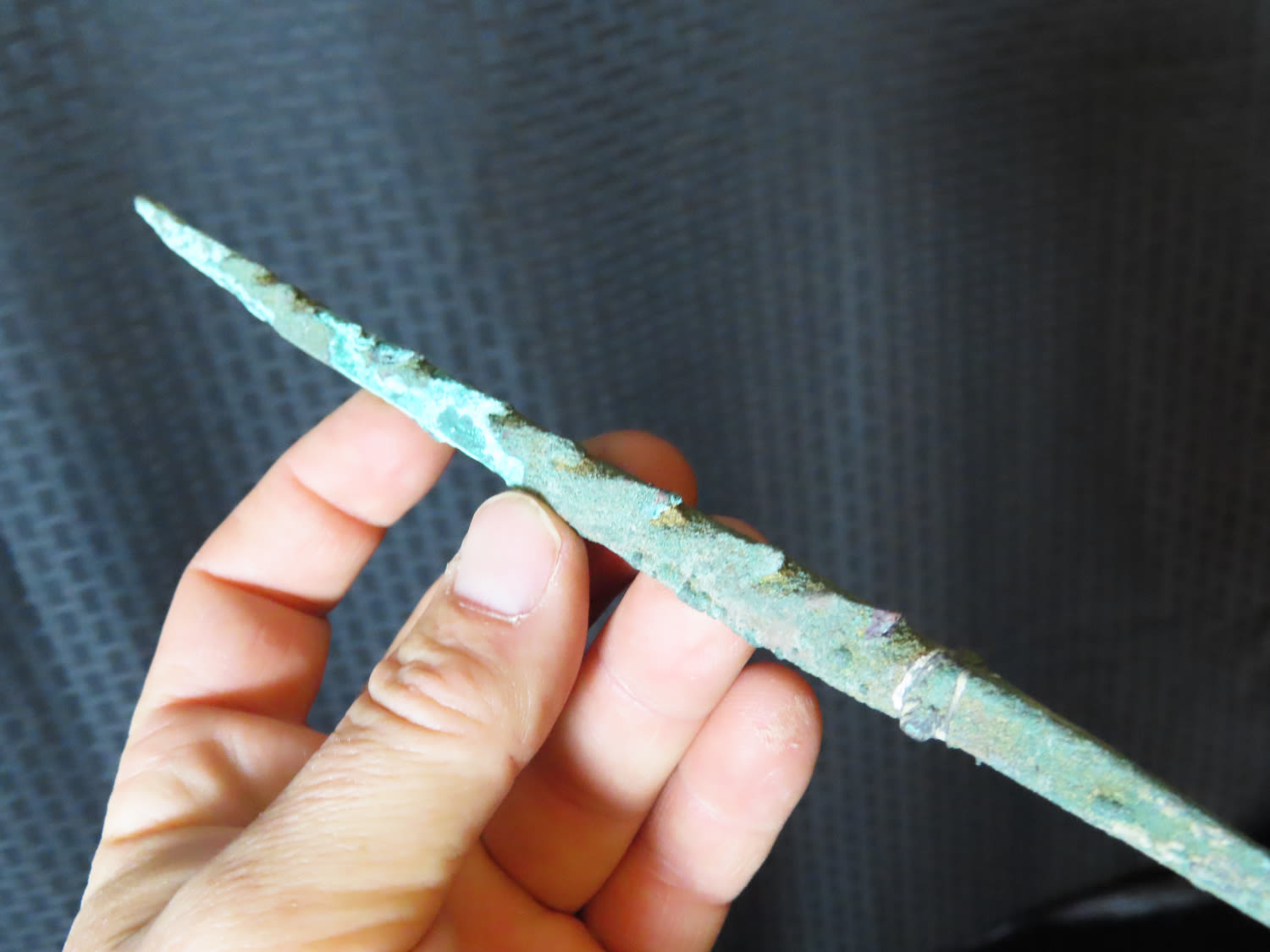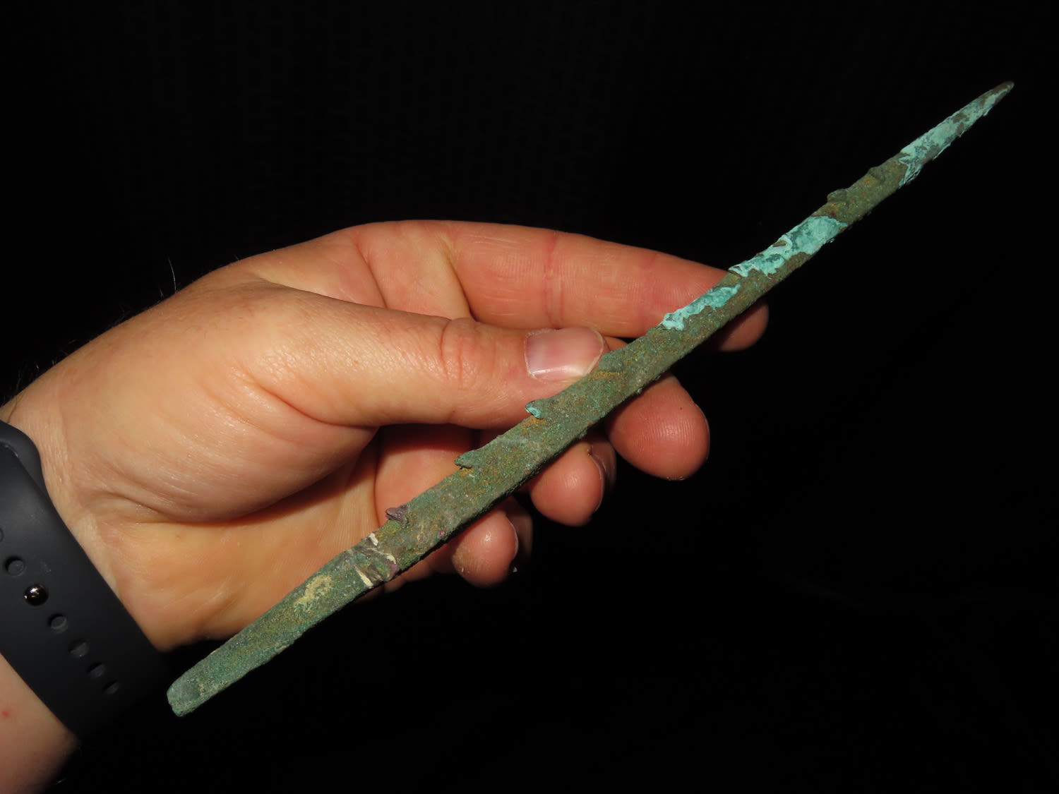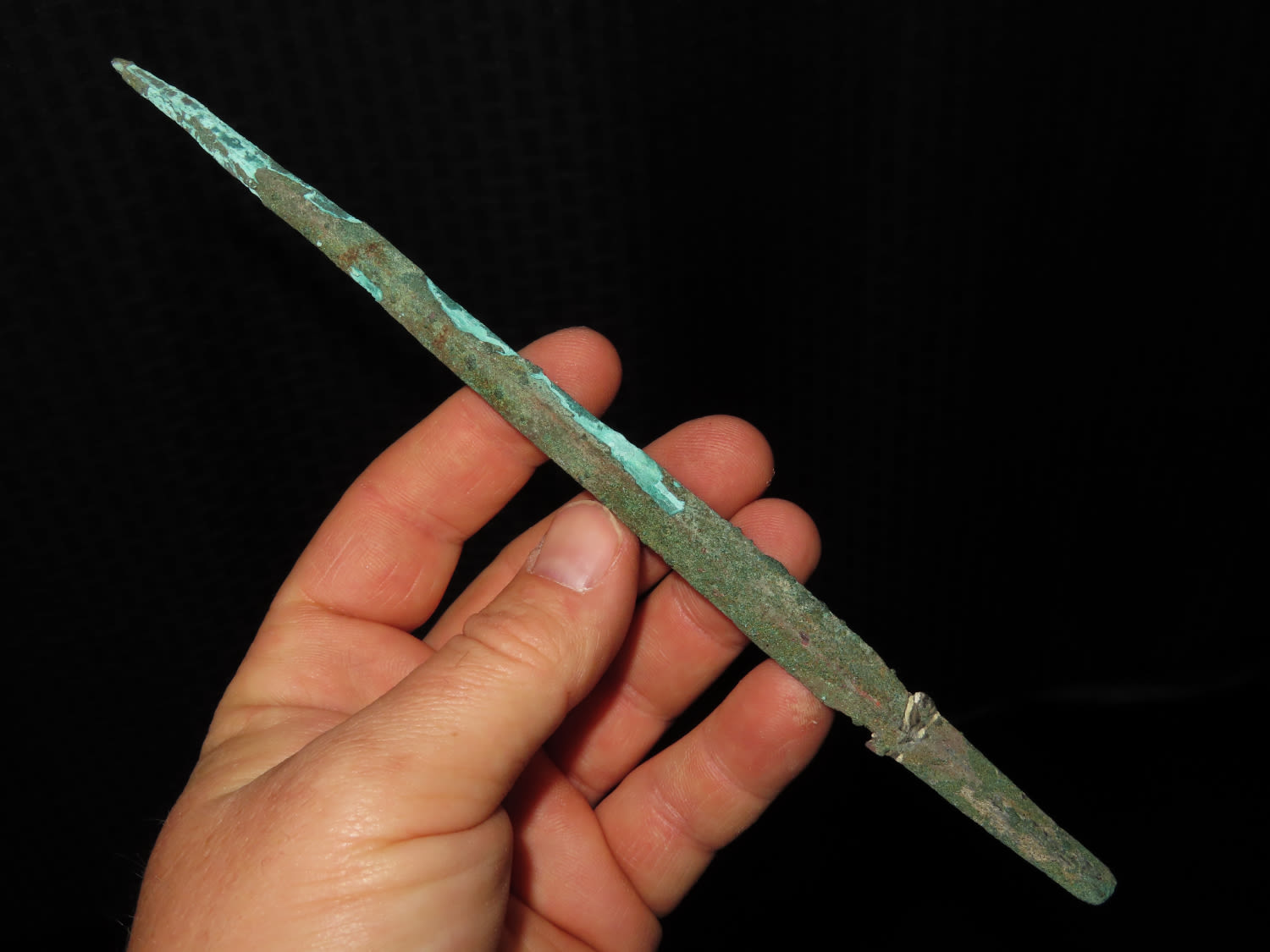 8 5/8″ MOCHE COPPER HARPOON FROM PERU, CIRCA 600-800AD, PRECOLUMBIAN FISHING TOOL/ WEAPON WITH GREAT PATINATION