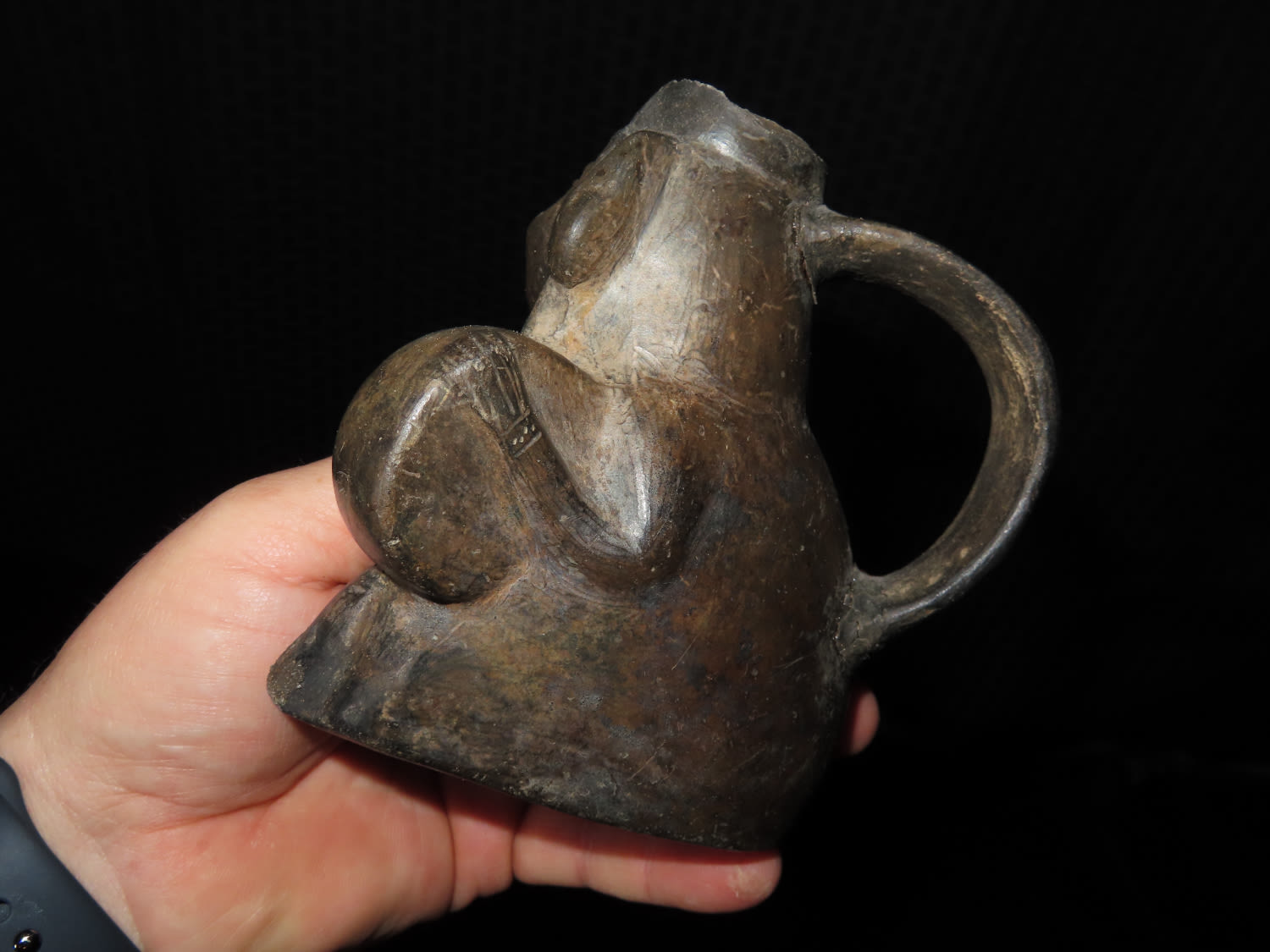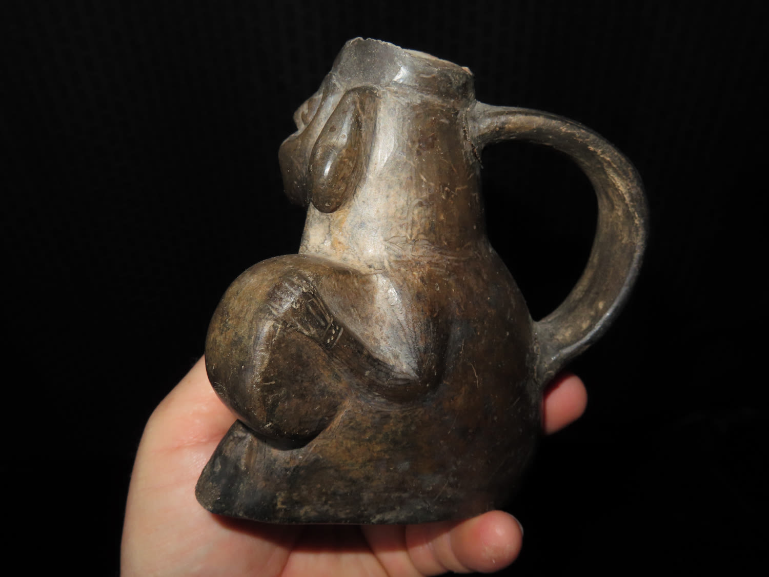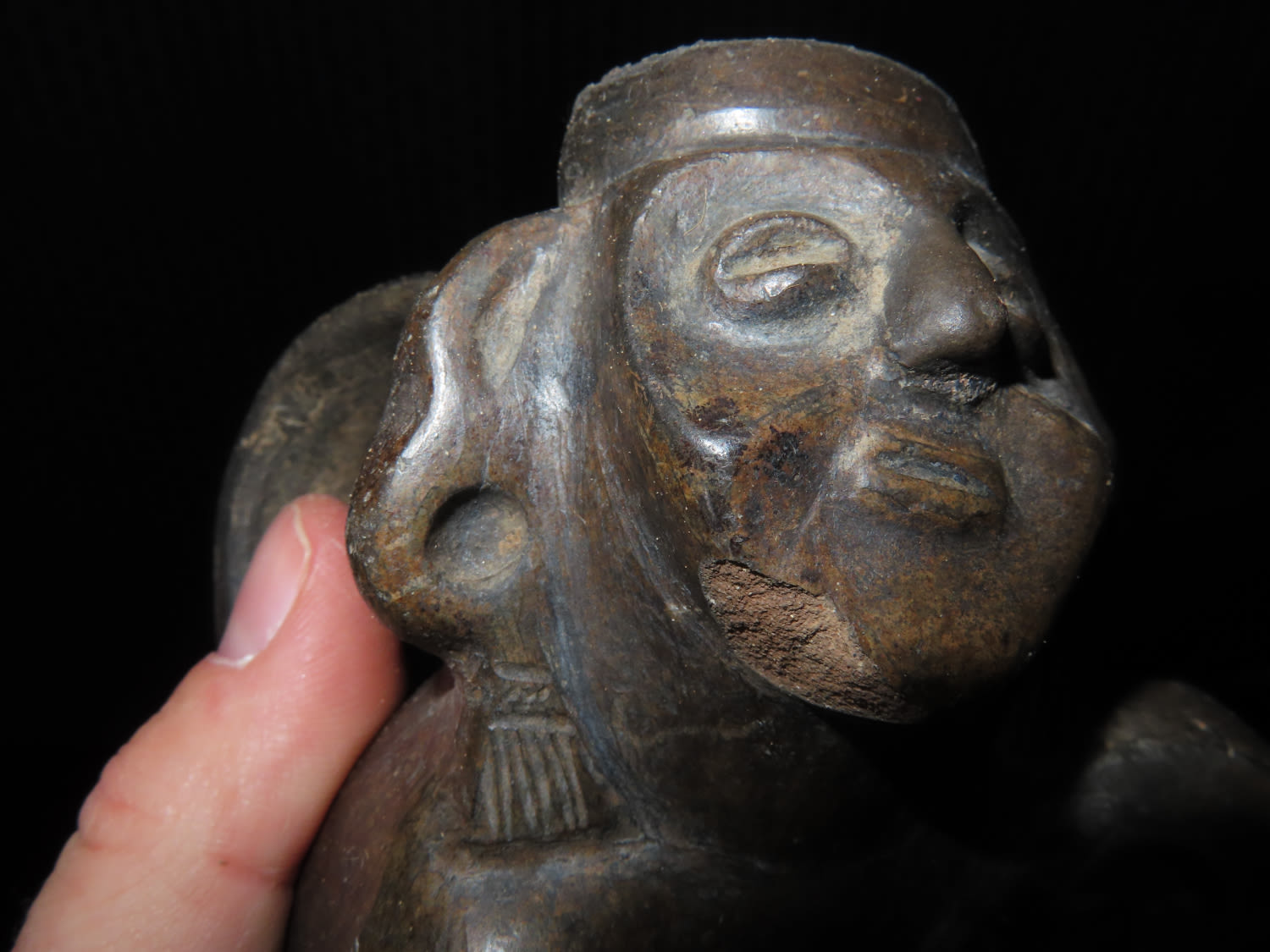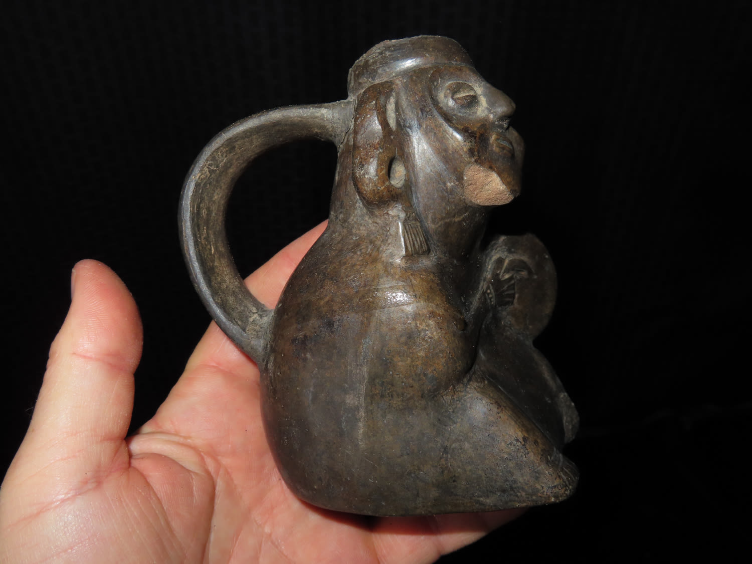 5″ TALL MOCHE HUMAN EFFIGY POTTERY VESSEL, PRECOLUMBIAN, GREAT DETAIL & DESIGN WITH SOME DAMAGE AS SEEN