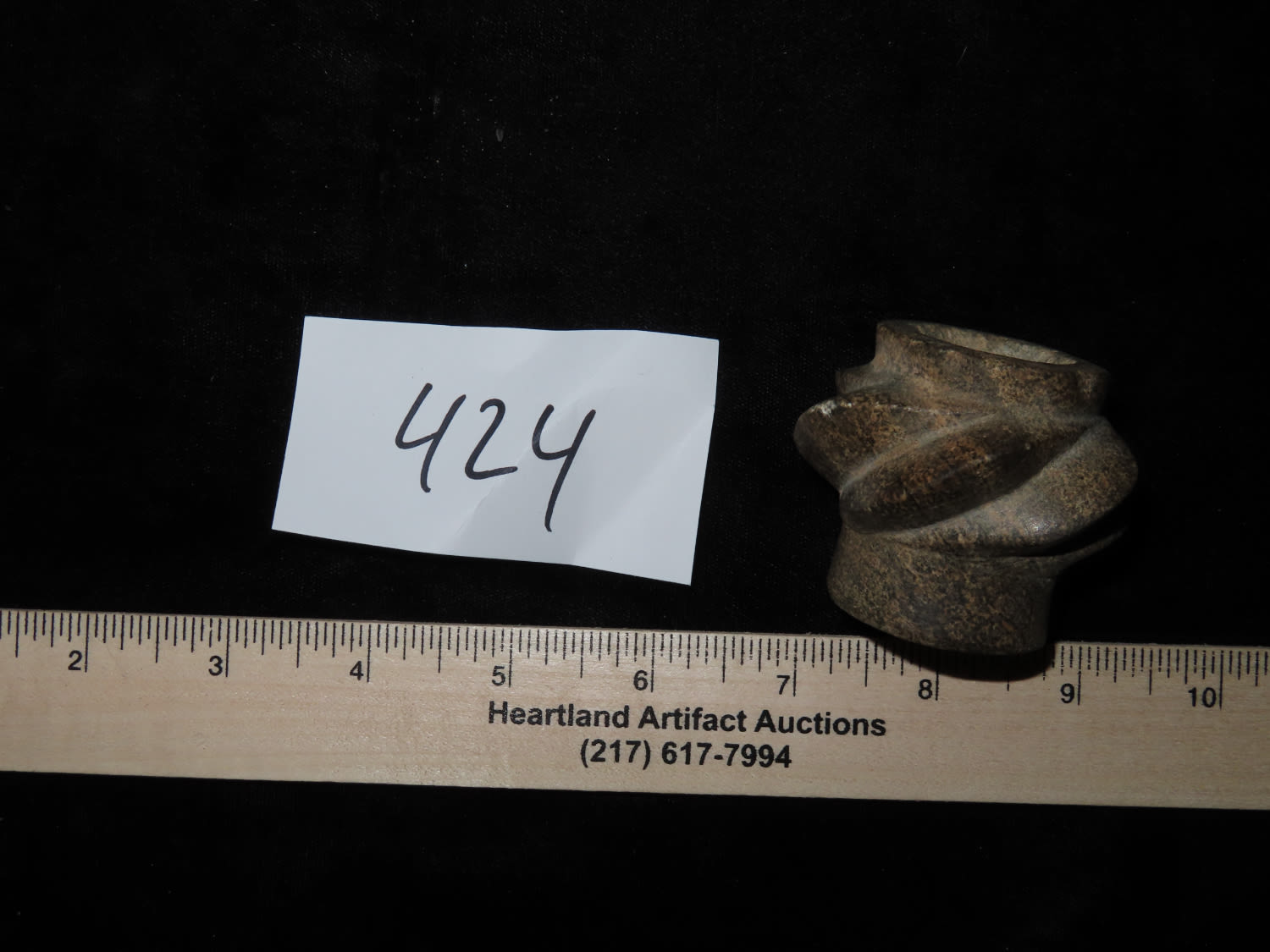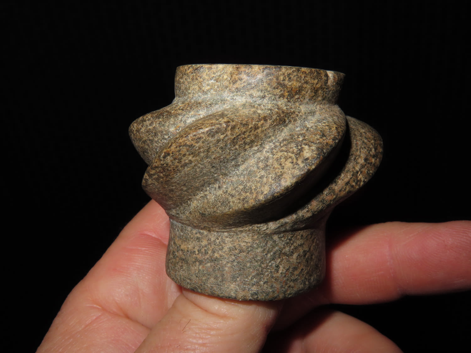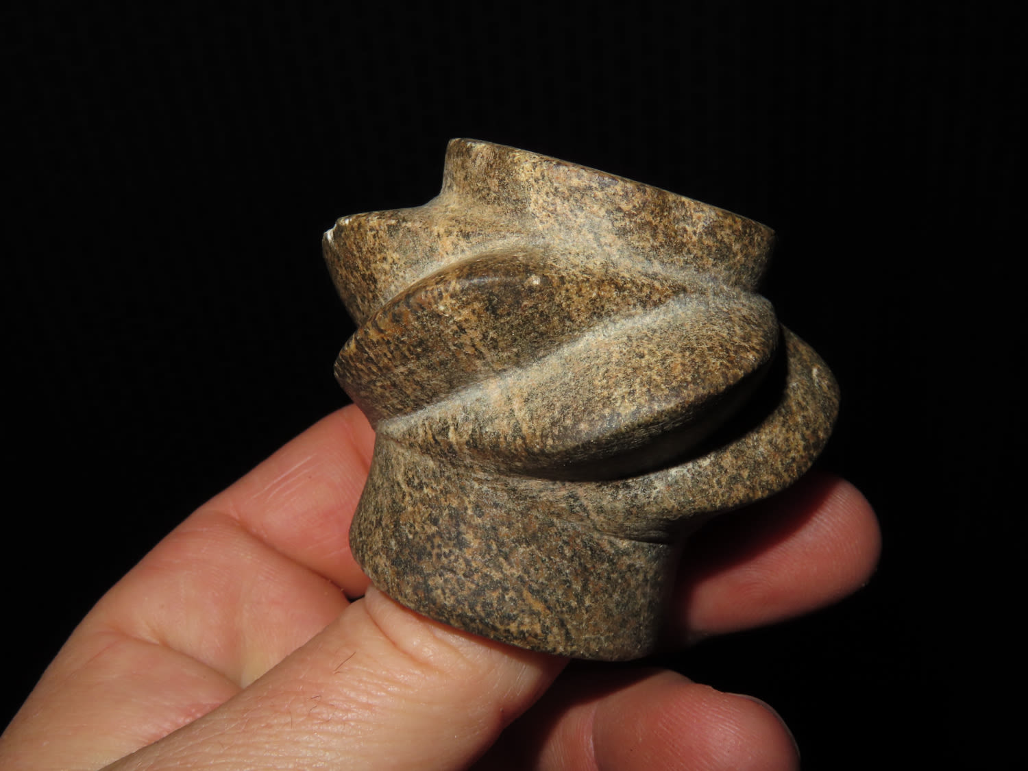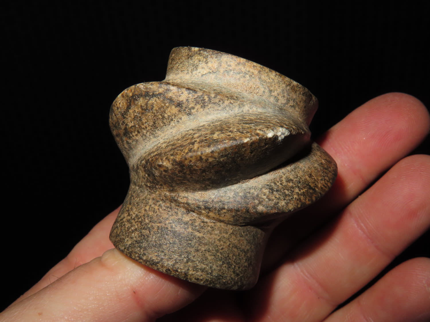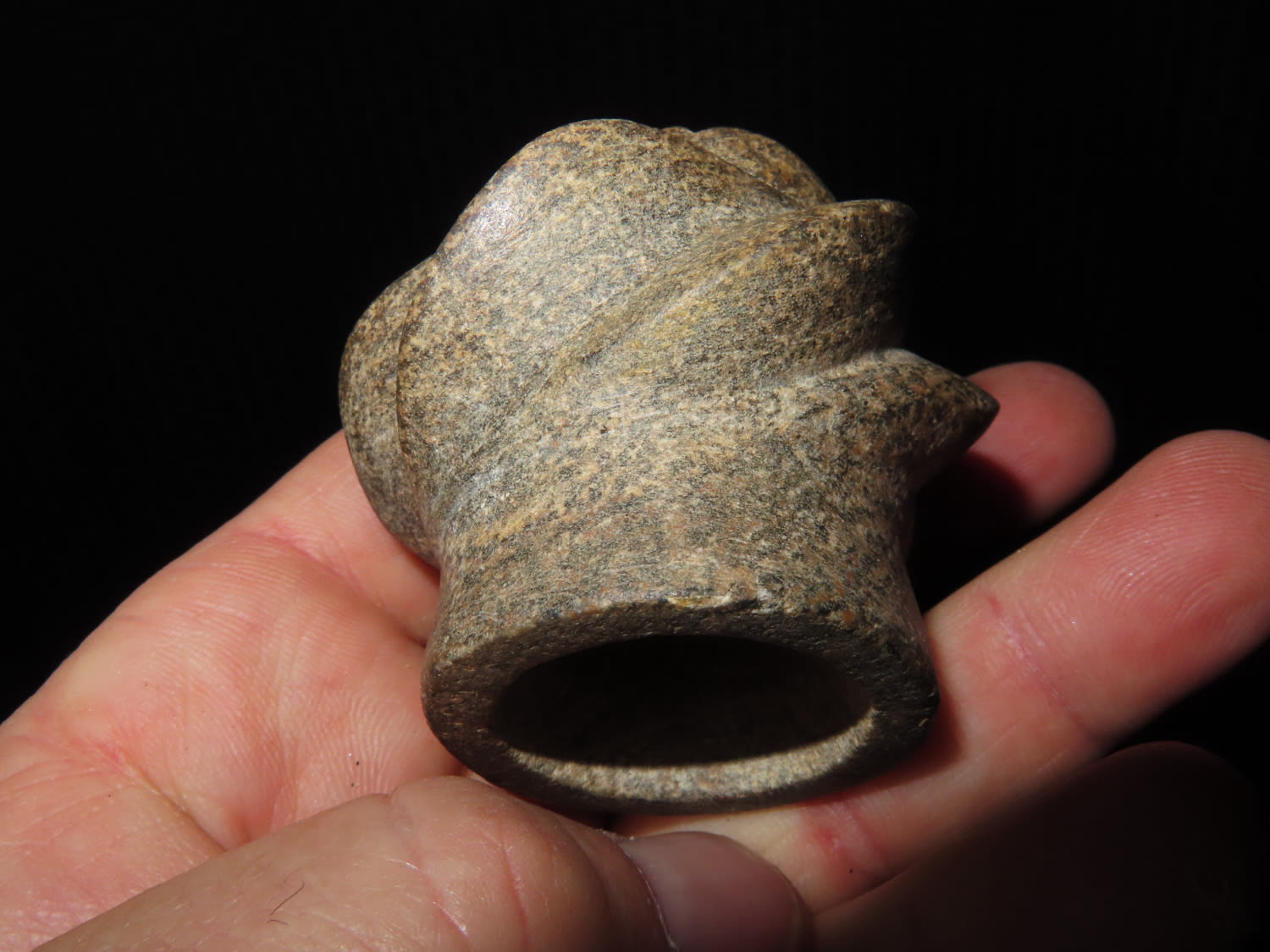 PRECOLUMBIAN STONE MACE HEAD. GREAT DESING & NICE POLISH, 1 7/8″ X 2 1/4″