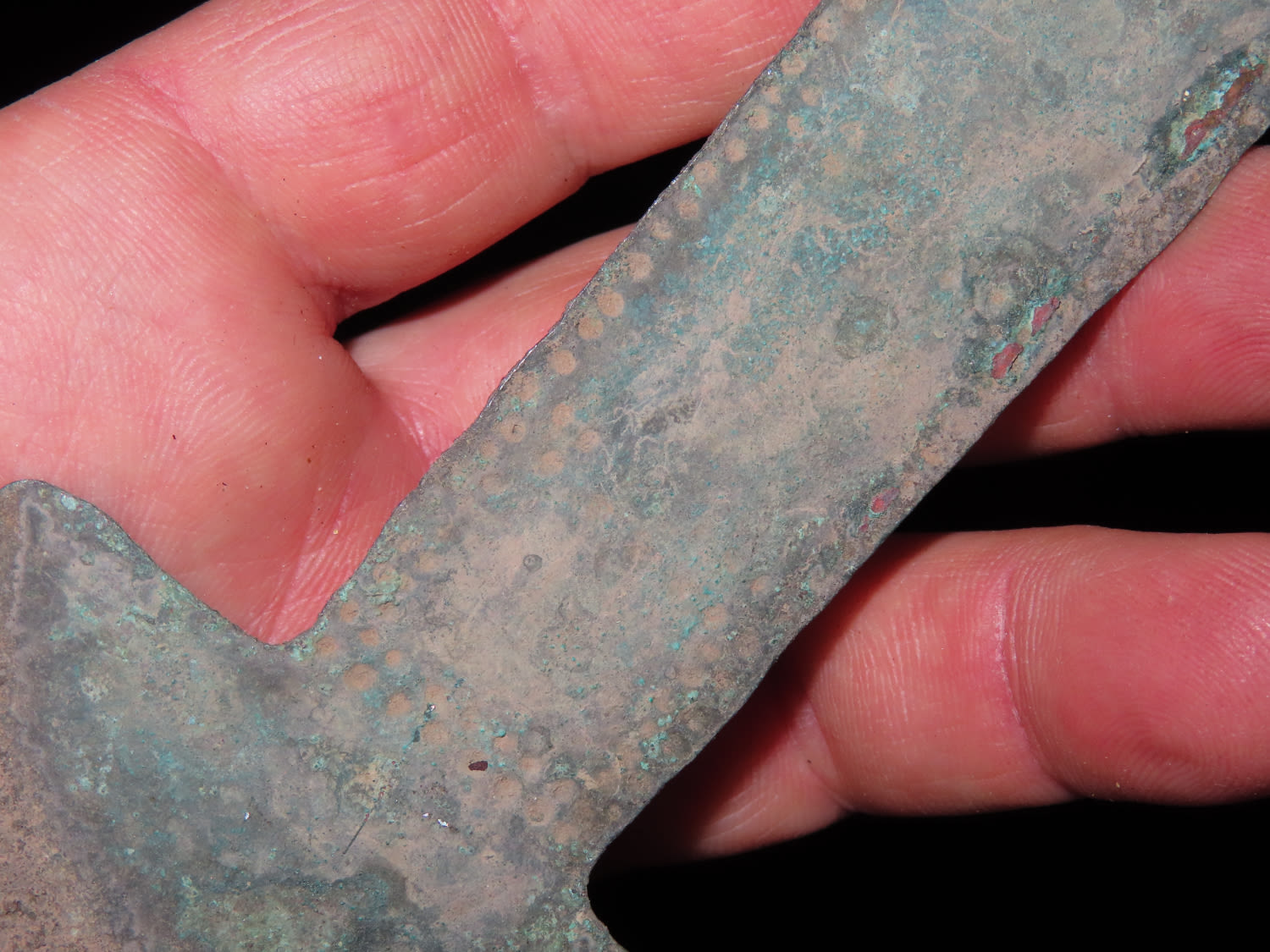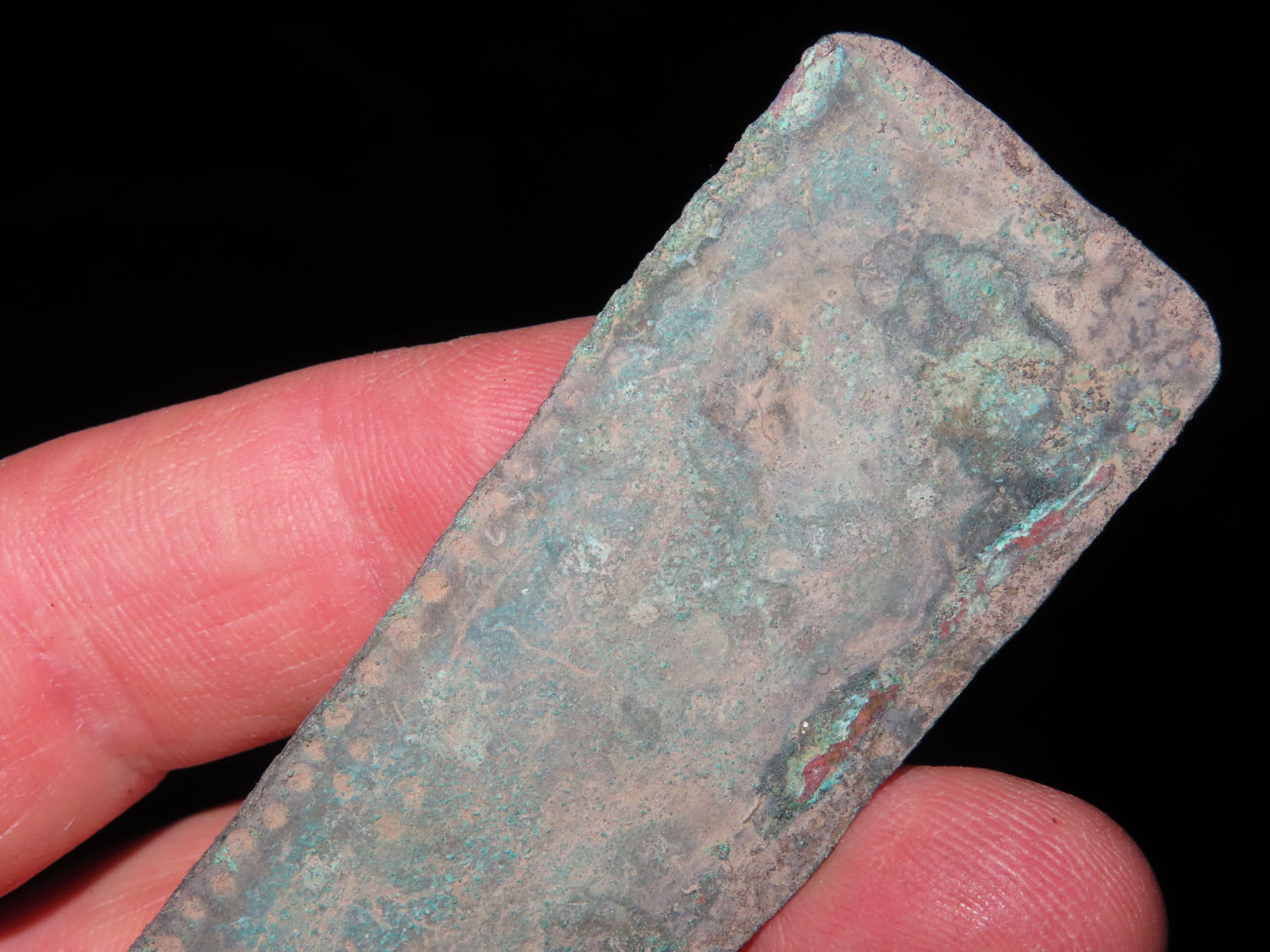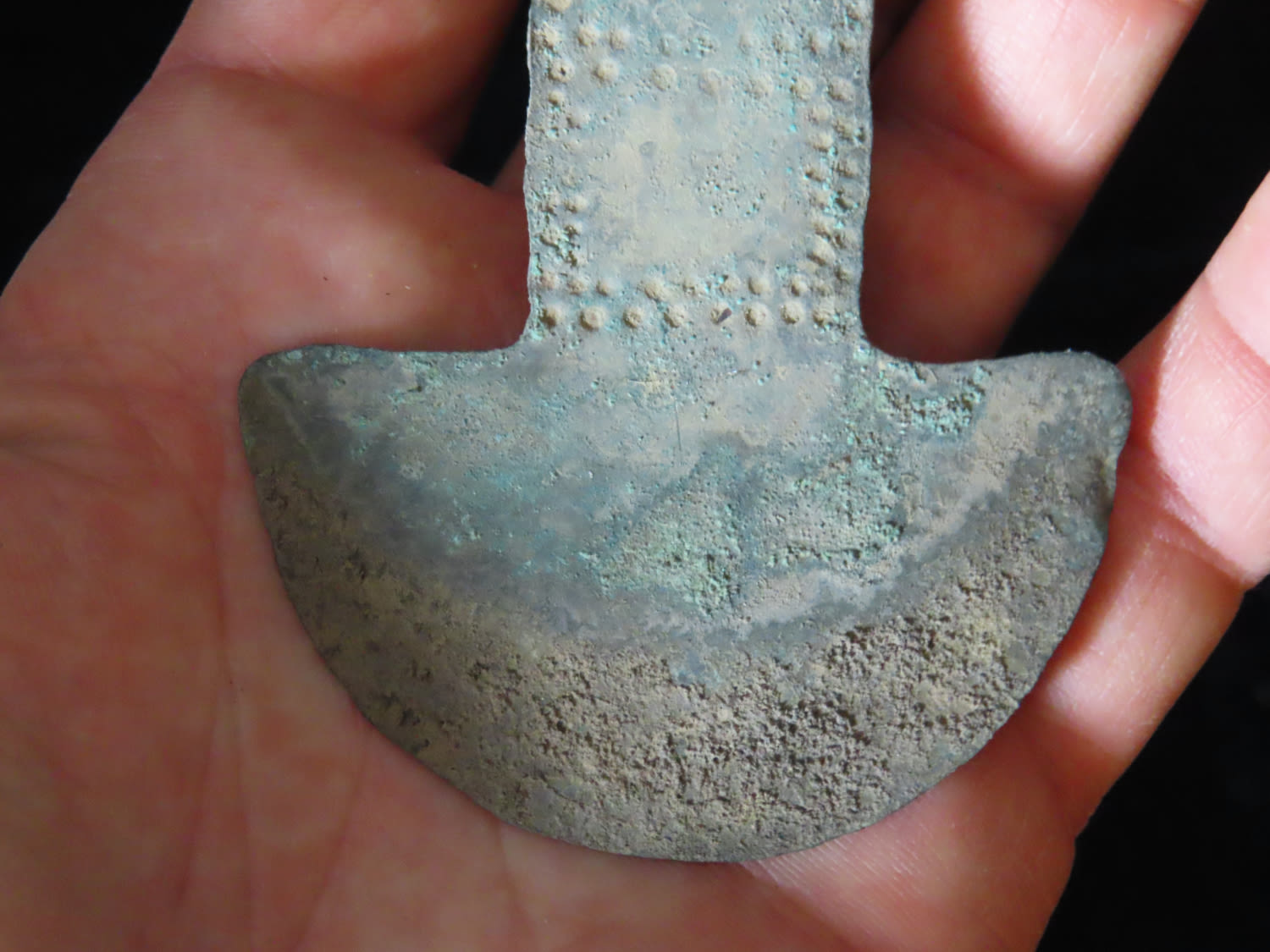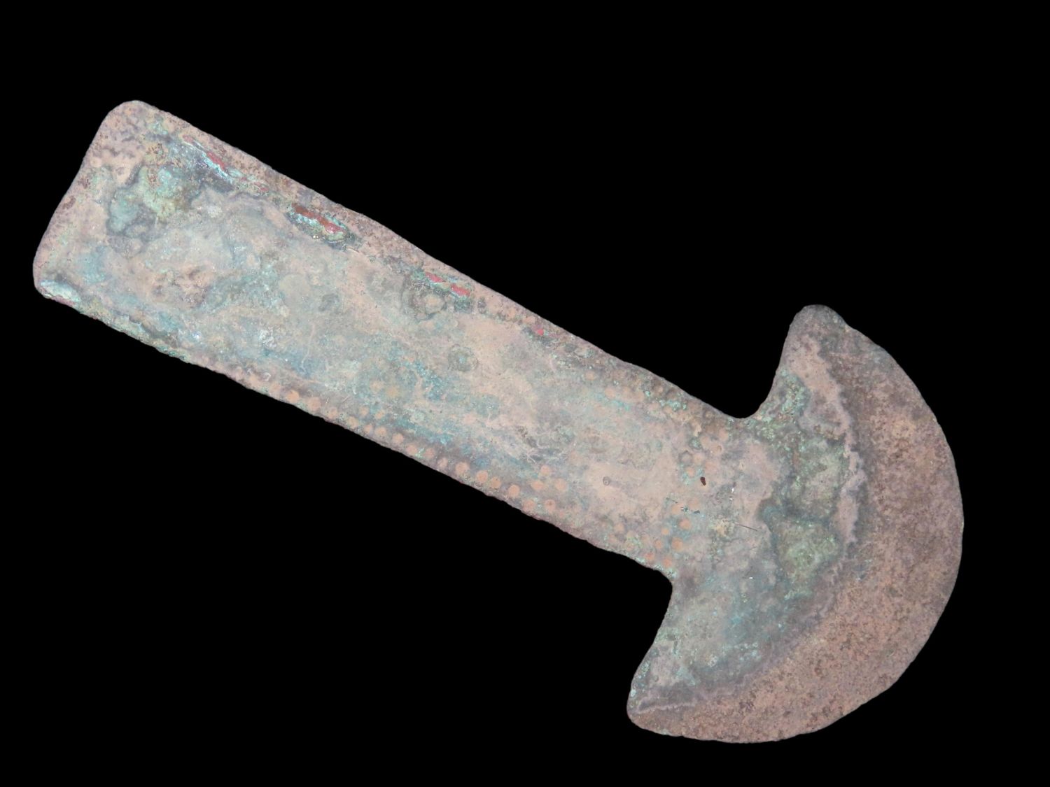 5 1/4″ COPPER TUMI KNIFE, MEXICO, HAS 100’S OF TINY EMBOSSED RAISED NODES AROUND THE PERIMETER, RARE FEATURE FOR THESE PRECOLUMBIAN RELICS