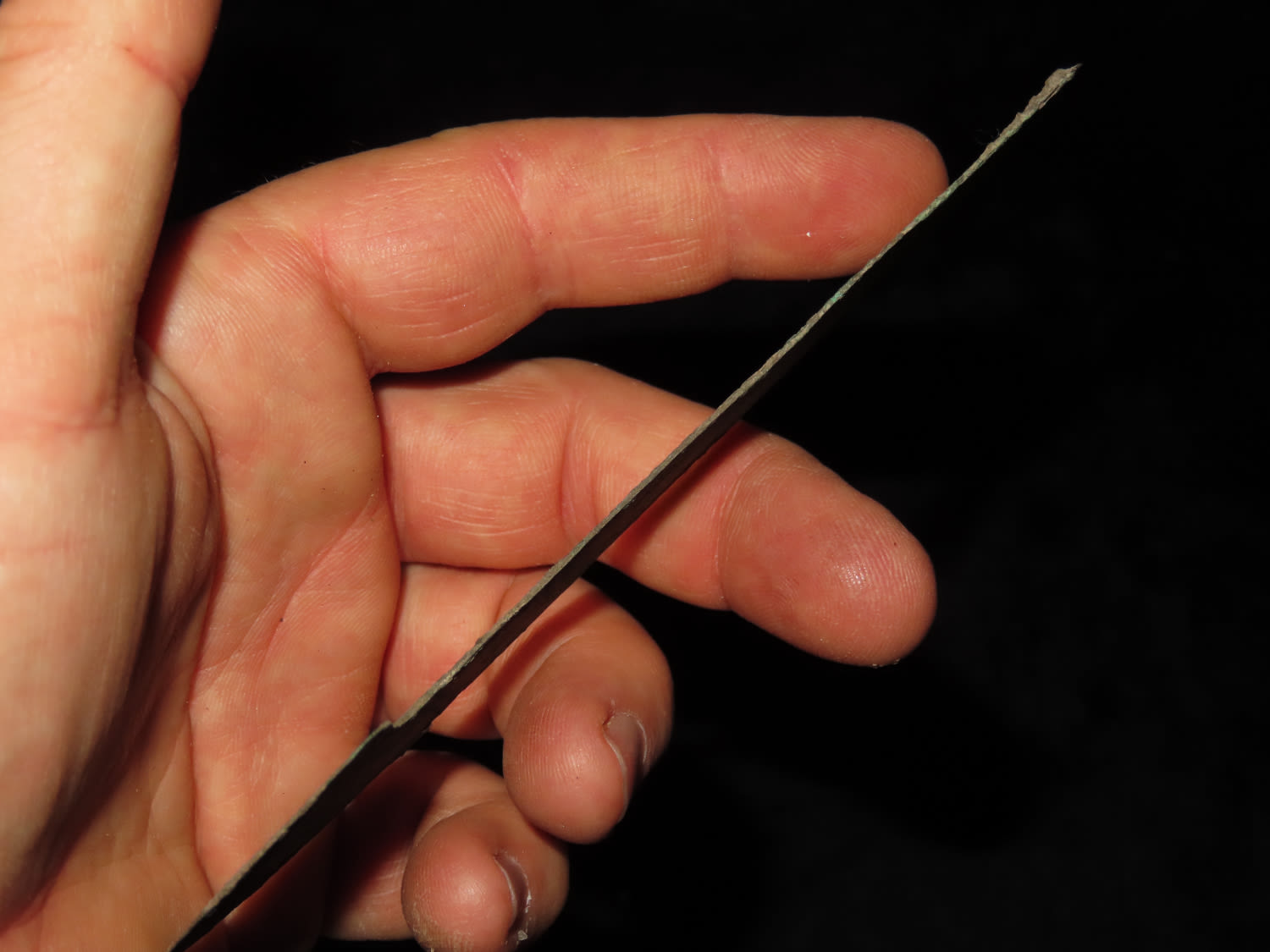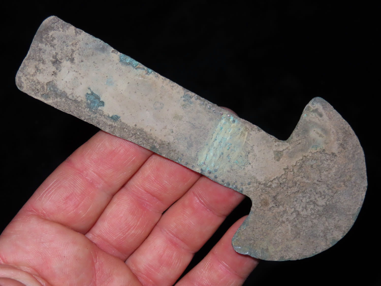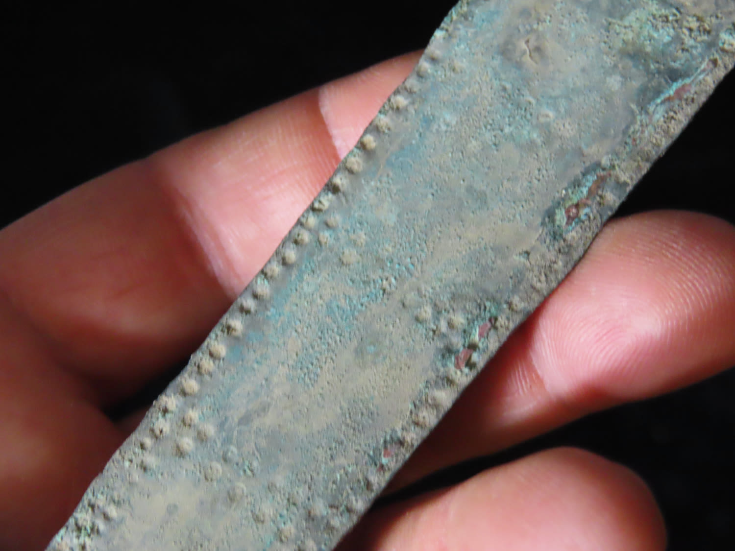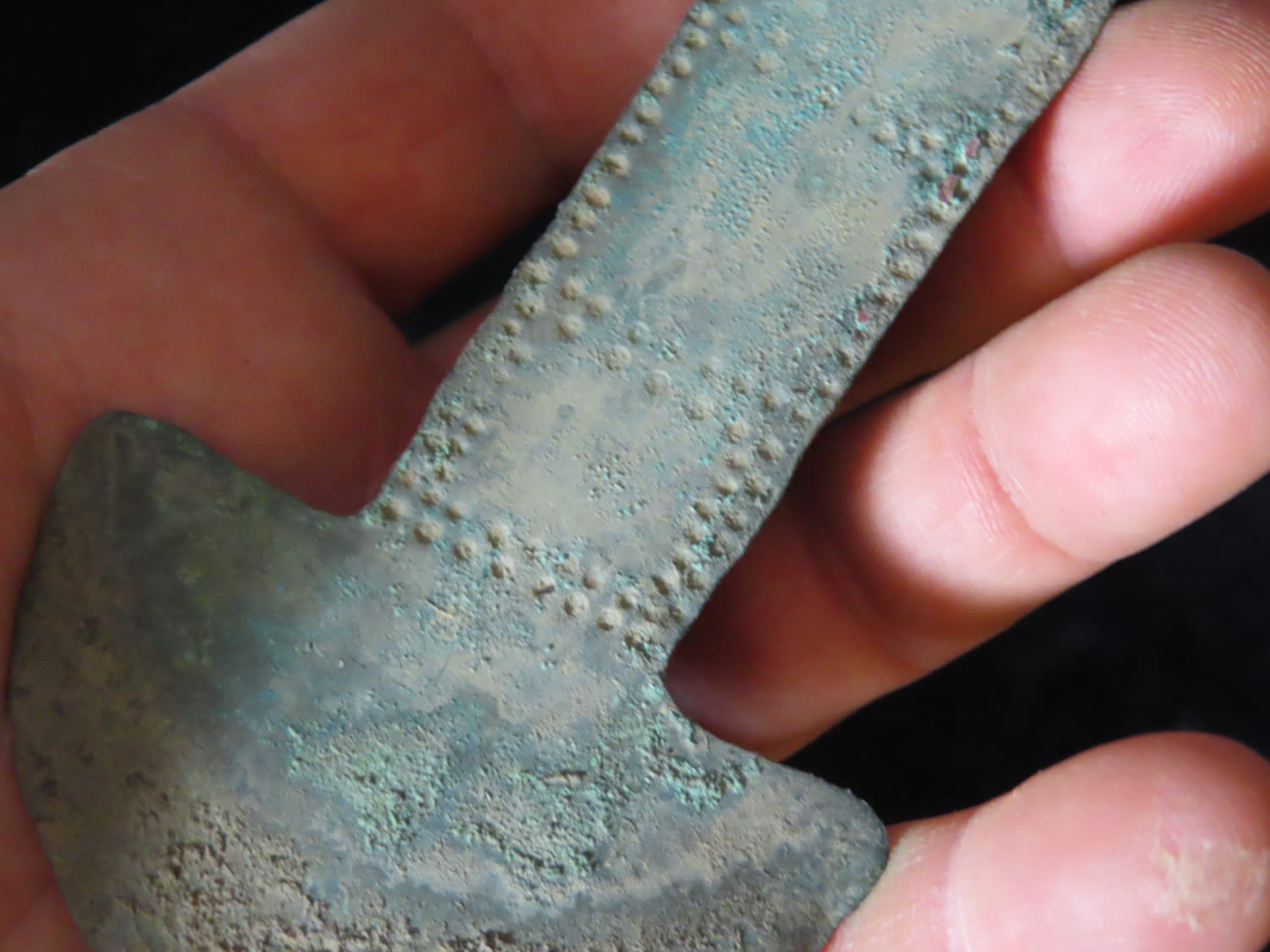 5 1/4″ COPPER TUMI KNIFE, MEXICO, HAS 100’S OF TINY EMBOSSED RAISED NODES AROUND THE PERIMETER, RARE FEATURE FOR THESE PRECOLUMBIAN RELICS