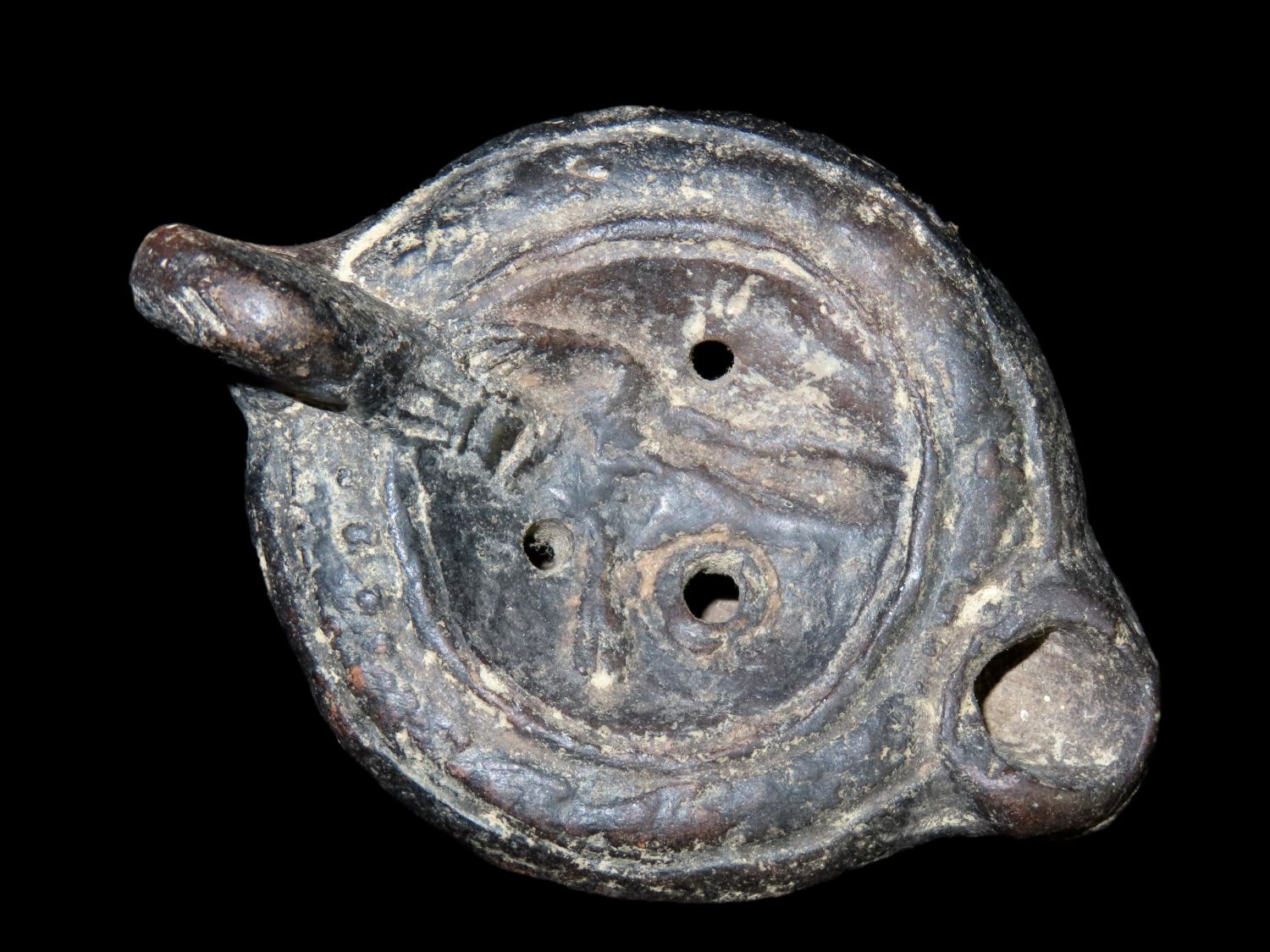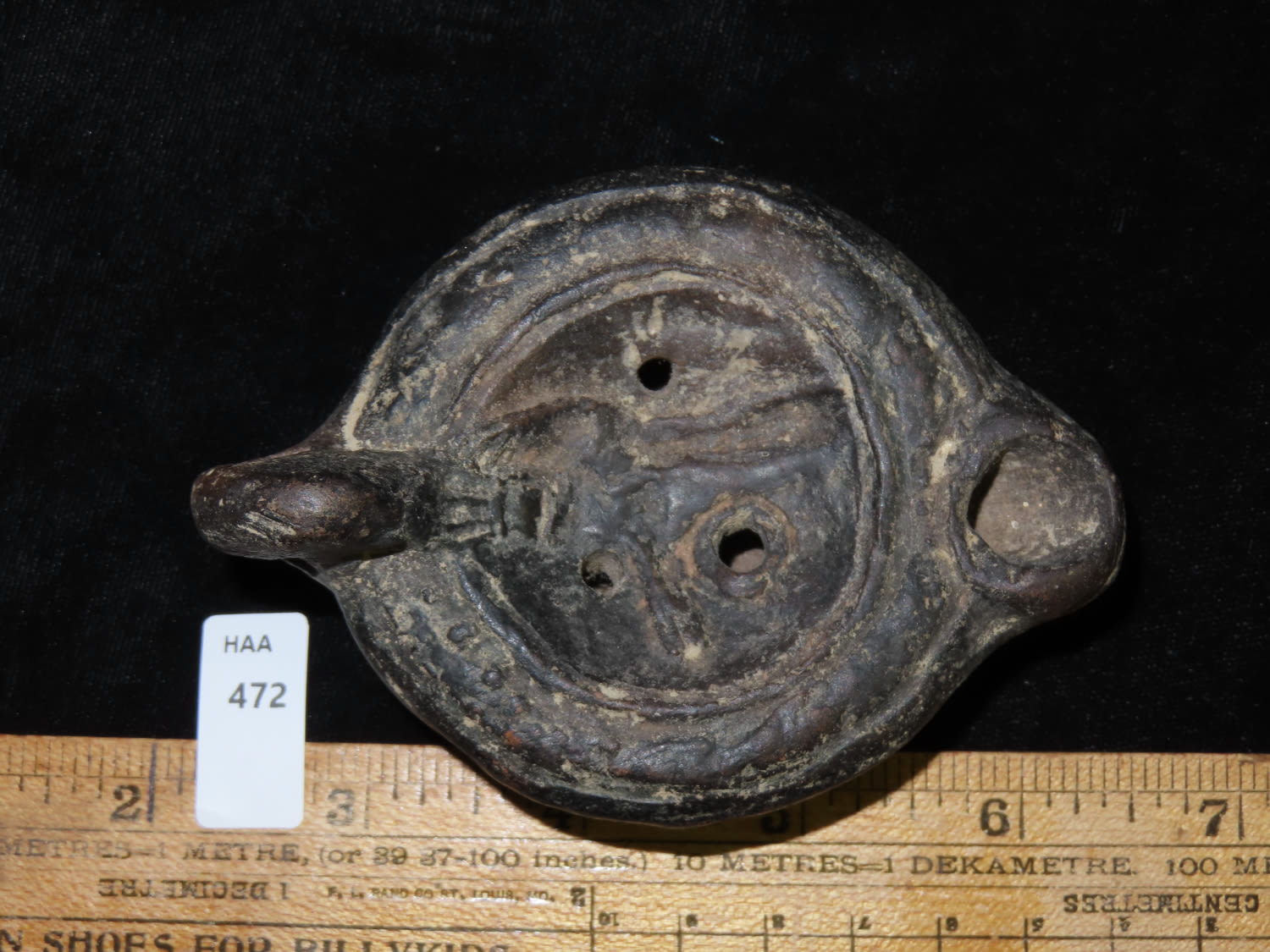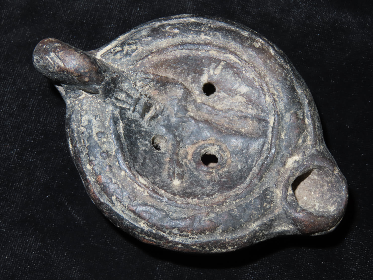 AMAZING HOLY LAND TERRA COTTA OIL LAMP FROM GREECE, NICE ORNATE EXAMPLE, 1500-3000 YEAR OLD ARTIFACT