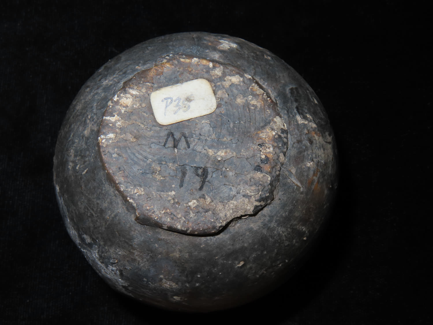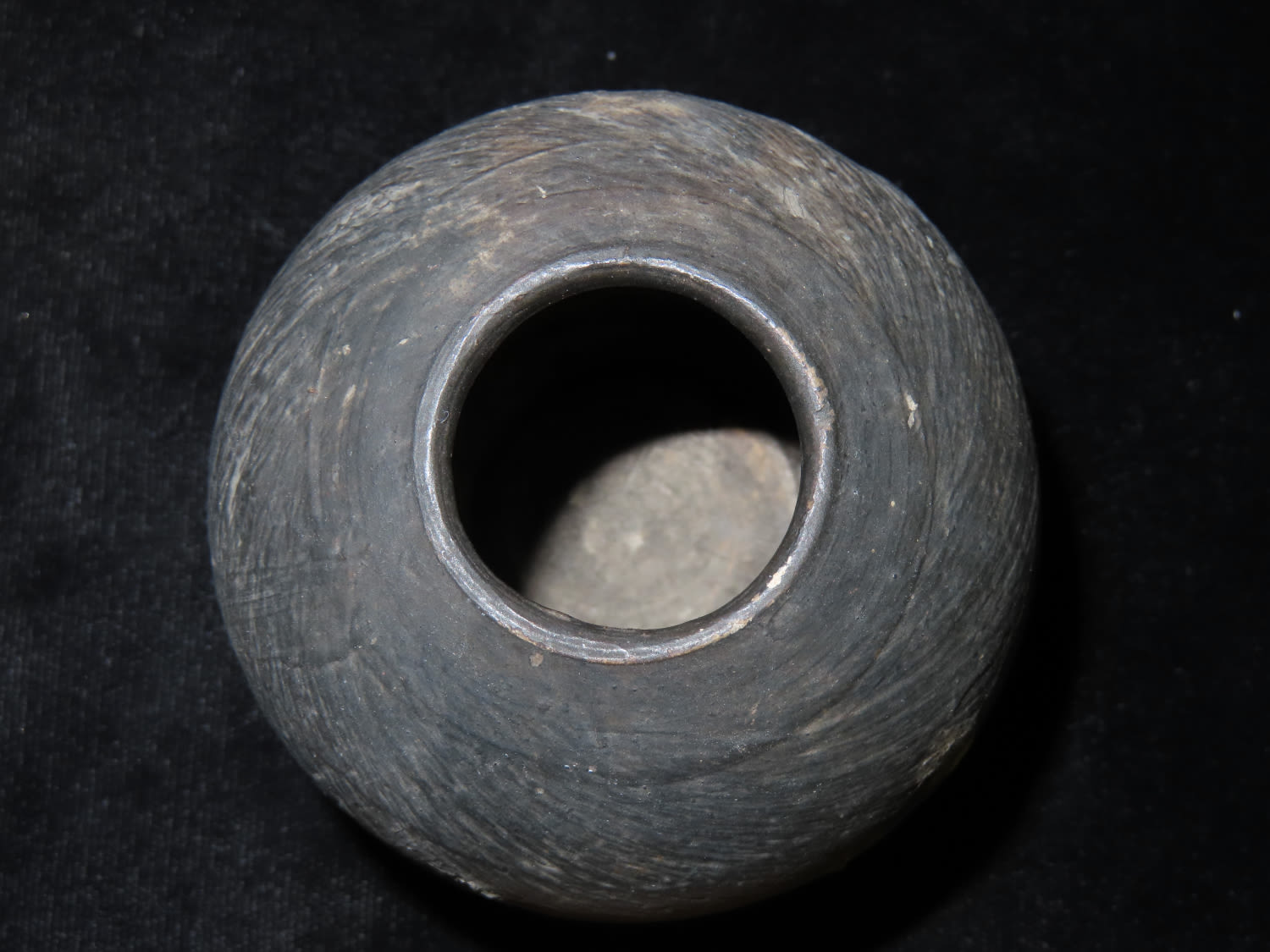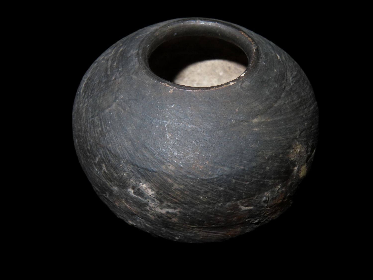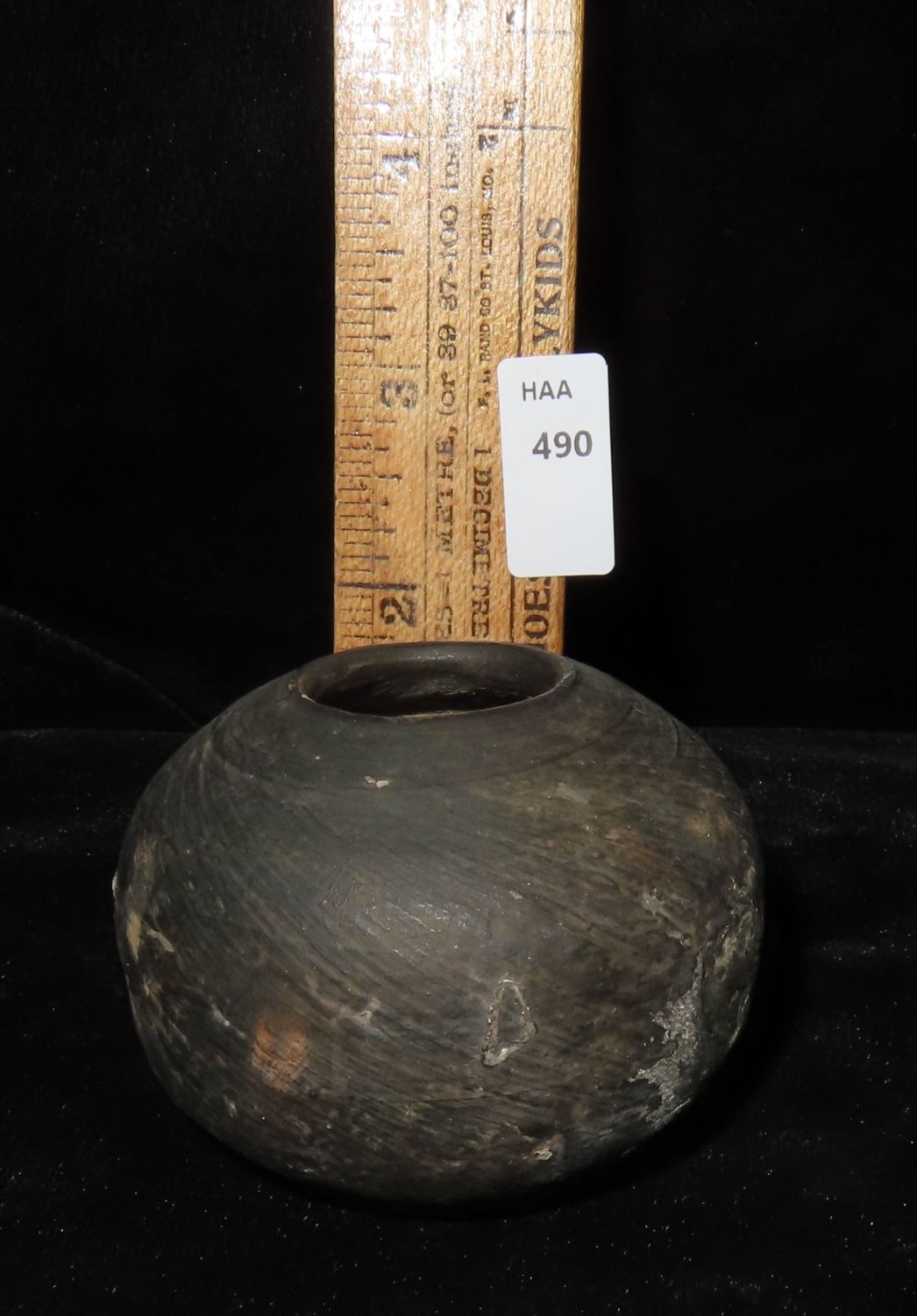 MINIATURE ANCIENT ASIAN / CHINESE POTTERY BOWL, EX ROY HATHCOCK, PICTURED ON HIS SHELF, PAGE 145 OF “THE ROY HATHCOCK COLLECTION,” AND ALSO IN LEGENDS #1 PAGE 128, GREAT SOLID EXAMPLE WITH NO BRAINER PATINA & DEPOSITS.