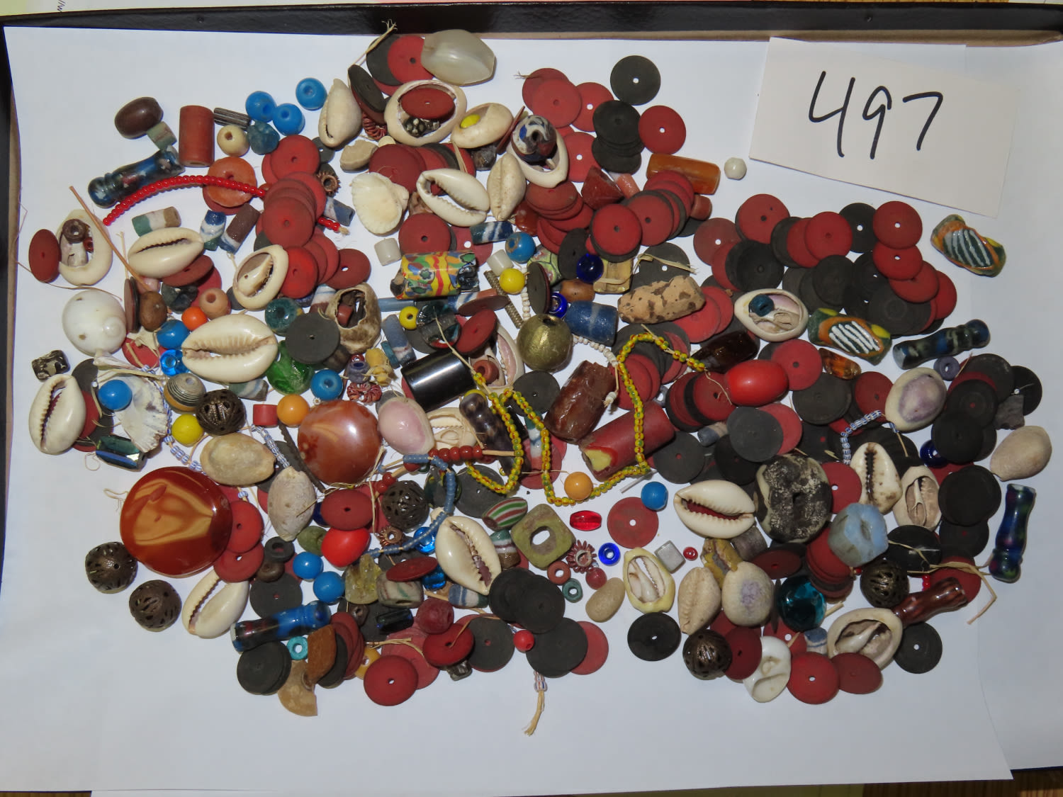 HUGE LOT OF 100’S OF LOOSE COLORFUL AFRICAN TRADE BEADS, LARGE VARIETY OF COLORS, MATERIALS, SHELL GLASS, BONE, COPPER, CERAMIC, ETC