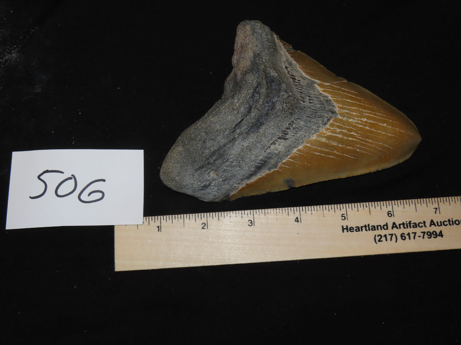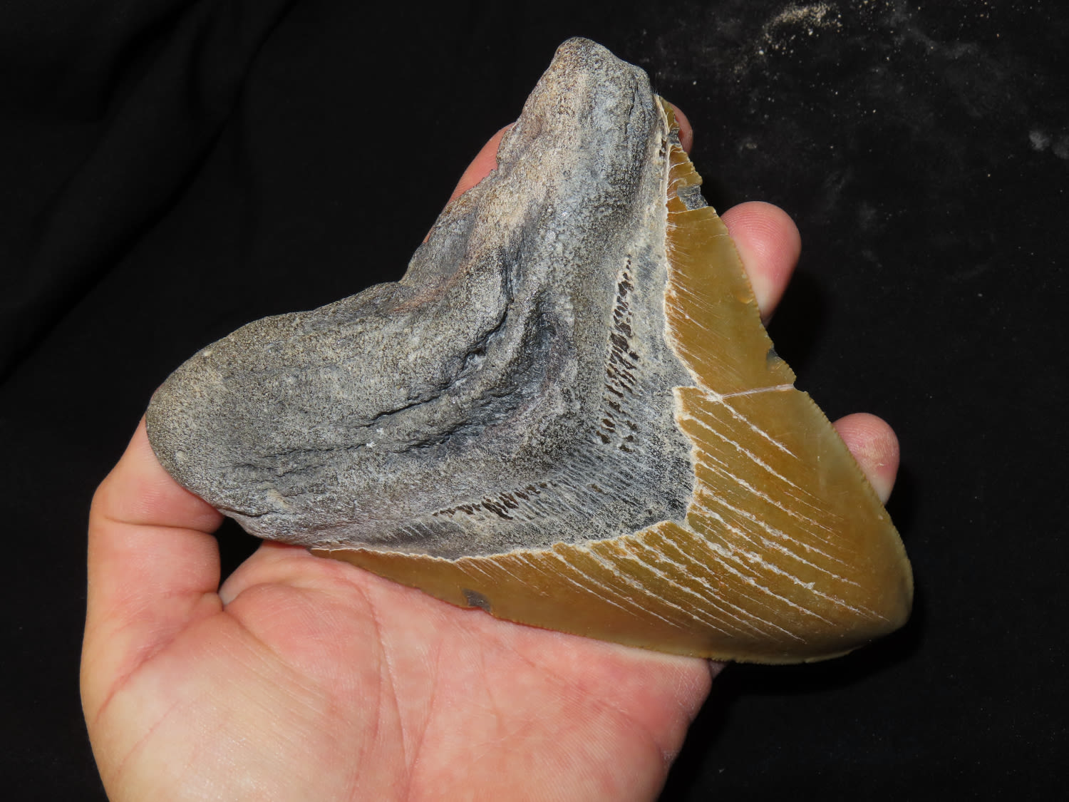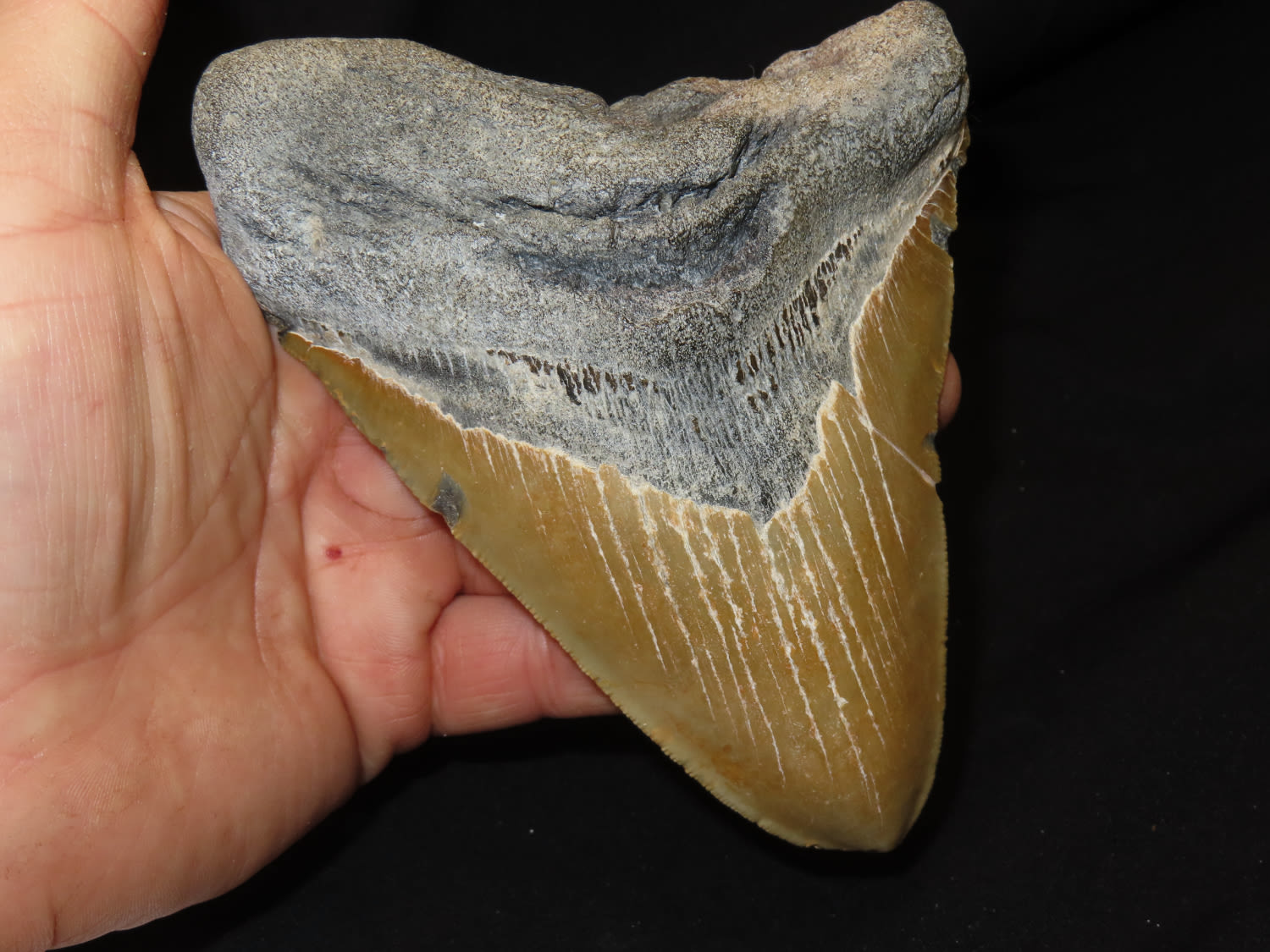 HUGE 6″ MEGALODON SHARK TOOTH, 23-2.5 MILLION YEAR OLD FOSSIL FOUND OFF THE COAST OF THE CAROLINA’S, NO REPAIR, NO RESTO, NO POLISH