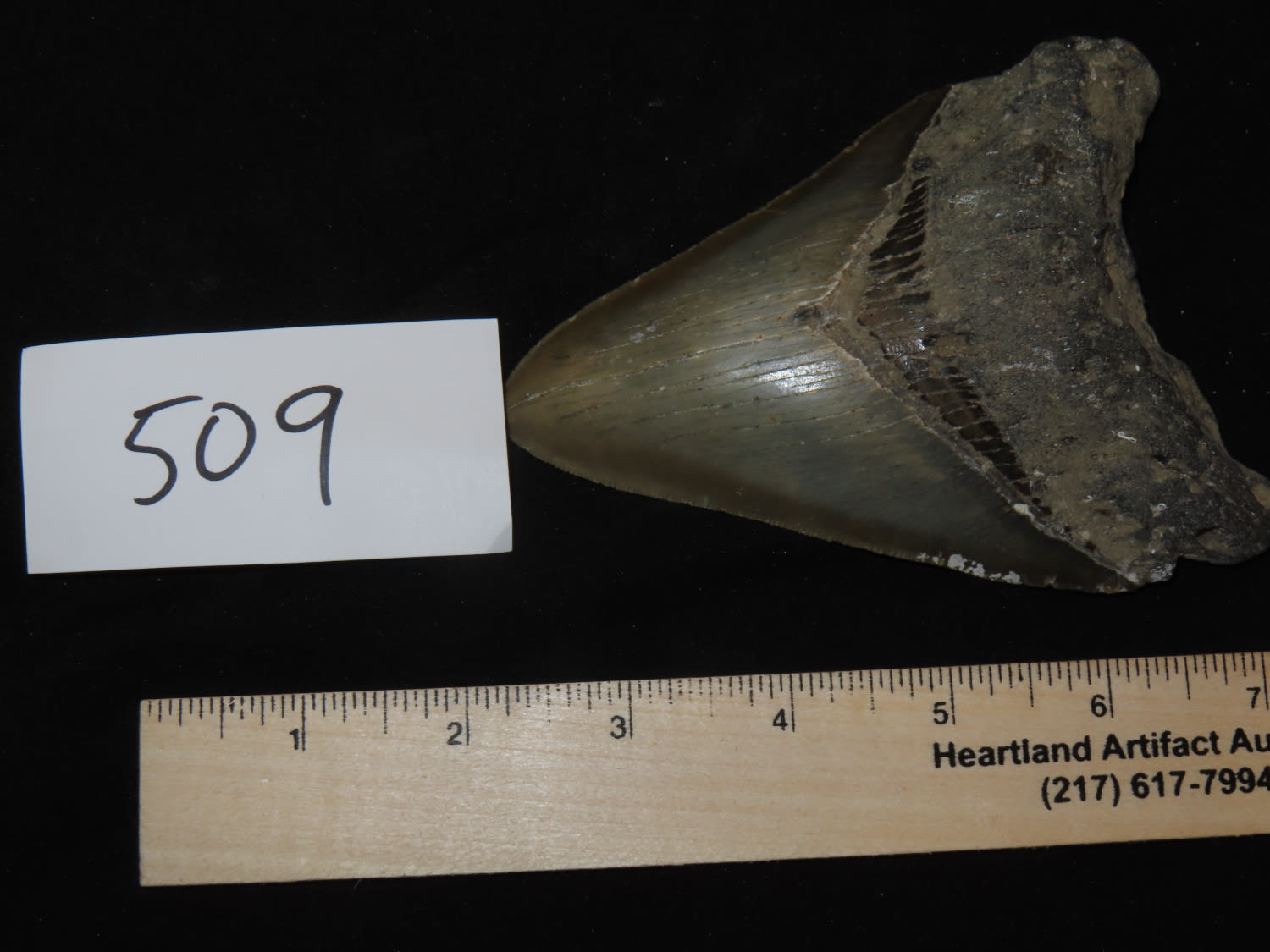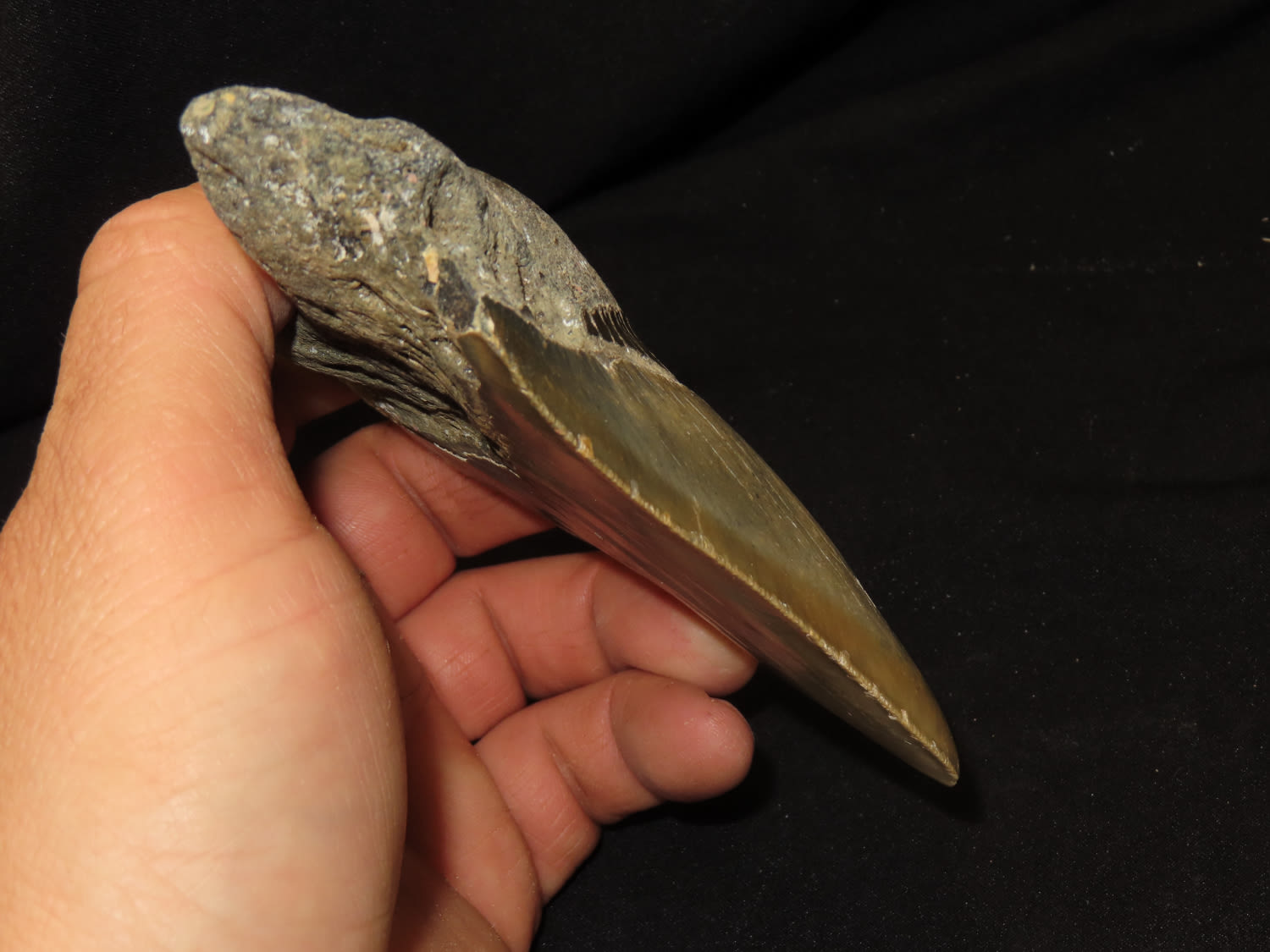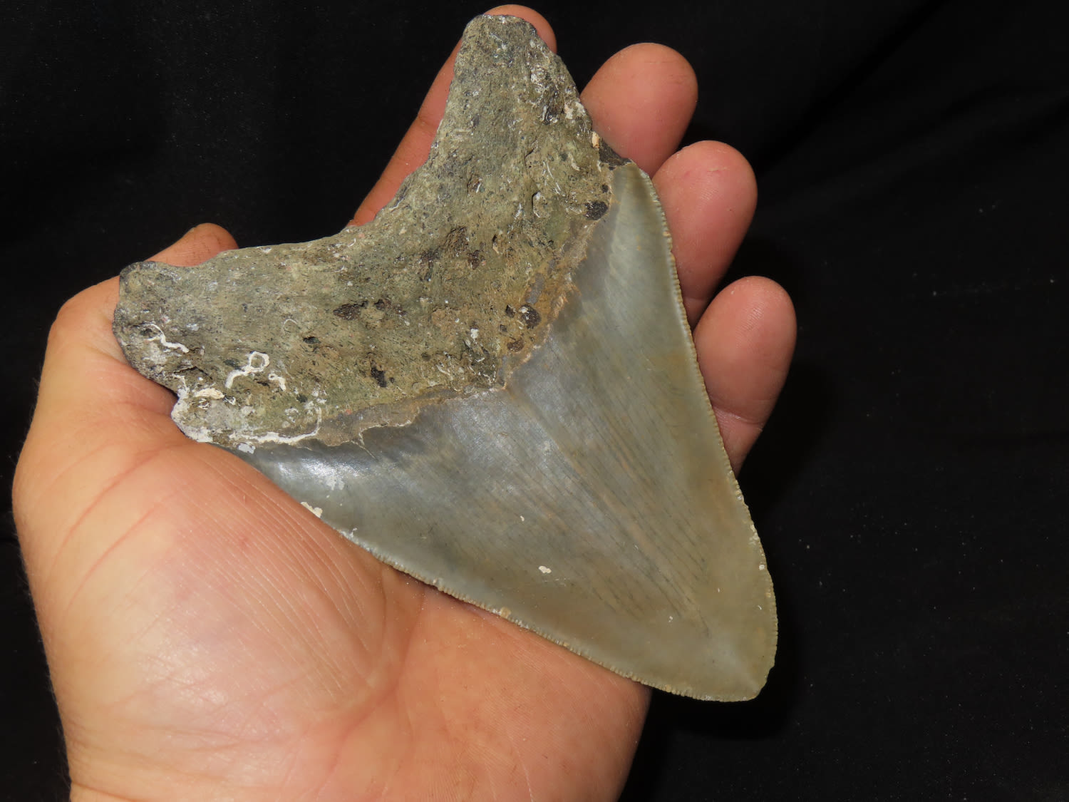 HUGE 5 1/8″ MEGALODON SHARK TOOTH, 23-2.5 MILLION YEAR OLD FOSSIL FOUND OFF THE COAST OF THE CAROLINA’S, NO REPAIR, NO RESTO, NO POLISH