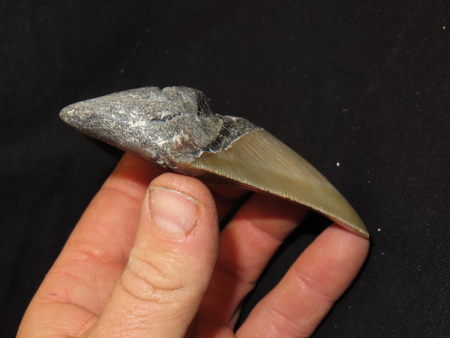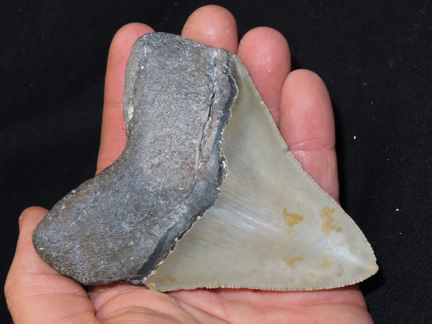 HUGE 4 1/4″ MEGALODON SHARK TOOTH, 23-2.5 MILLION YEAR OLD FOSSIL FOUND OFF THE COAST OF THE CAROLINA’S, NO REPAIR, NO RESTO, NO POLISH