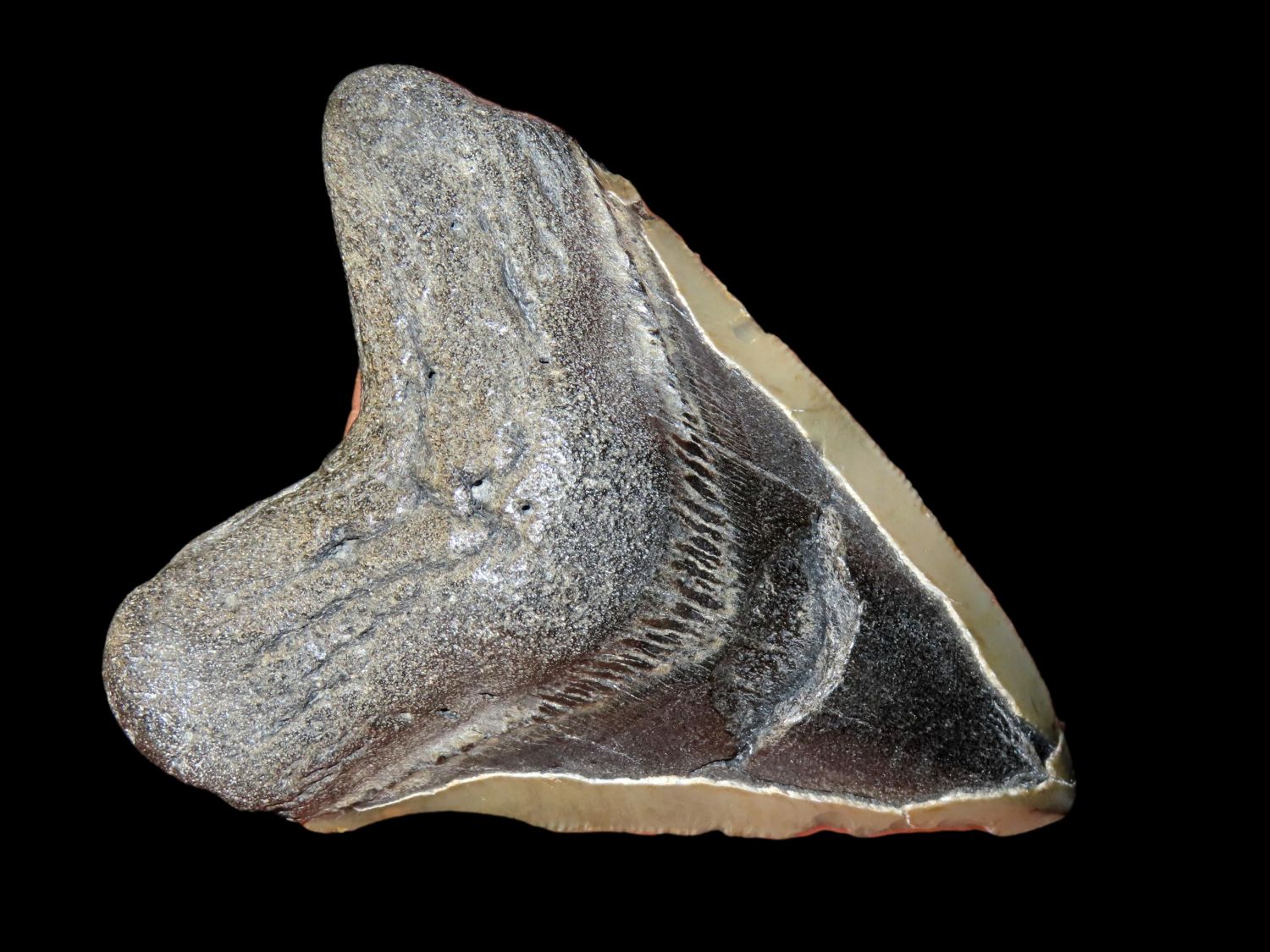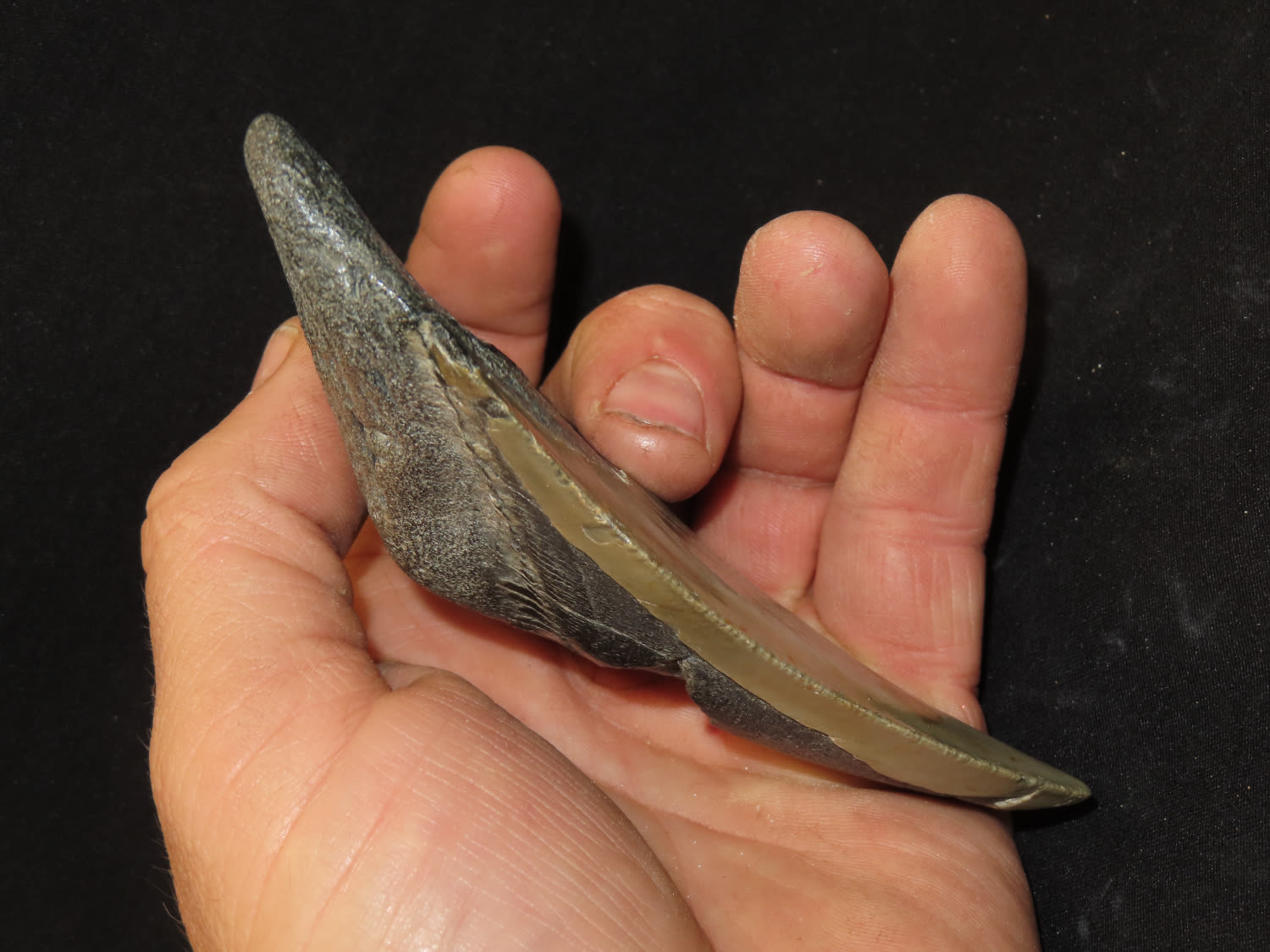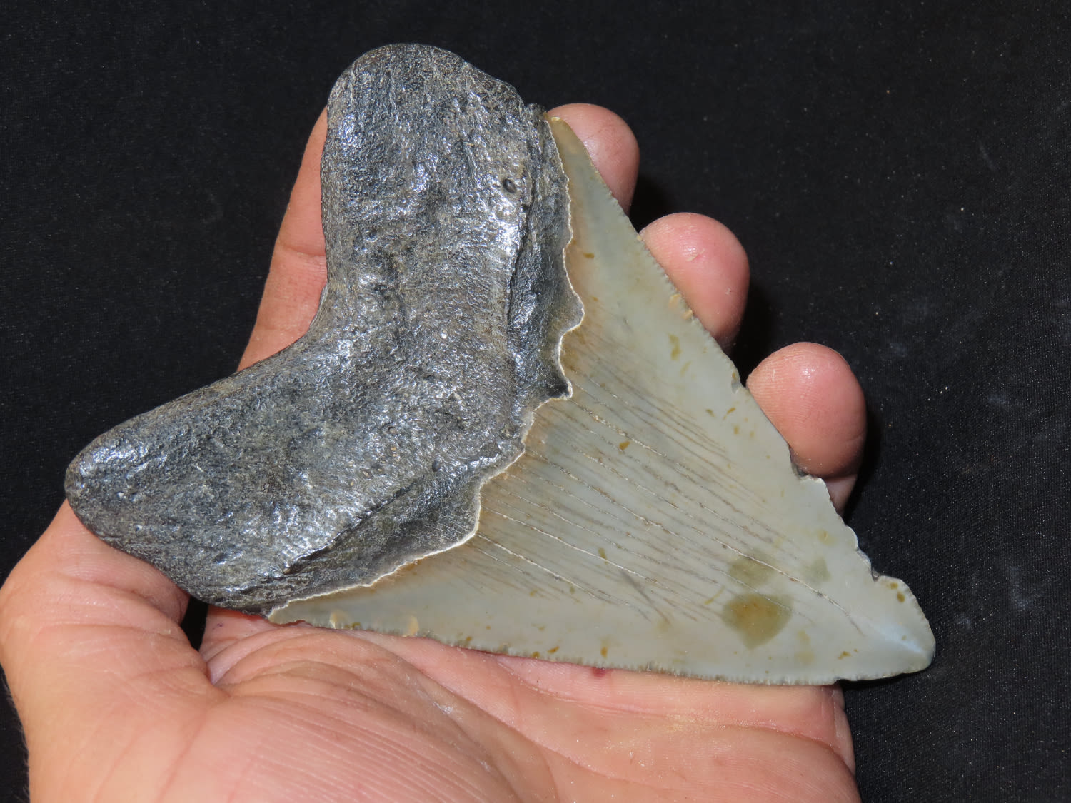 HUGE 4 3/4″ MEGALODON SHARK TOOTH, 23-2.5 MILLION YEAR OLD FOSSIL FOUND OFF THE COAST OF THE CAROLINA’S, NO REPAIR, NO RESTO, NO POLISH