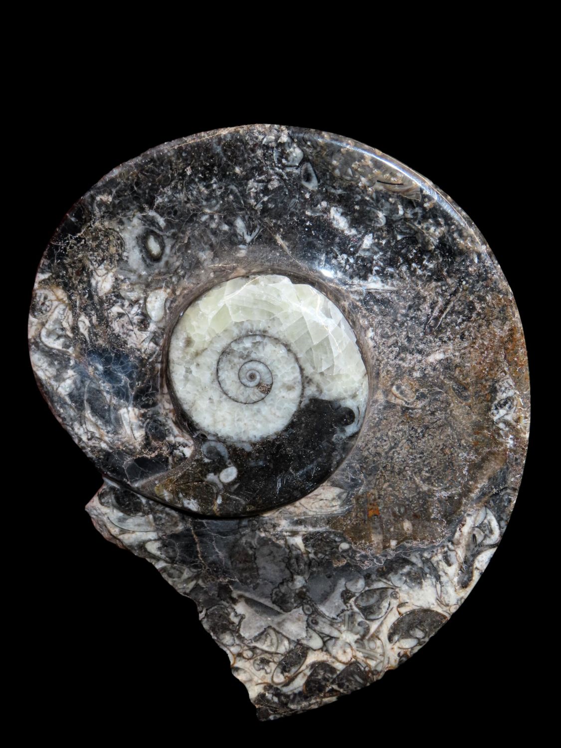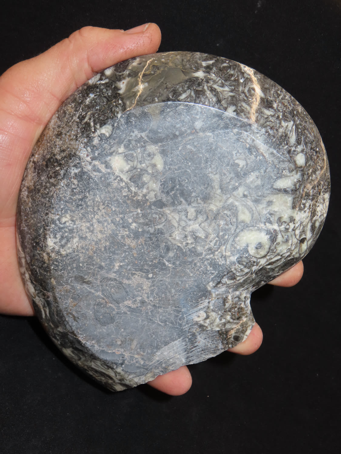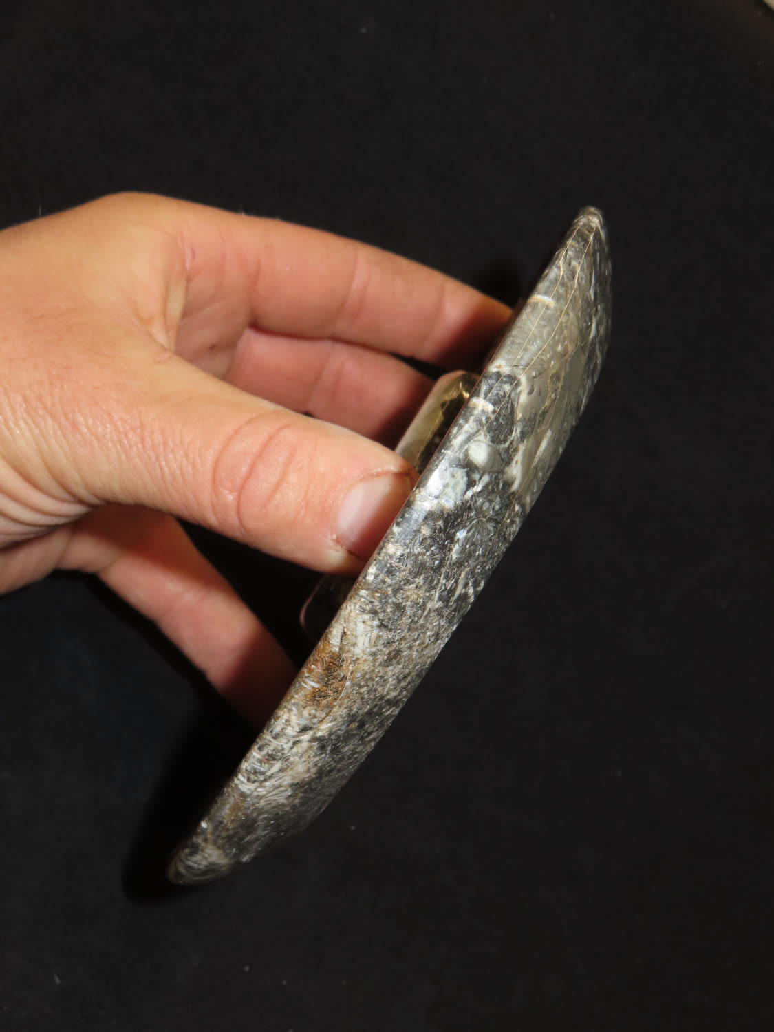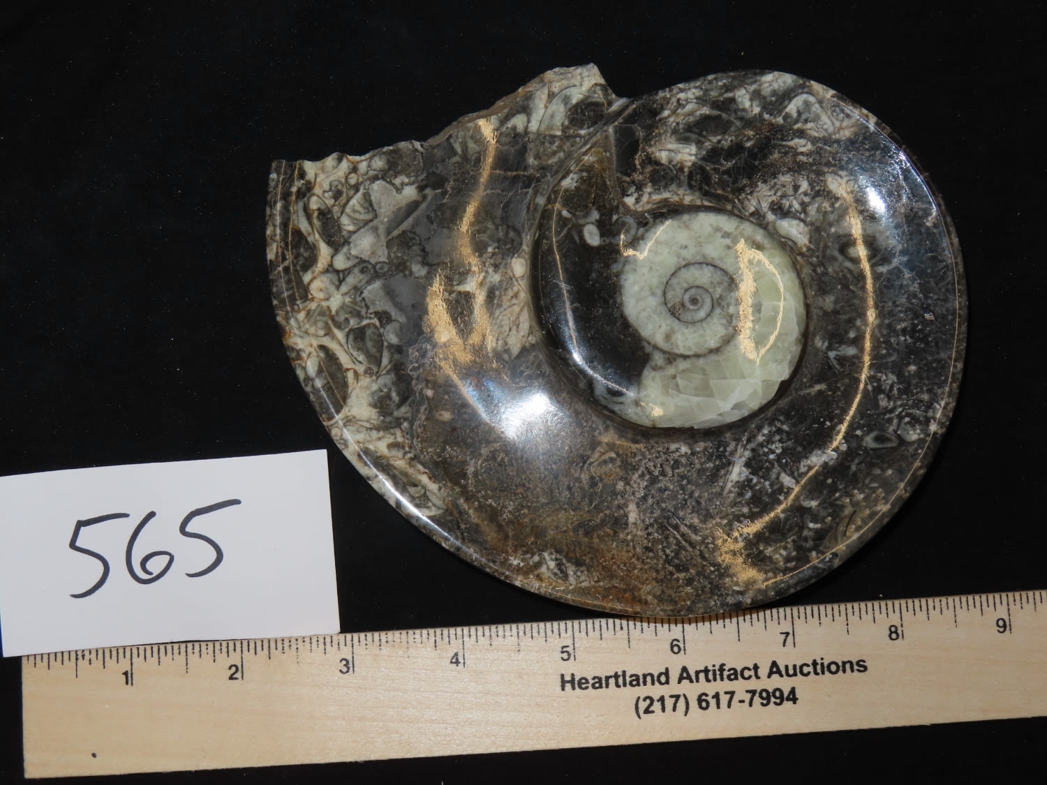 LARGE 6 1/2″ AMMONITE FOSSIL PLATE, CUT & POLISHED, RECESSED FOR USE AS ASHTRAY, BOWL, CHANGE HOLDER, ETC