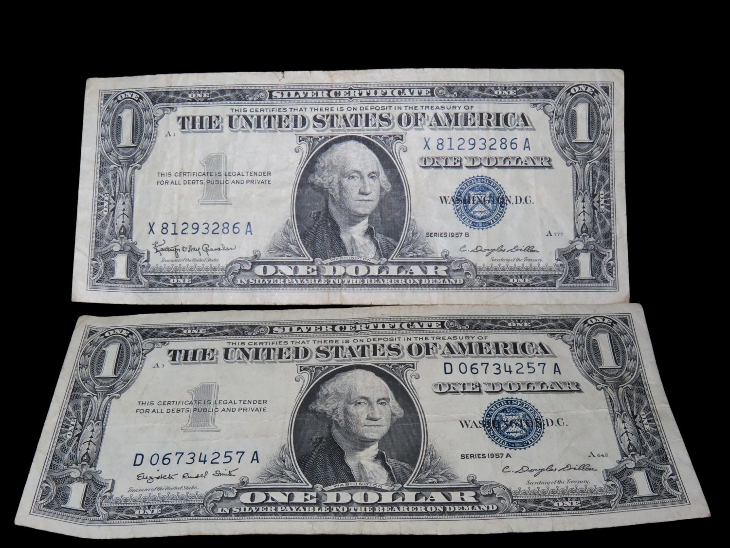 PAIR OF EARLY SILVER CERTIFICATES FROM 1957, GREAT CONDITION