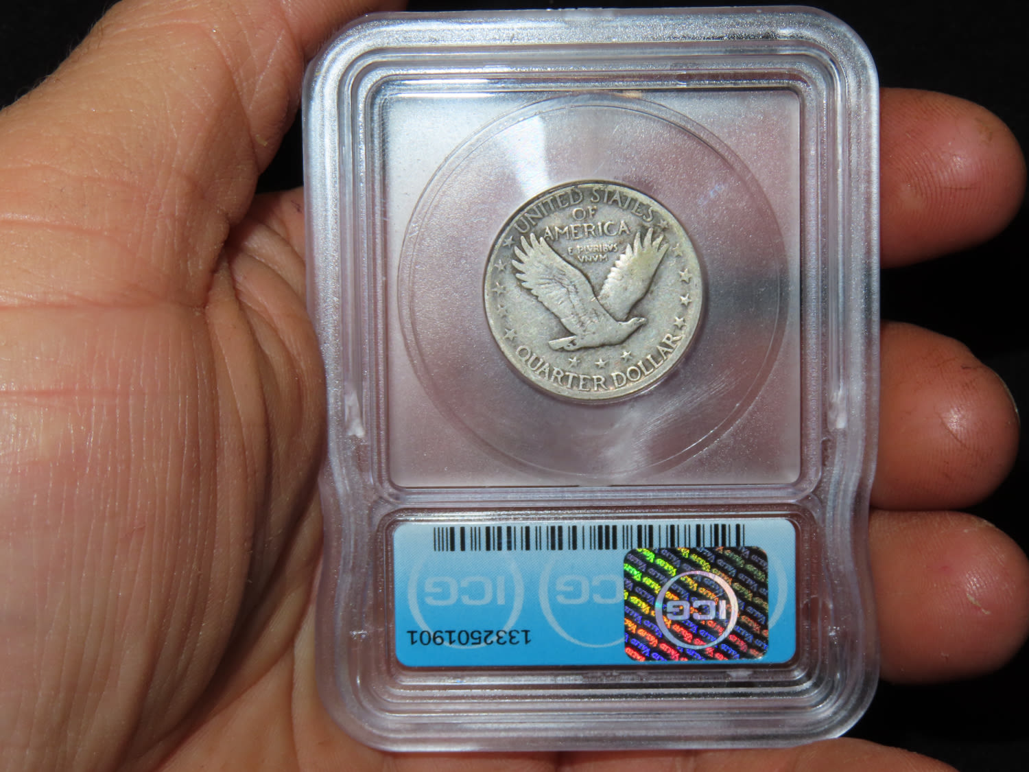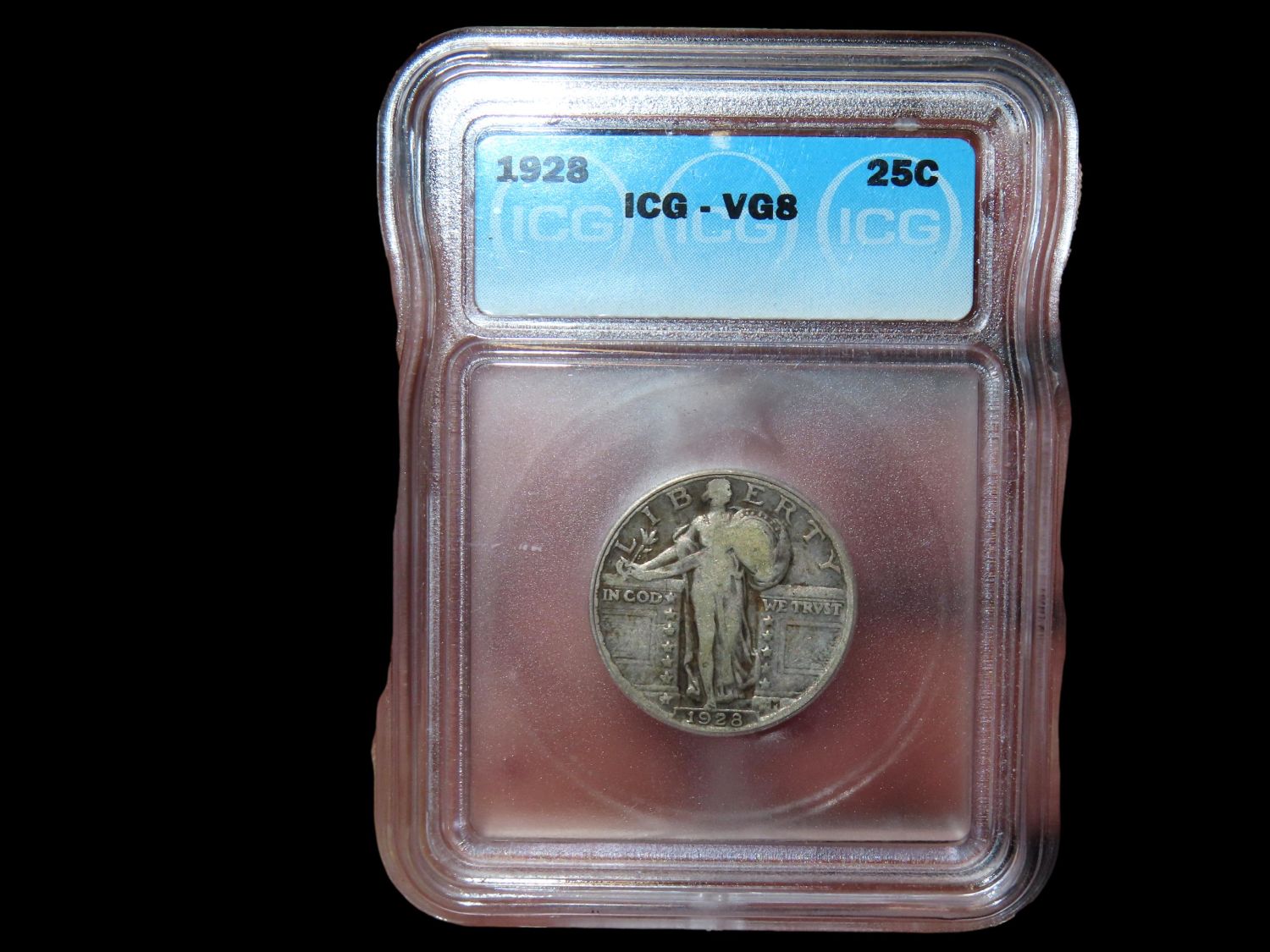 1928 STANDING LIBERTY SILVER QUARTER, ICG SLABBED VG-8, GREAT DETAILS, HIGHER GRADE EXAMPLE OF A RARE COIN
