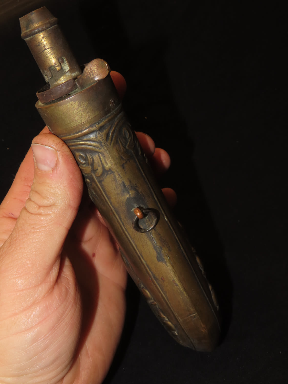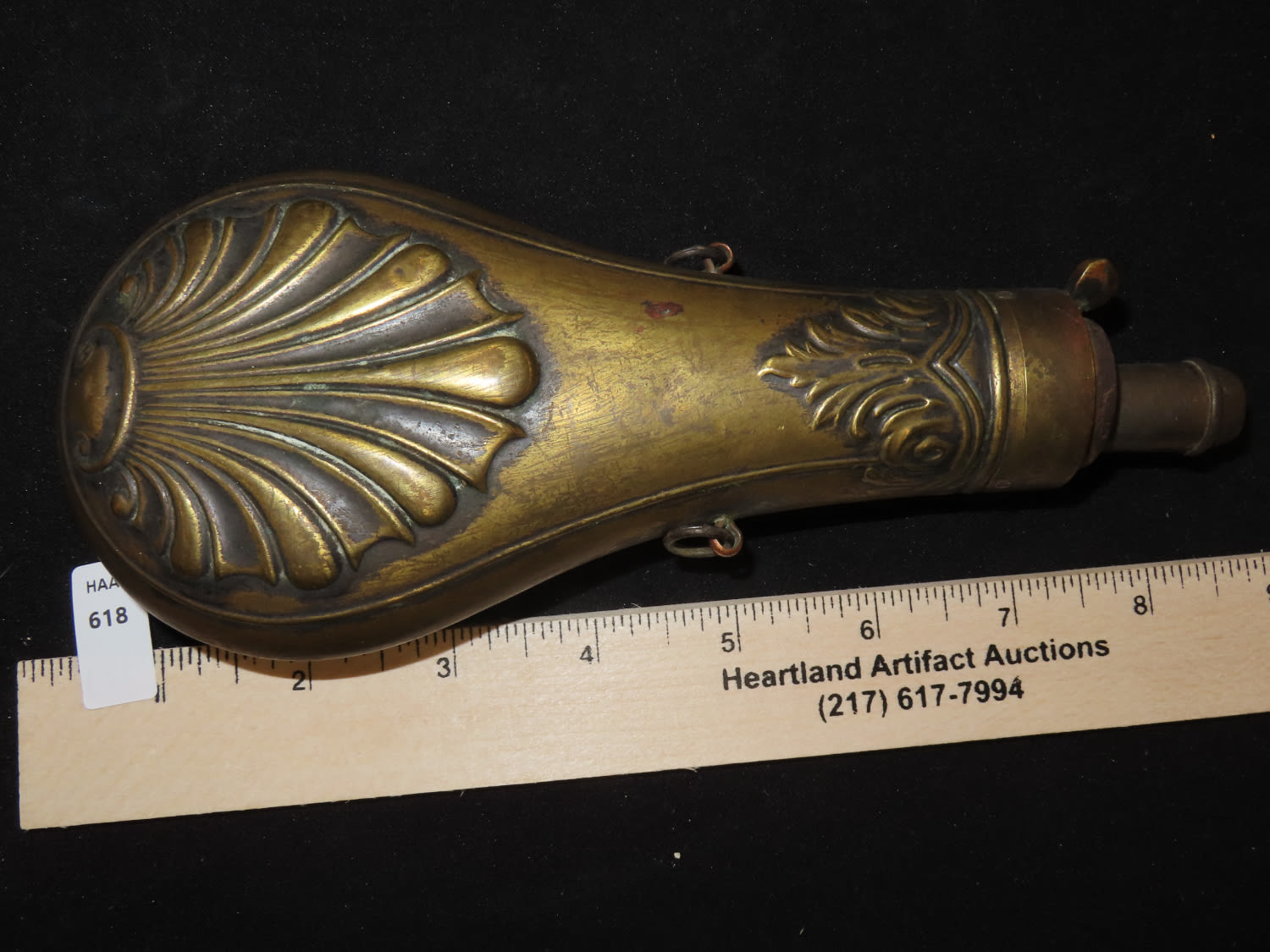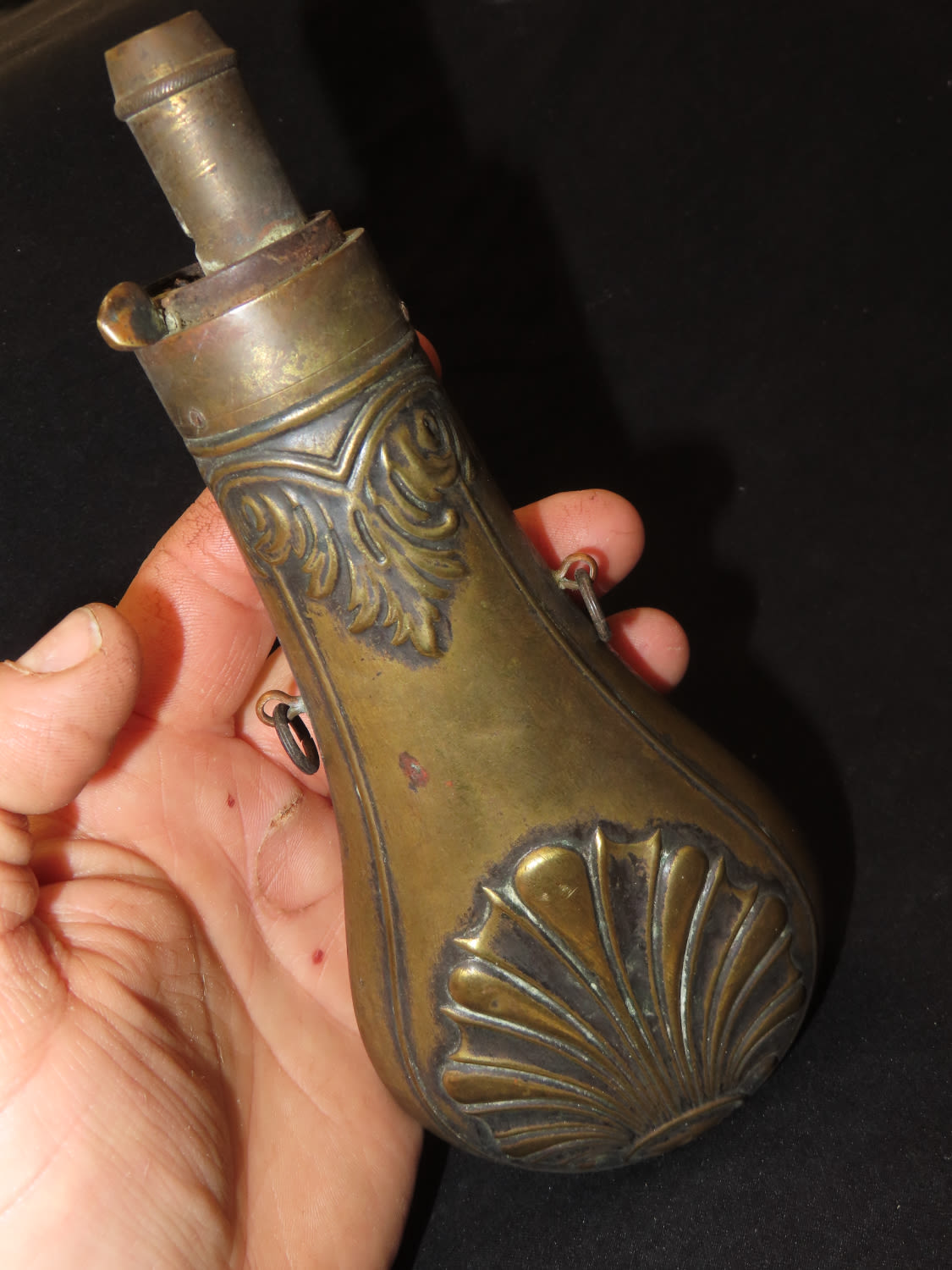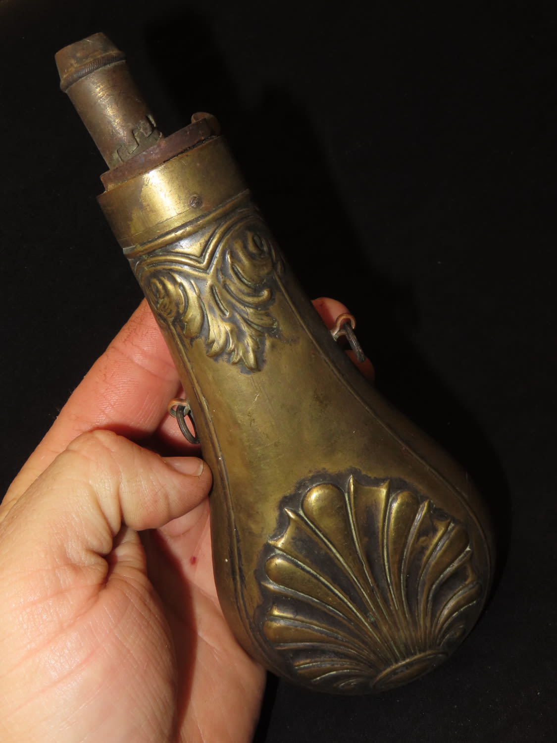 NICE ORIGINAL CIVIL WAR ERA POWDER FLASK, GREAT DESIGN, STILL FUNCTIONS WELL