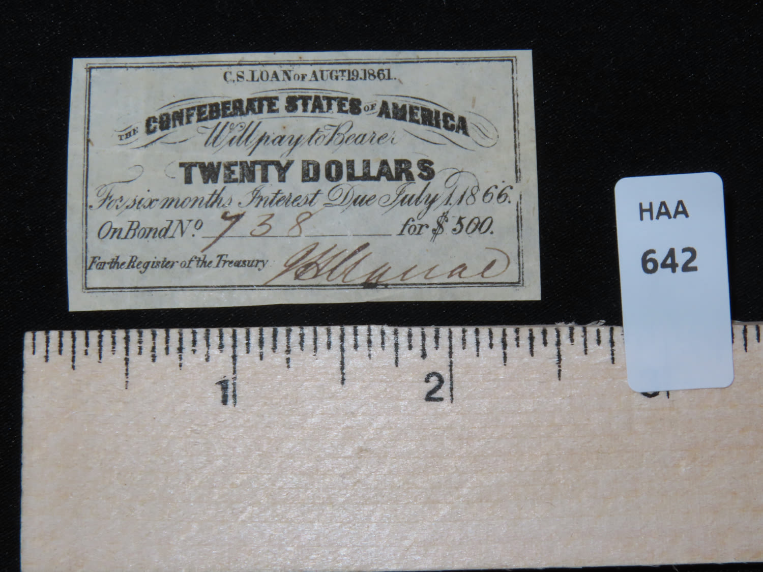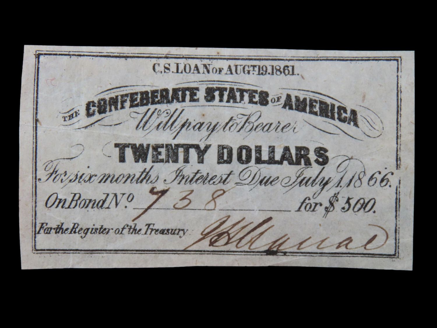 CIVIL WAR CONFEDERATE CURRENCY $20 BOND NOTE, DATED AUGUST 19, 1861, GREAT PIECE OF AMERICAN HISTORY