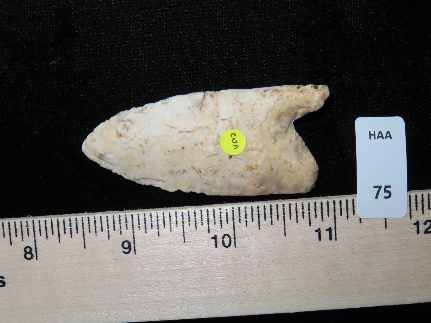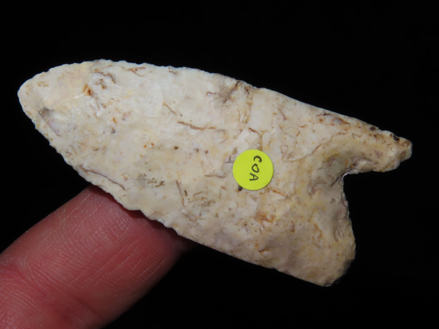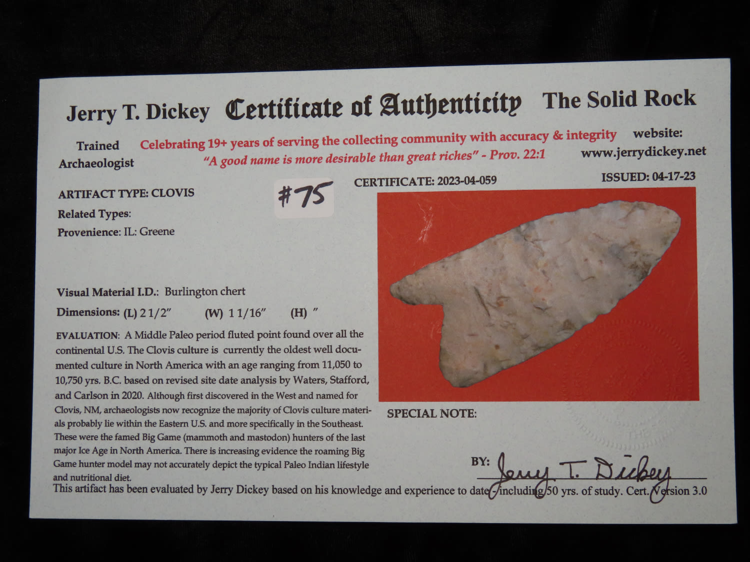 2 1/2" PALEO FLUTED CLOVIS, DICKEY COA, FOUND IN GREENE COUNTY ILLINOIS, INTERESTING BASAL TREATMENT, INDIAN ARROWHEAD, ARTIFACT