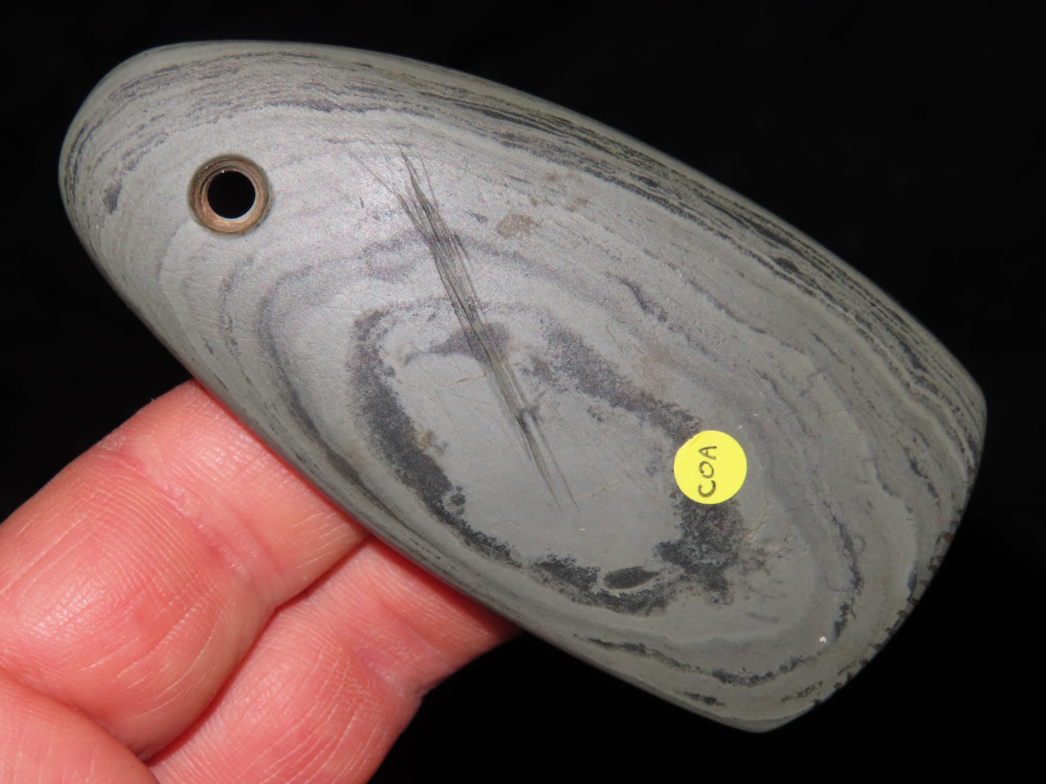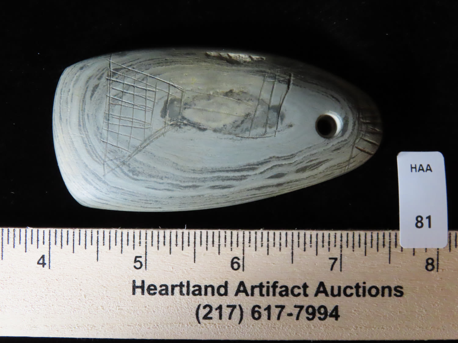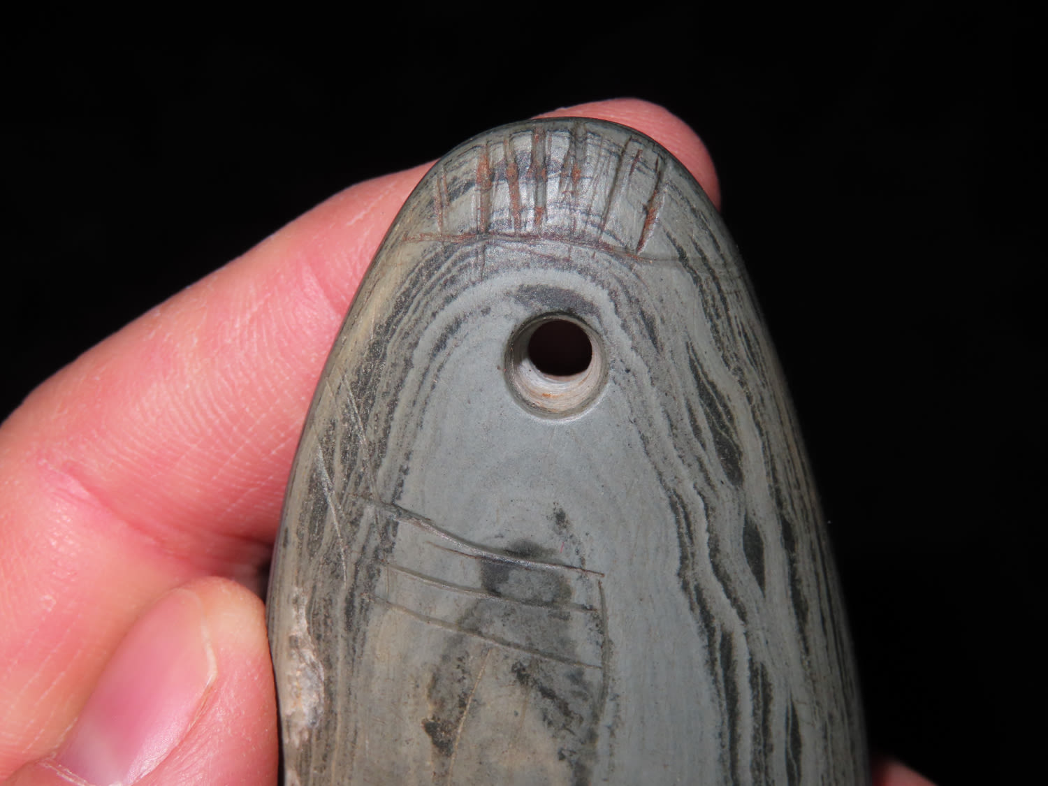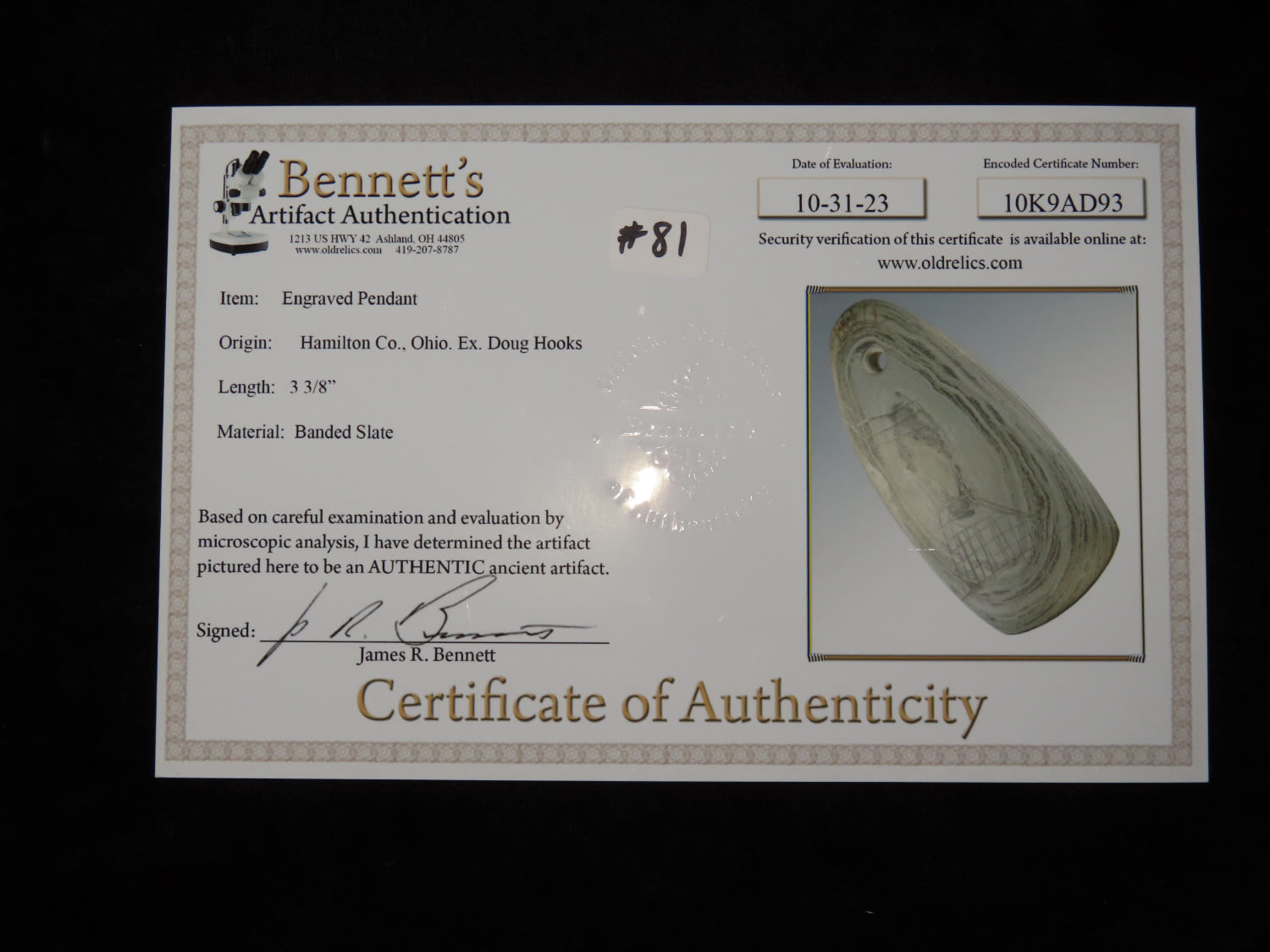 3 3/8″ ENGRAVED & TALLIED BANDED SLATE PENDANT, BENNETT COA, FOUND IN HAMILTON COUNTY OHIO, EX DOUG HOOKS