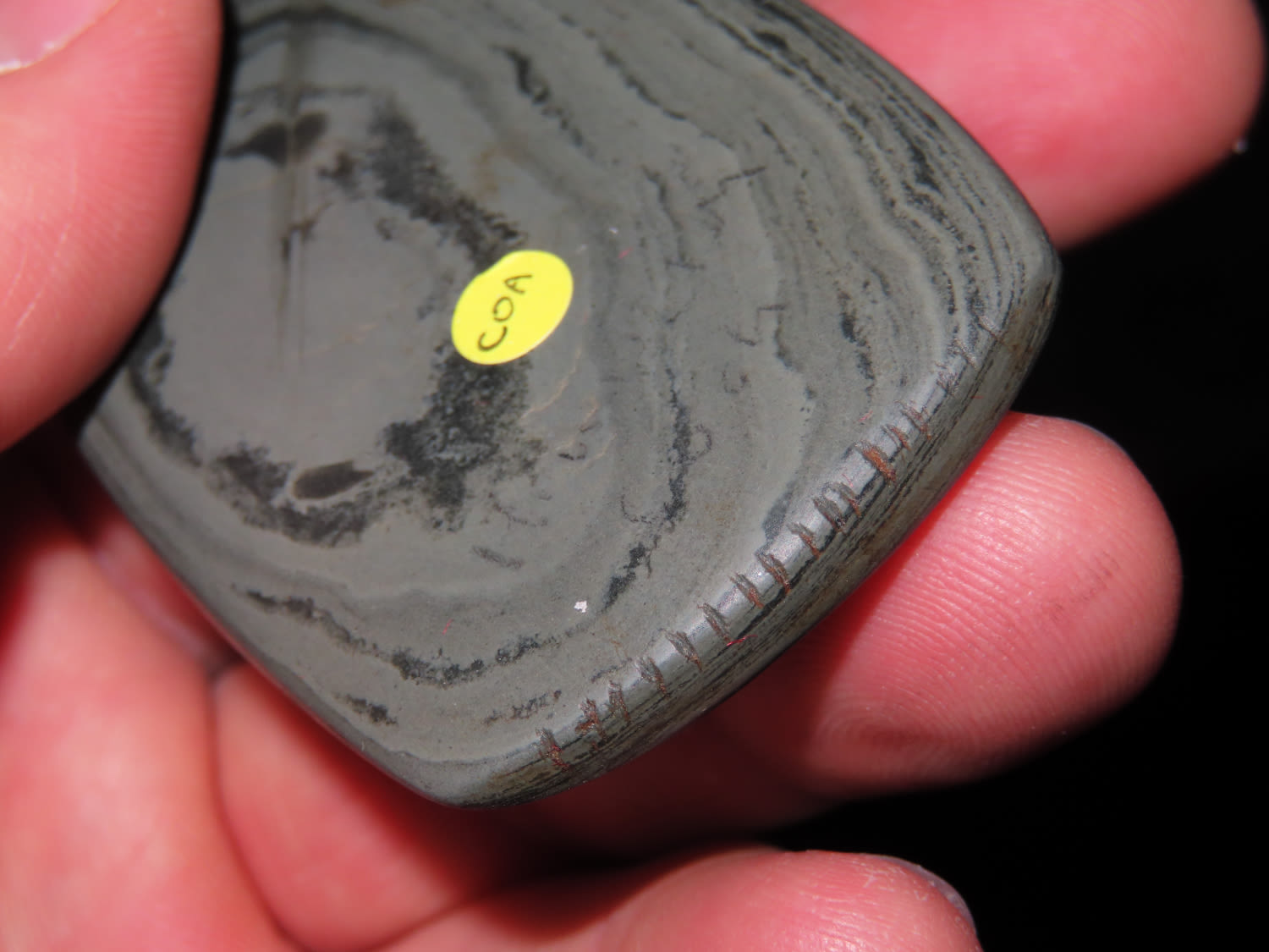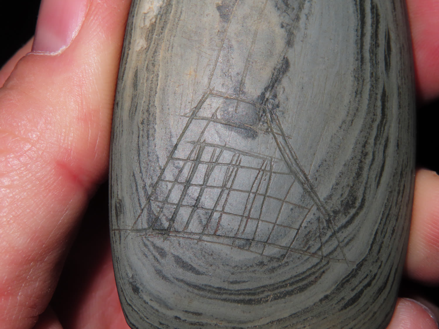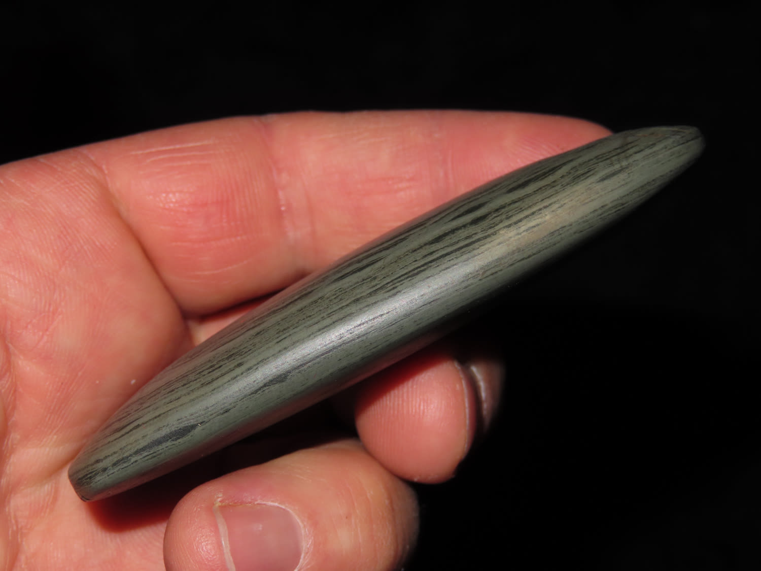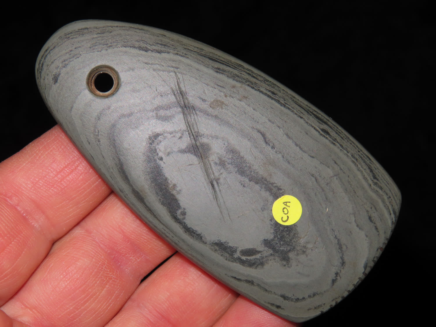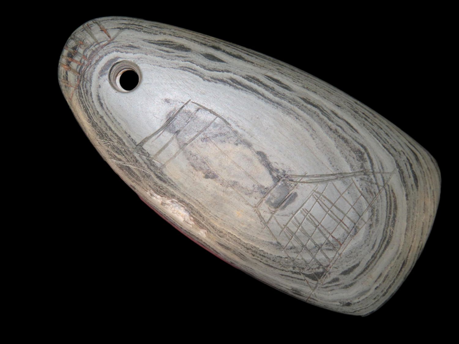 3 3/8″ ENGRAVED & TALLIED BANDED SLATE PENDANT, BENNETT COA, FOUND IN HAMILTON COUNTY OHIO, EX DOUG HOOKS