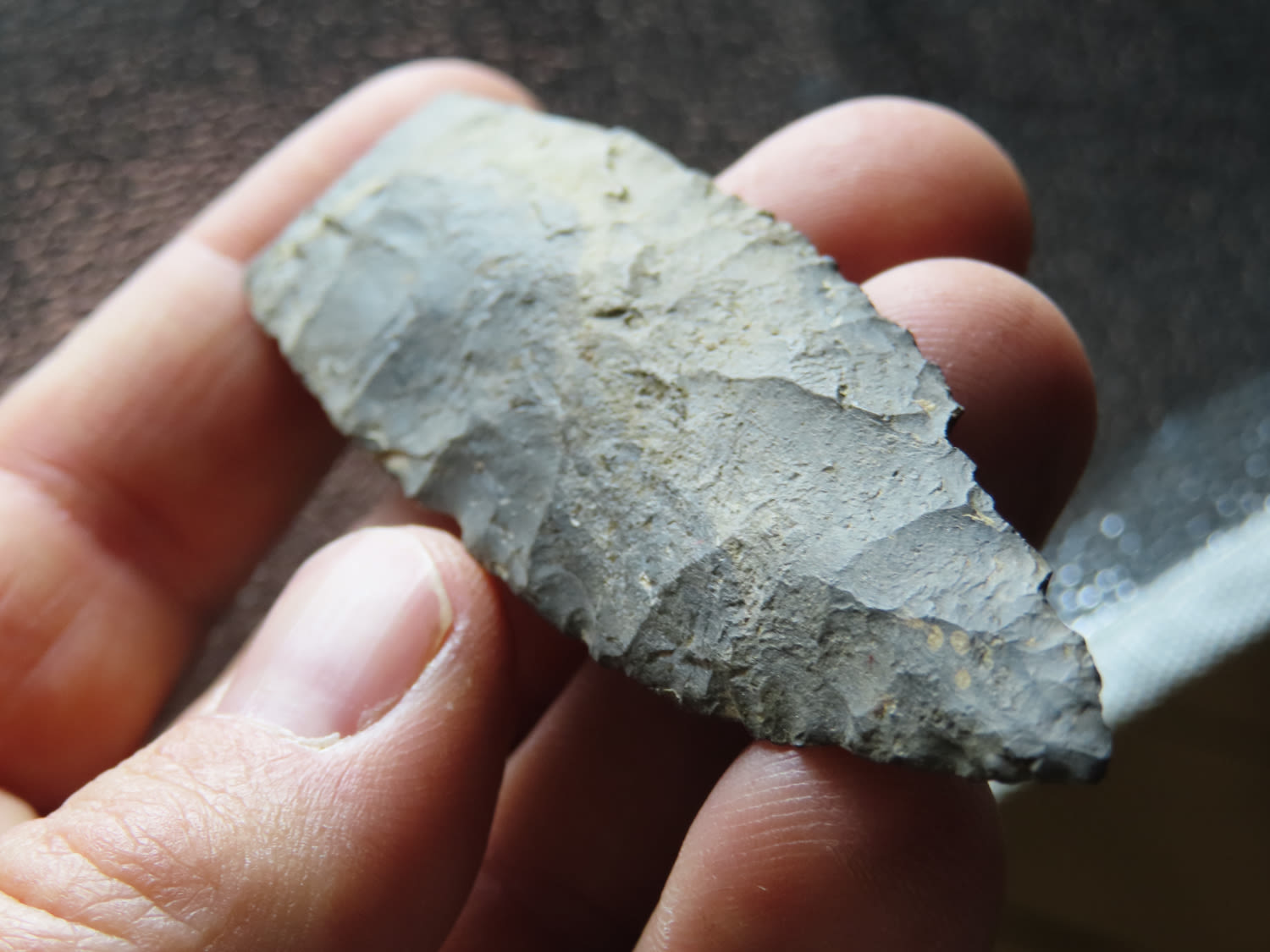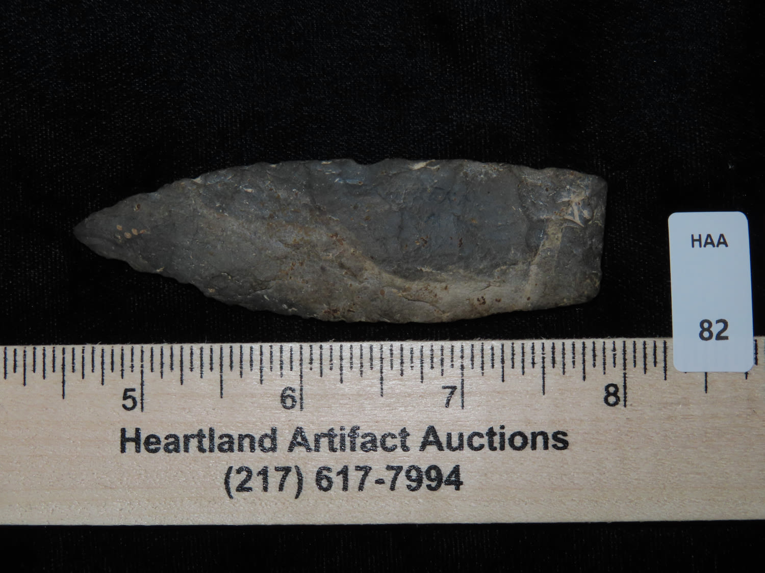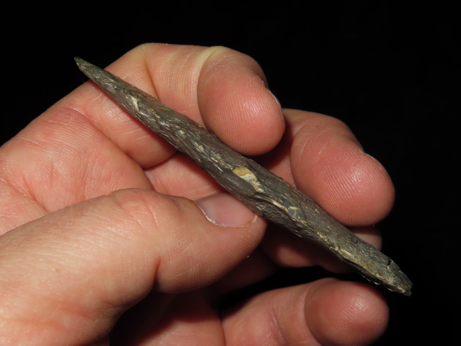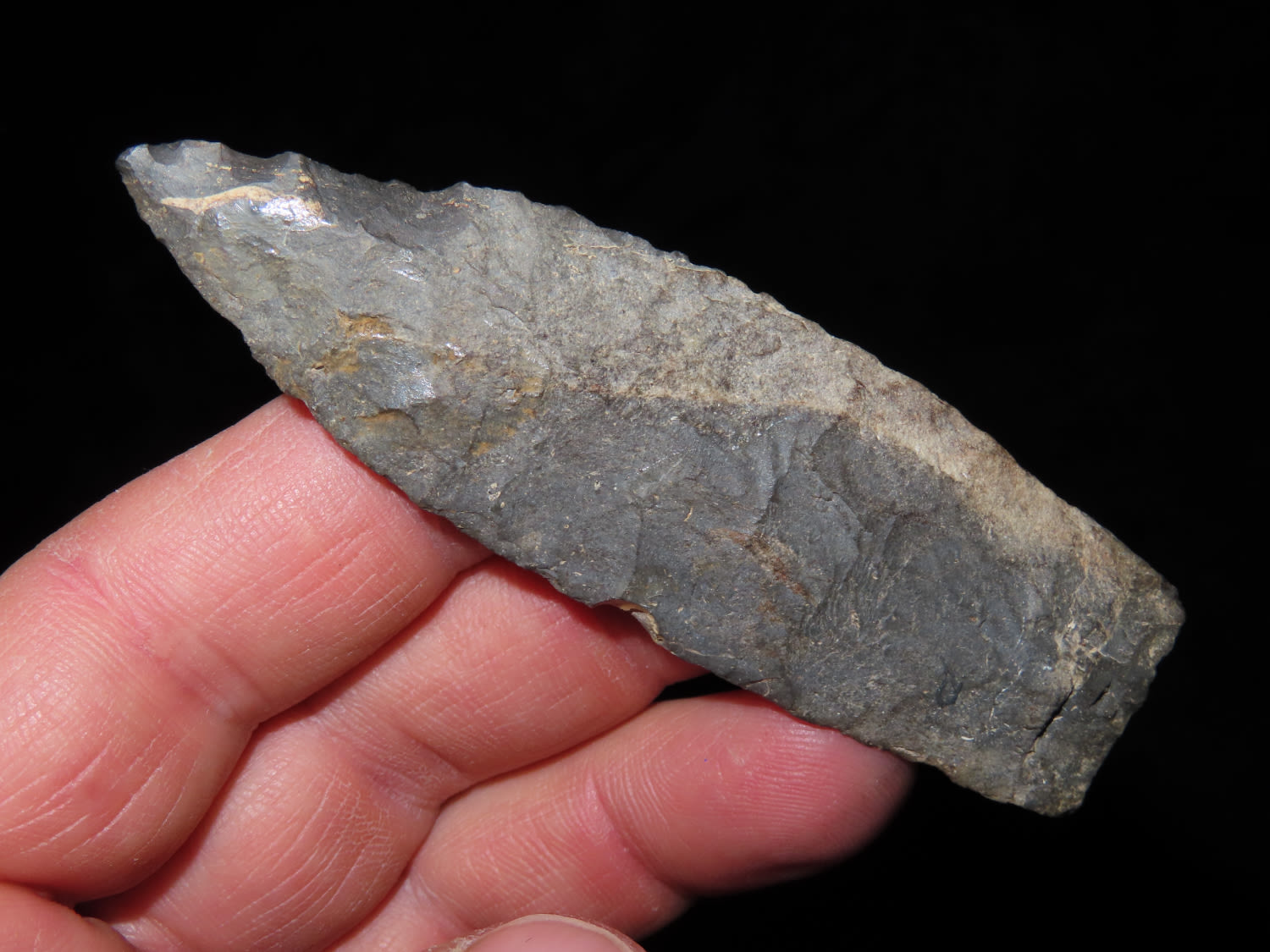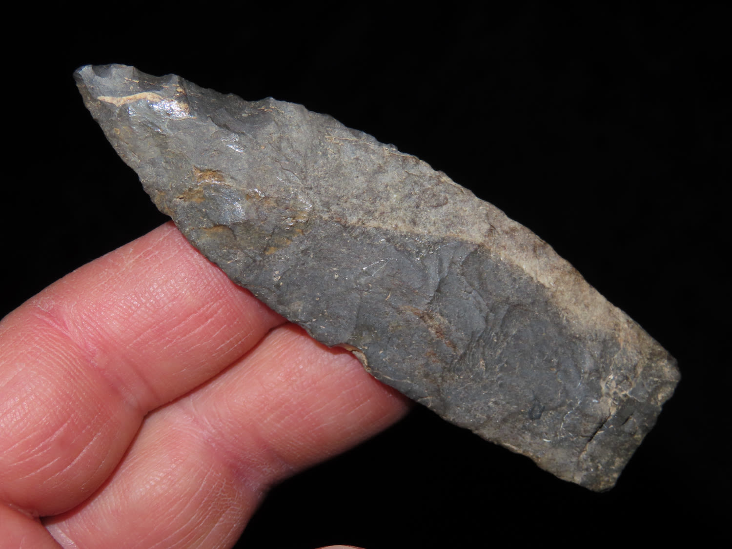 3 7/16″ PALEO LANCE / AGATE BASIN FOUND IN KENT COUNTY MICHIGAN, NICE ERALY PIECE, BASAL EDGE GRINDING HALFWAY UP THE EDGES