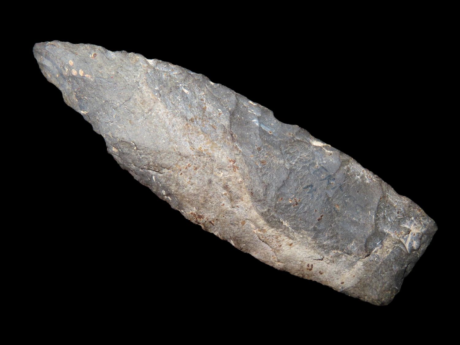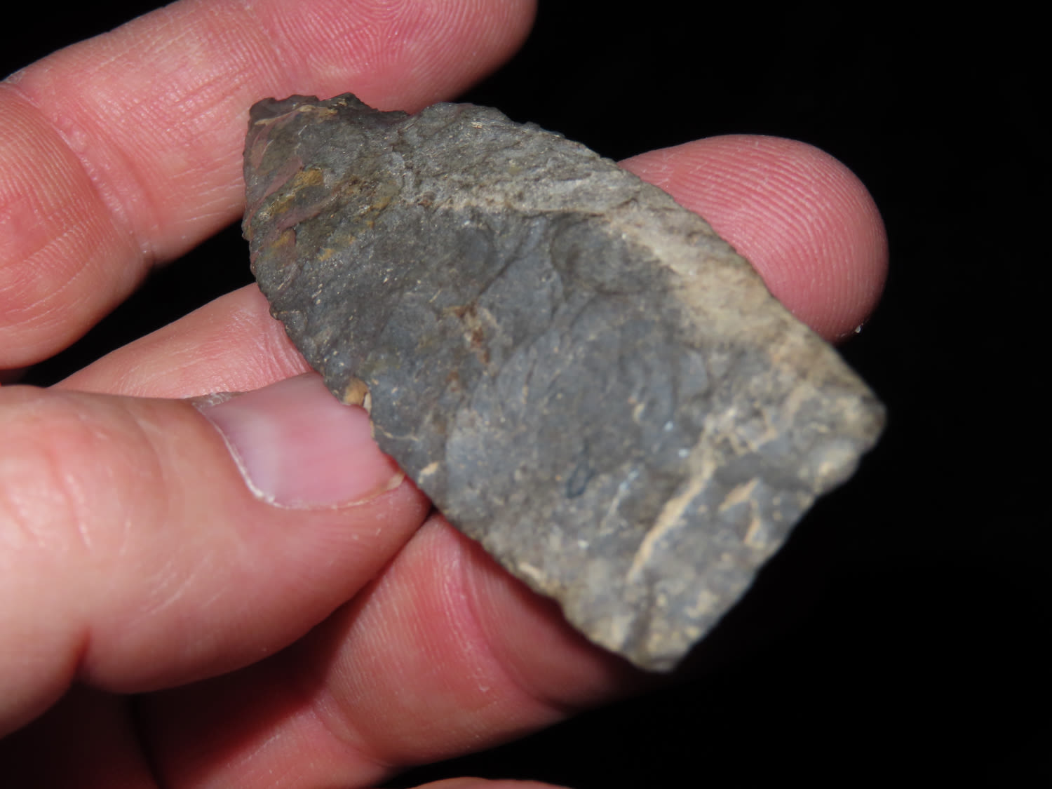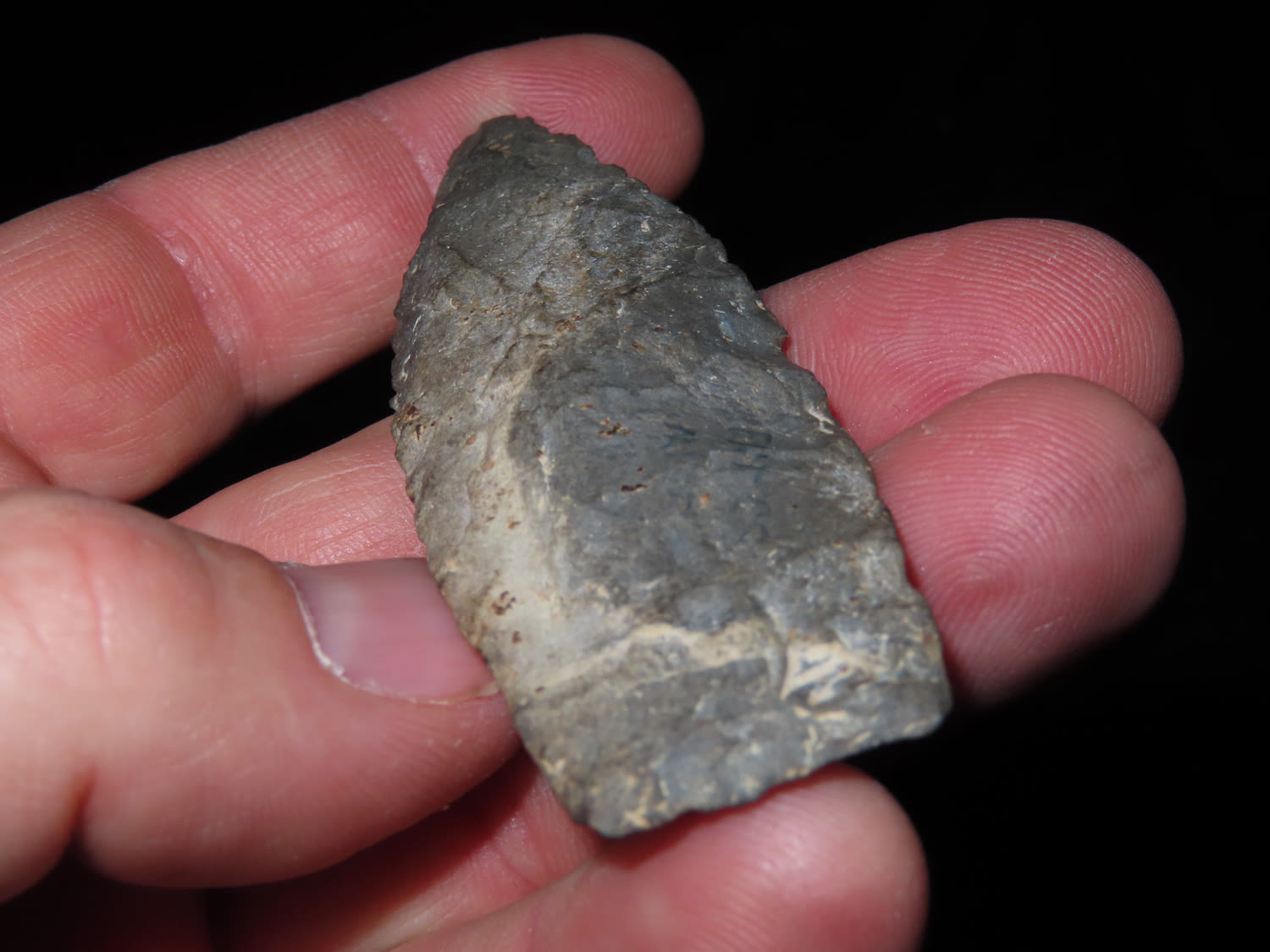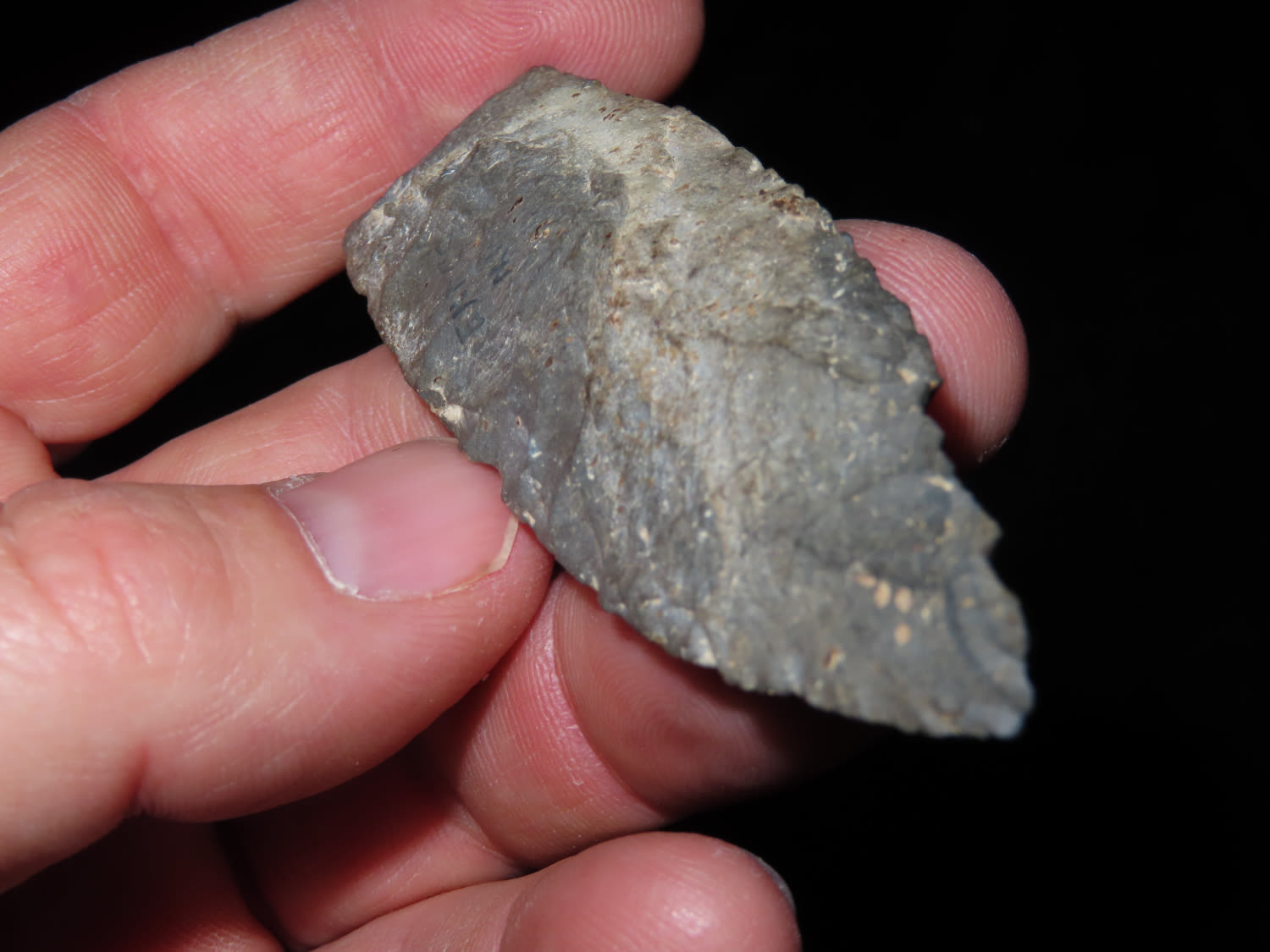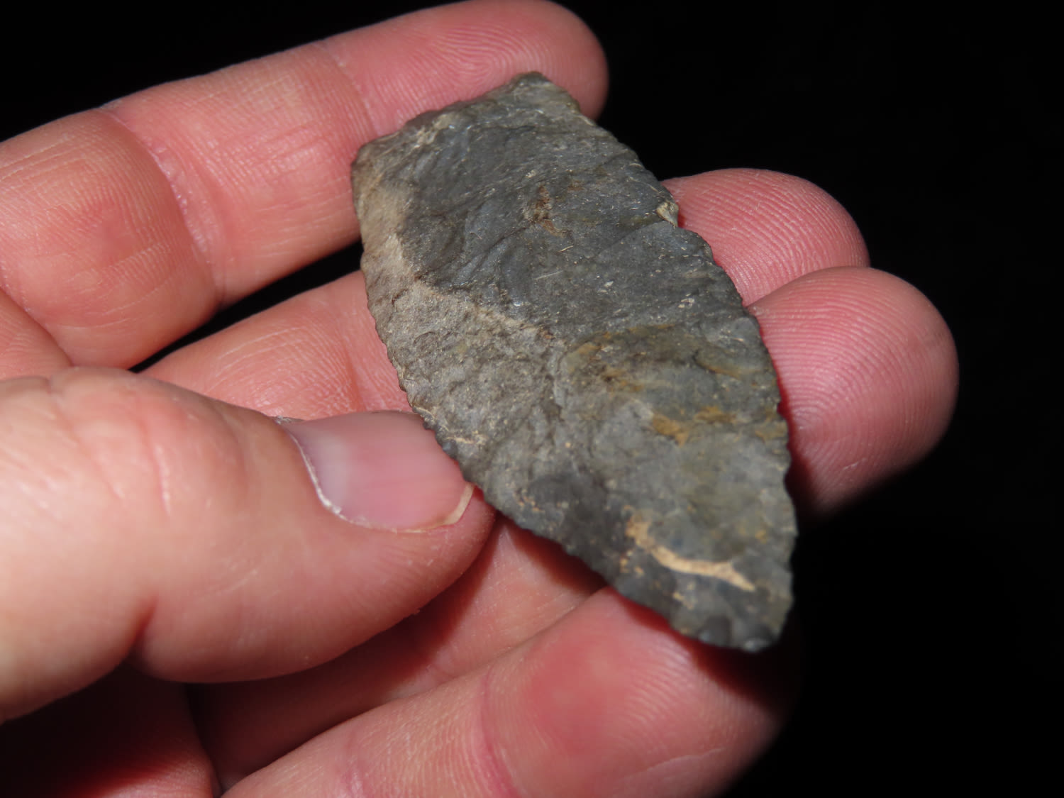 3 7/16″ PALEO LANCE / AGATE BASIN FOUND IN KENT COUNTY MICHIGAN, NICE ERALY PIECE, BASAL EDGE GRINDING HALFWAY UP THE EDGES