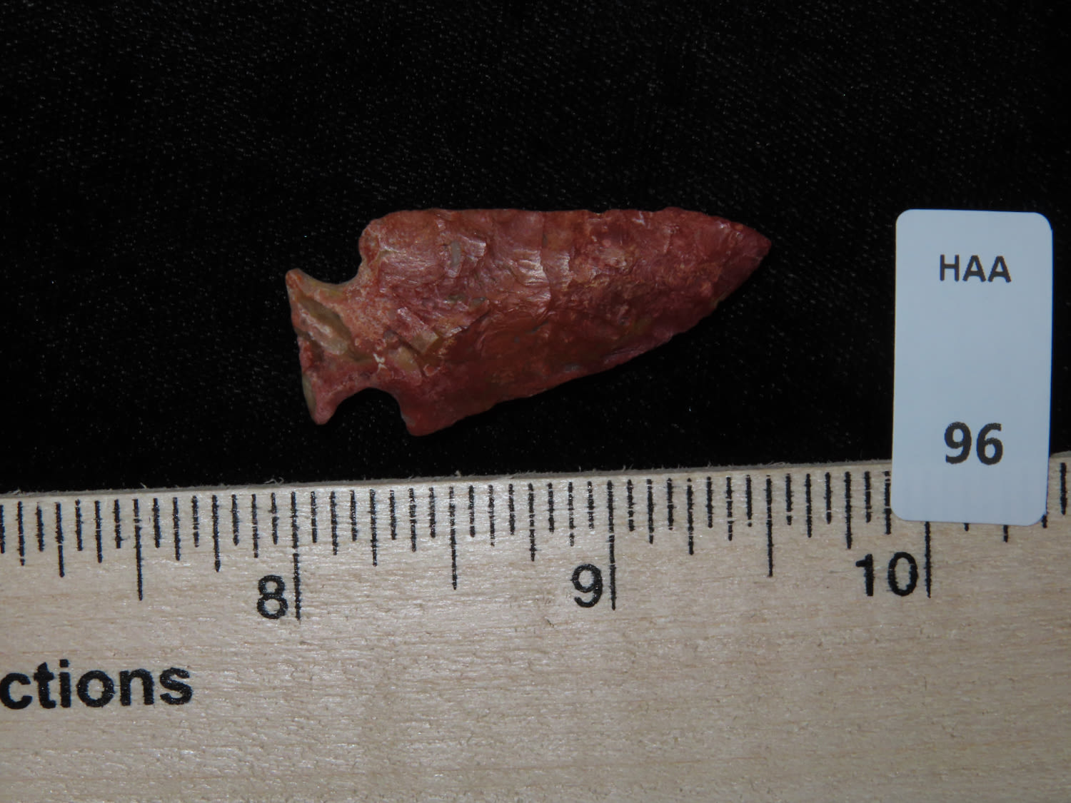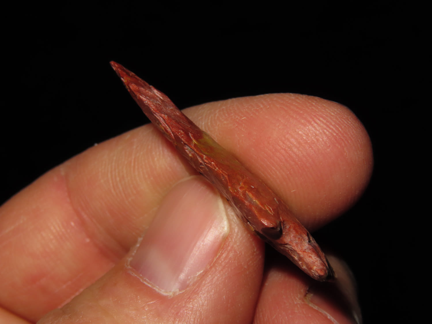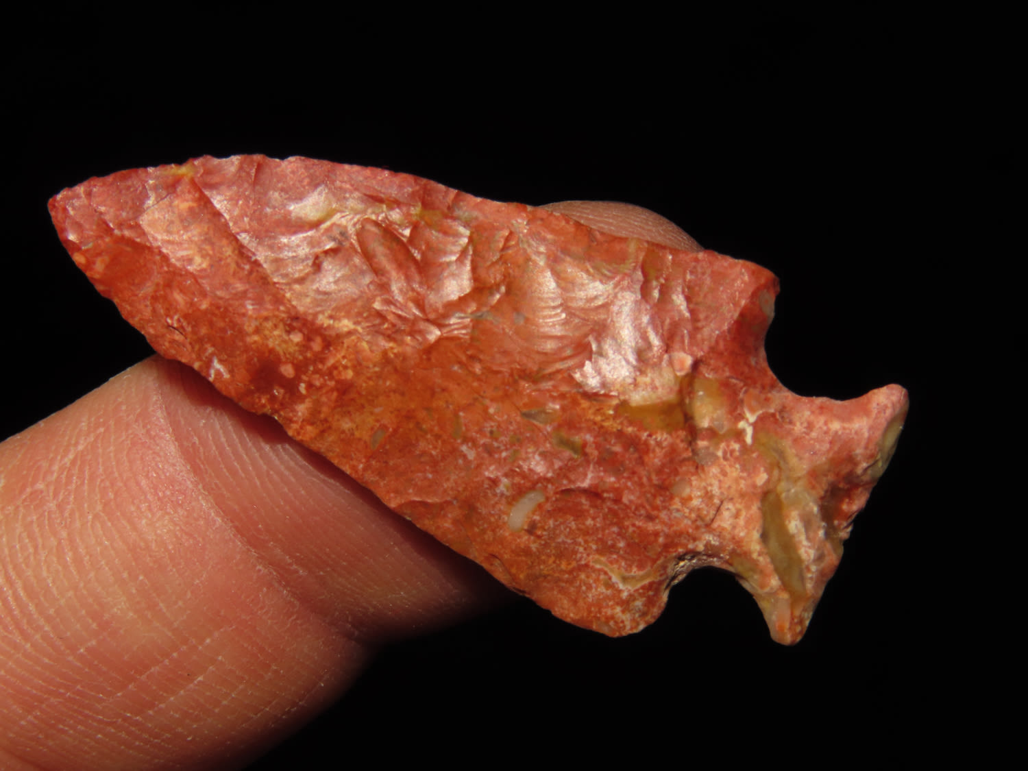 1 9/16″ COLORFUL BIRD POINT / MINI TABLEROCK FOUND IN ADAMS COUNTY ILLINOIS, EXCELLENT FLAKING AND SUPER COLOR