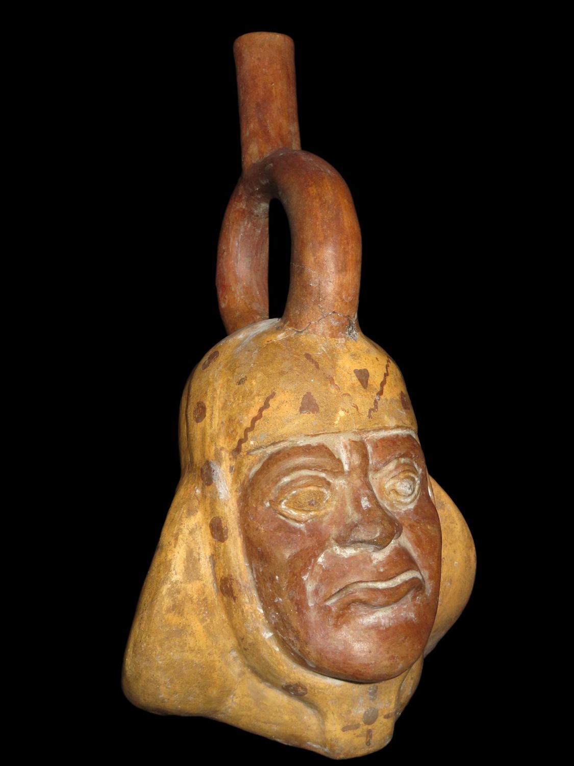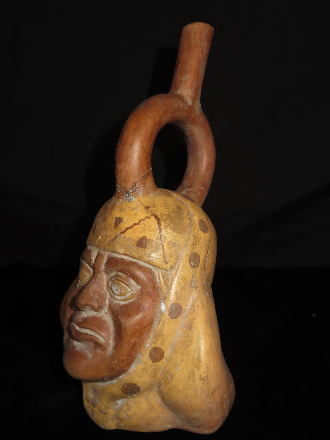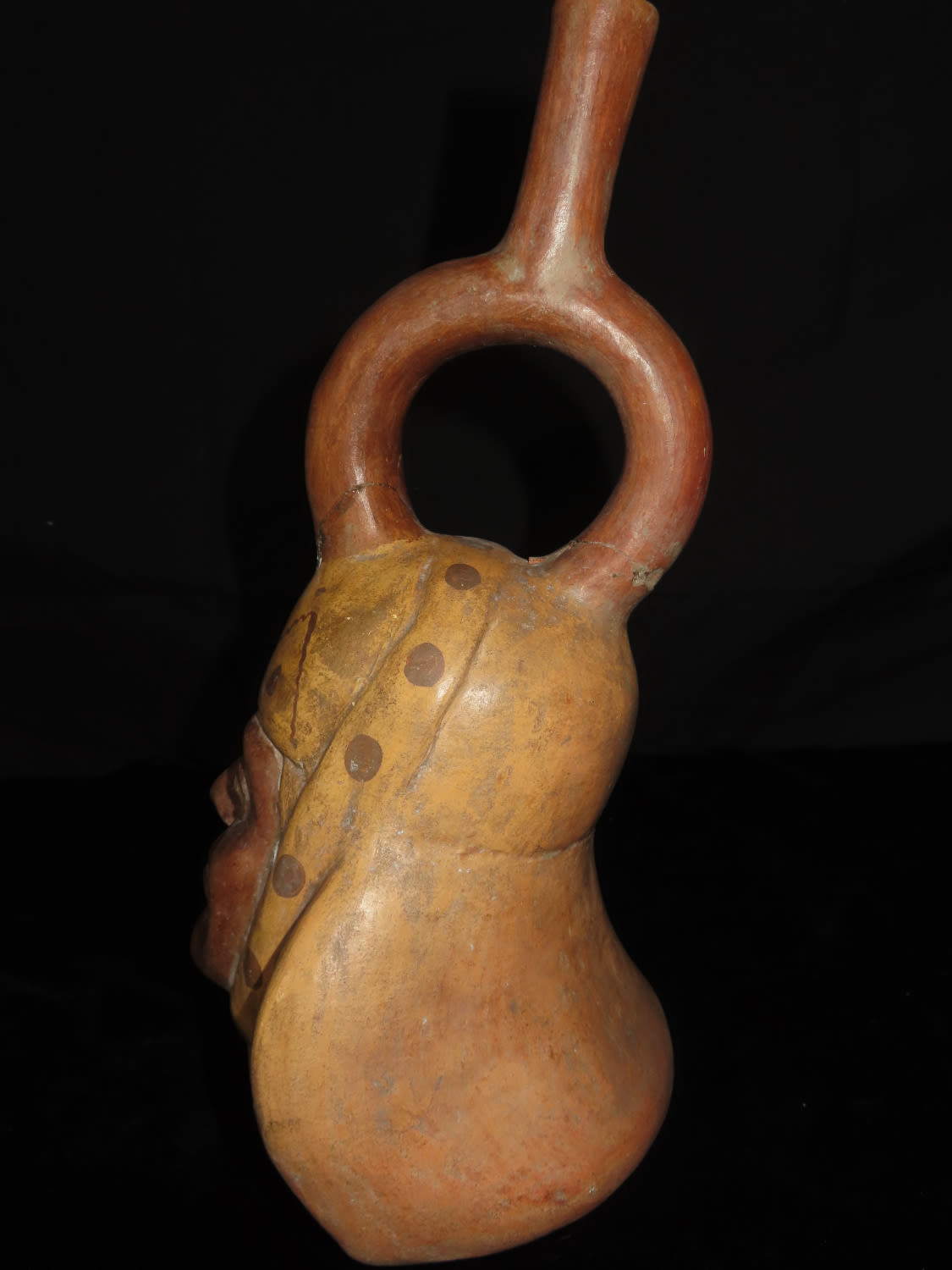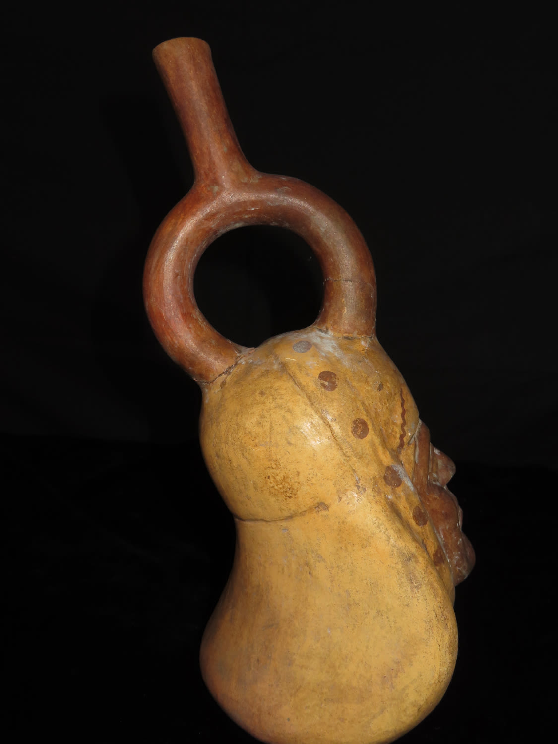 11 1/2" Replica Pre-Colombian Moche Portrait Head Stirrup Vessel