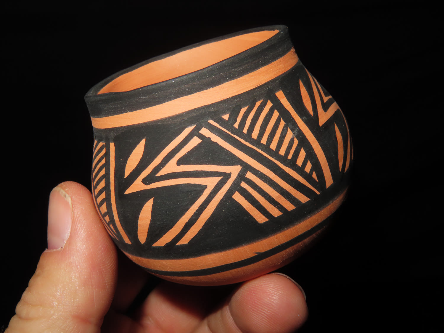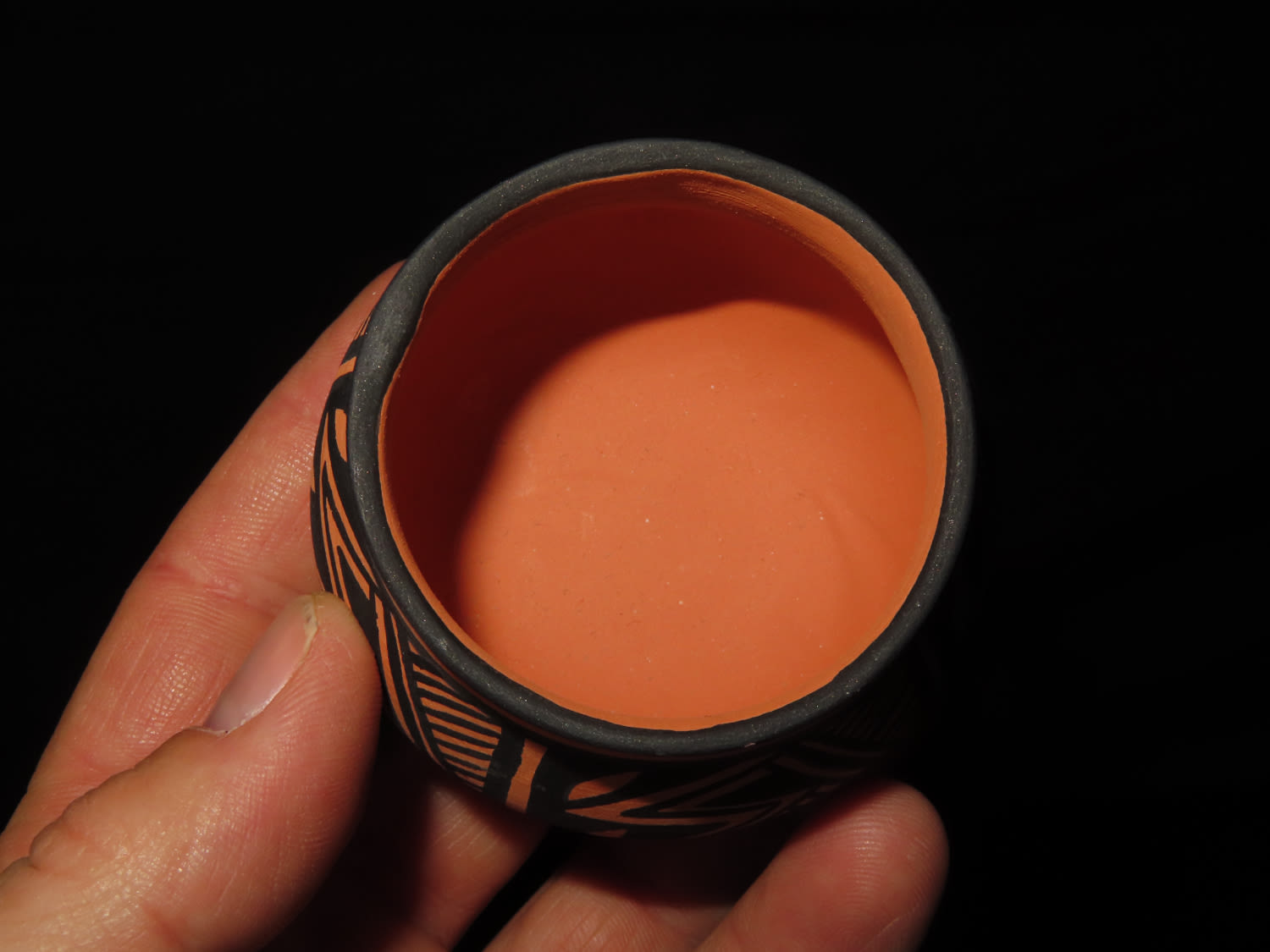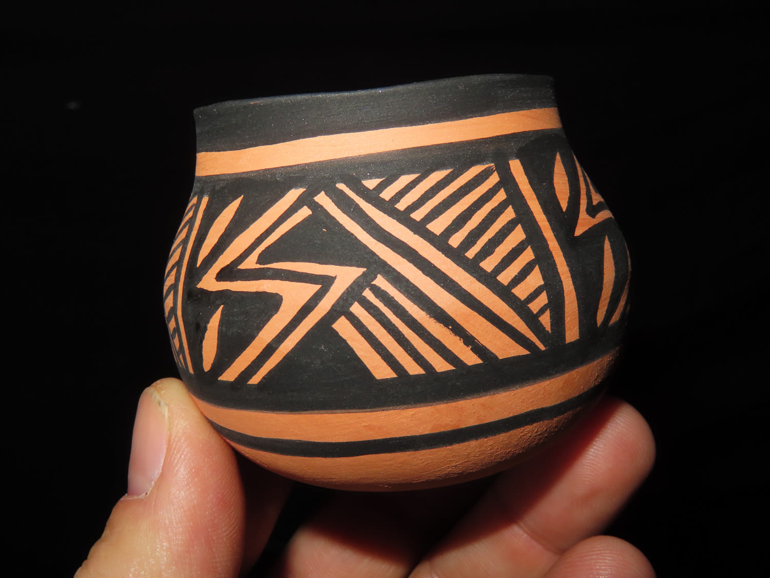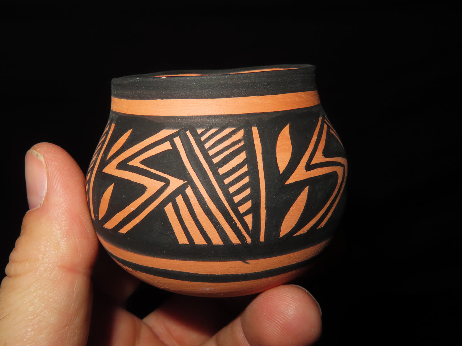 2 1/8″ Signed Hand Painted Vessel, very collectible-Native American, Terra Cotta