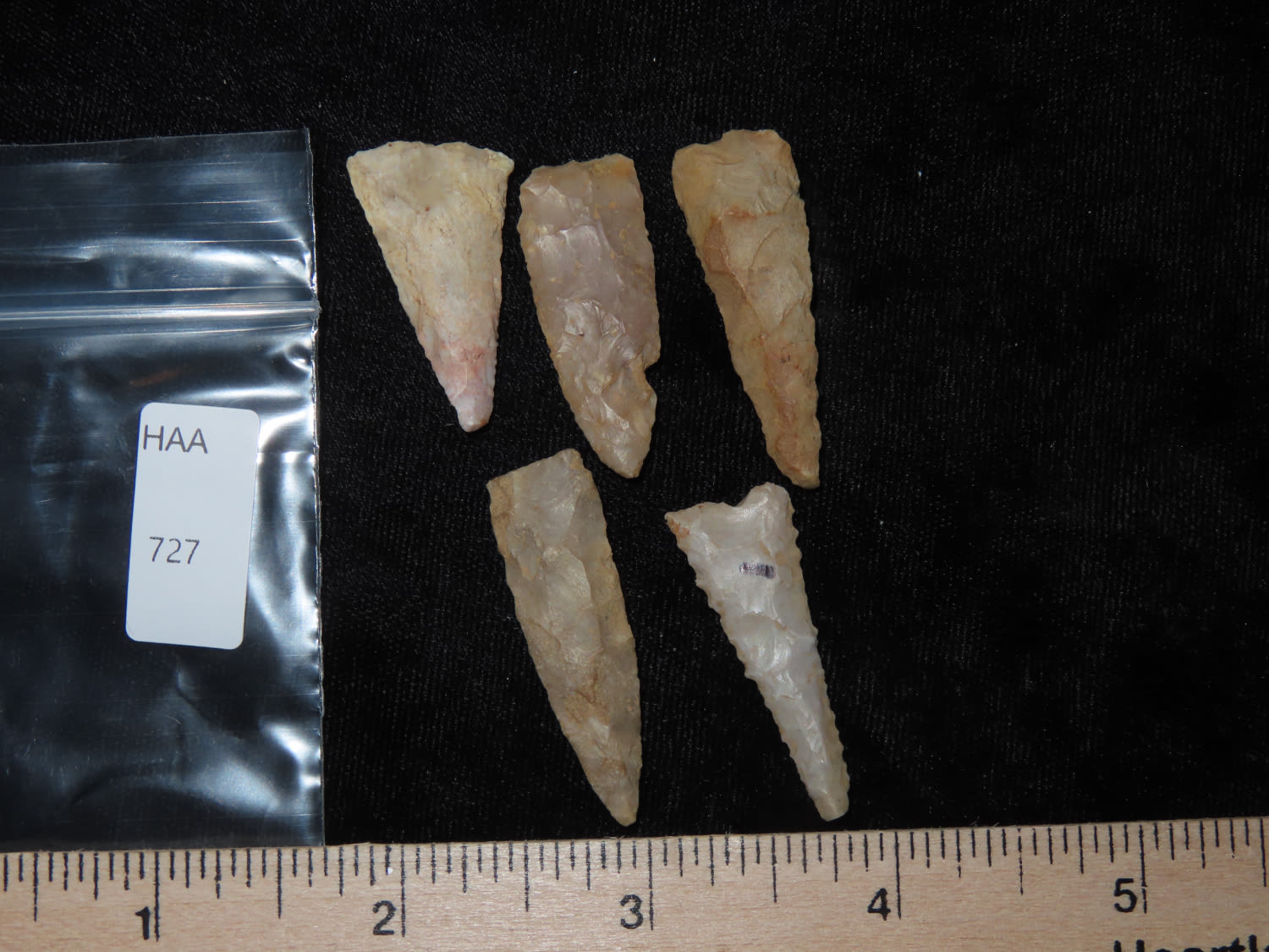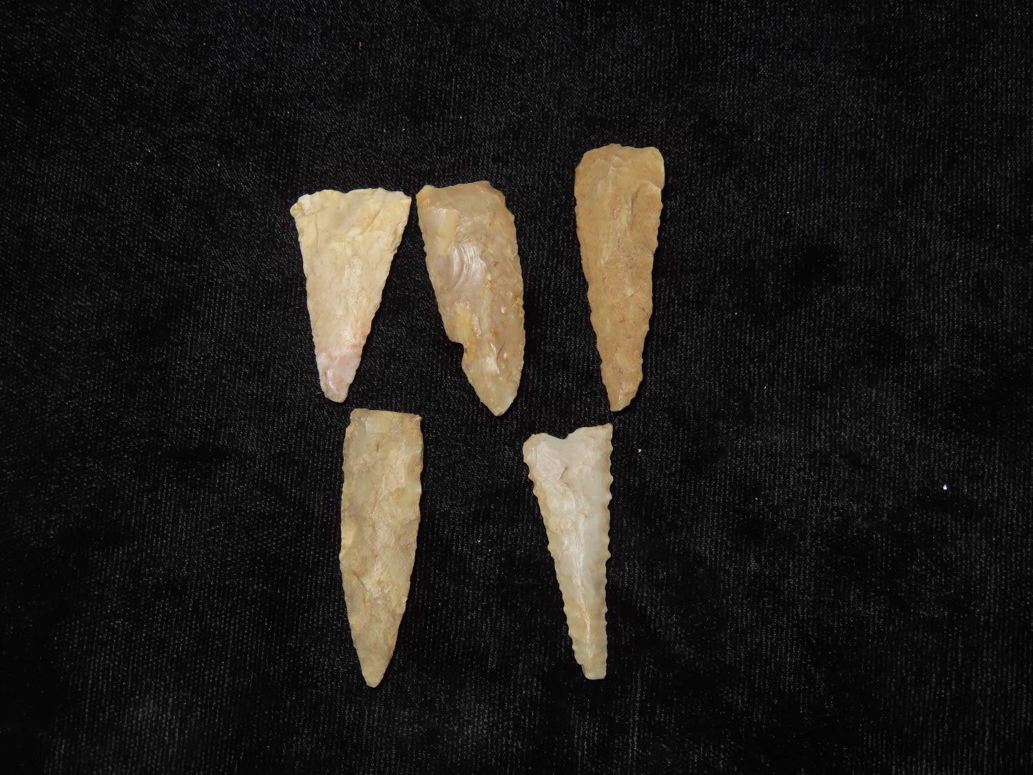 Lot of 5 triangular Bird Points, Mississippian, all found in Missouri