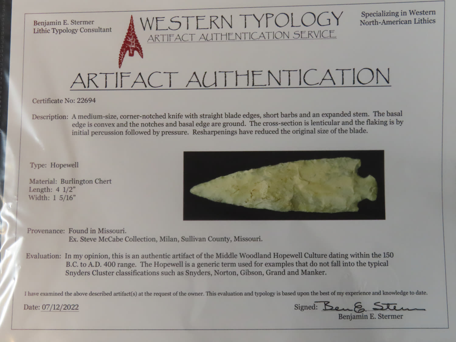 4 1/2″ Hopewell, Stermer COA, EX Steve McCabe Collection Sullivan County, Milan Missouri