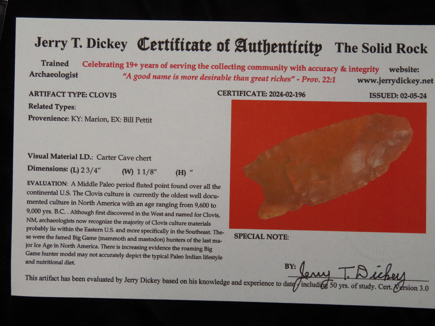 2 3/4″ Clovis, Dickey COA, found in Marion Co Kentucky, Carter Cave Chert material, EX Bill Pettit Collection