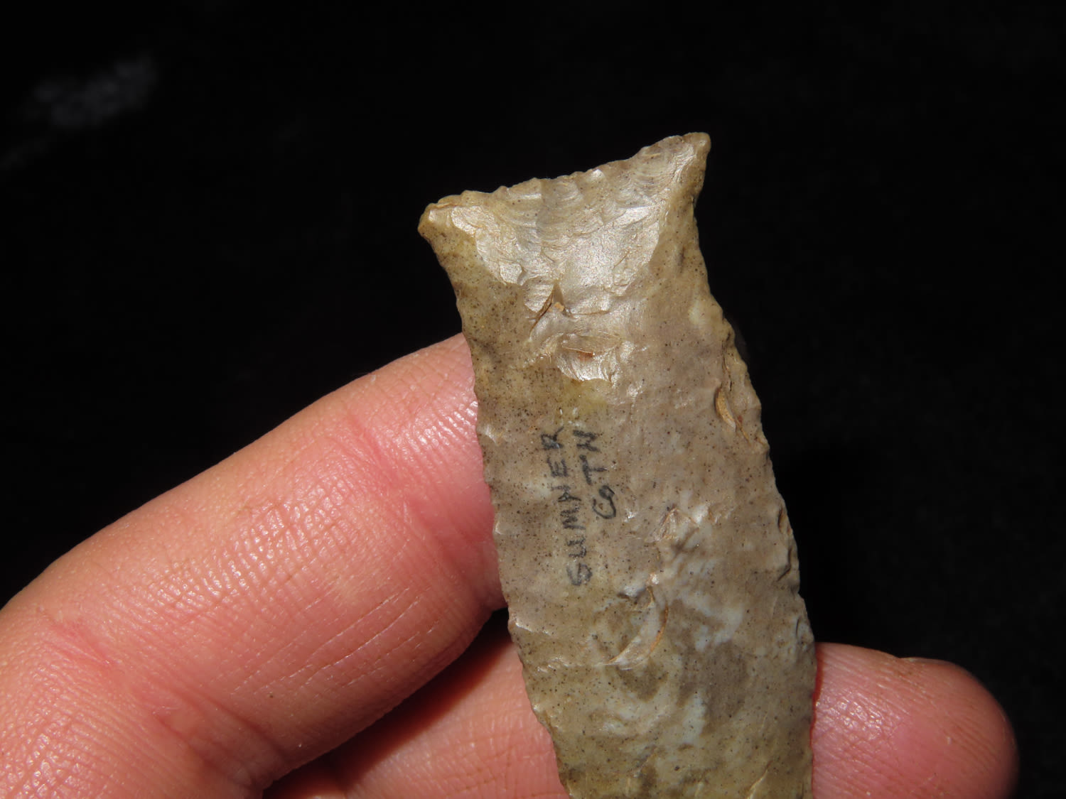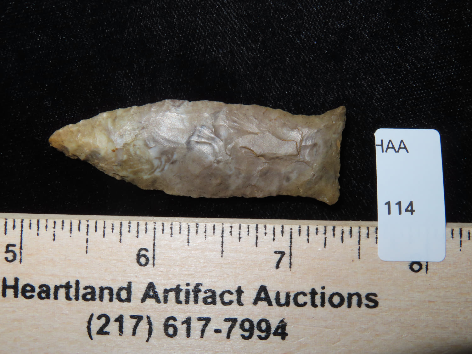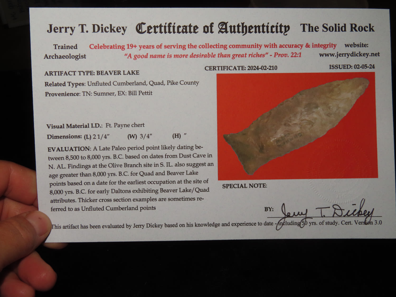FINE!! Beaver Lake 2.1/4″ Dickey COA, found in Sumner Co Tennessee Ex Bill Pettit Dickey states this type is also sometimes refered to unfluted cumberland points. Nicely Flaked and made from Ft Payne Chert.