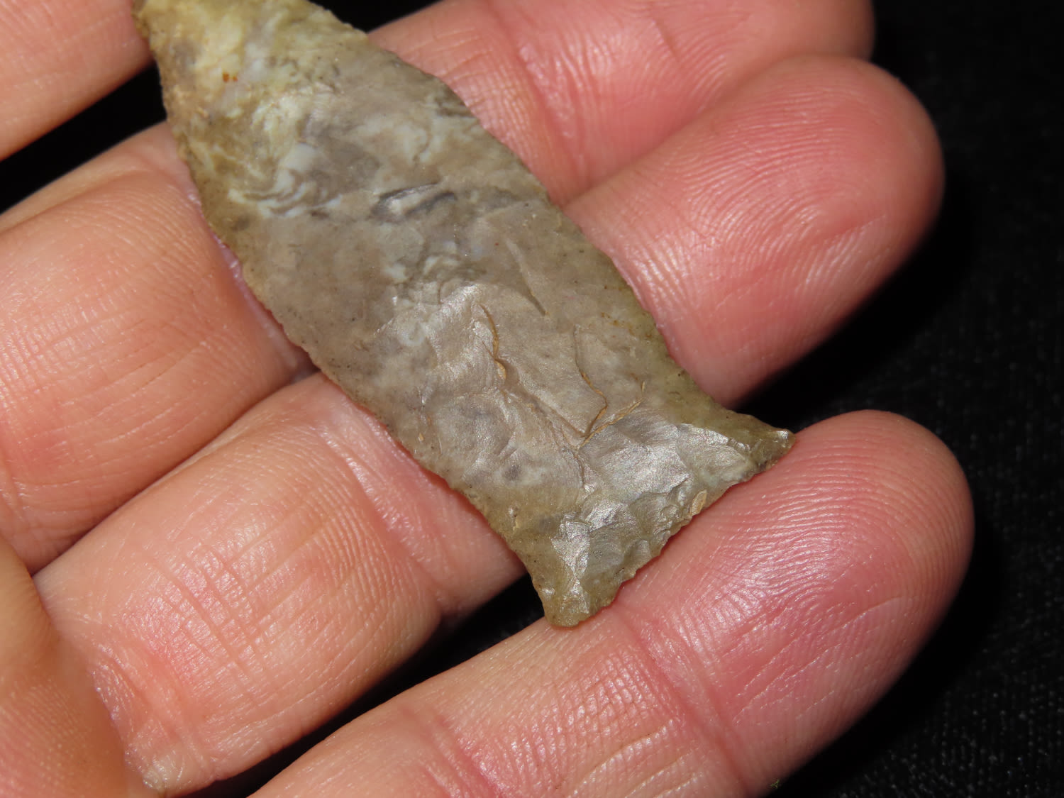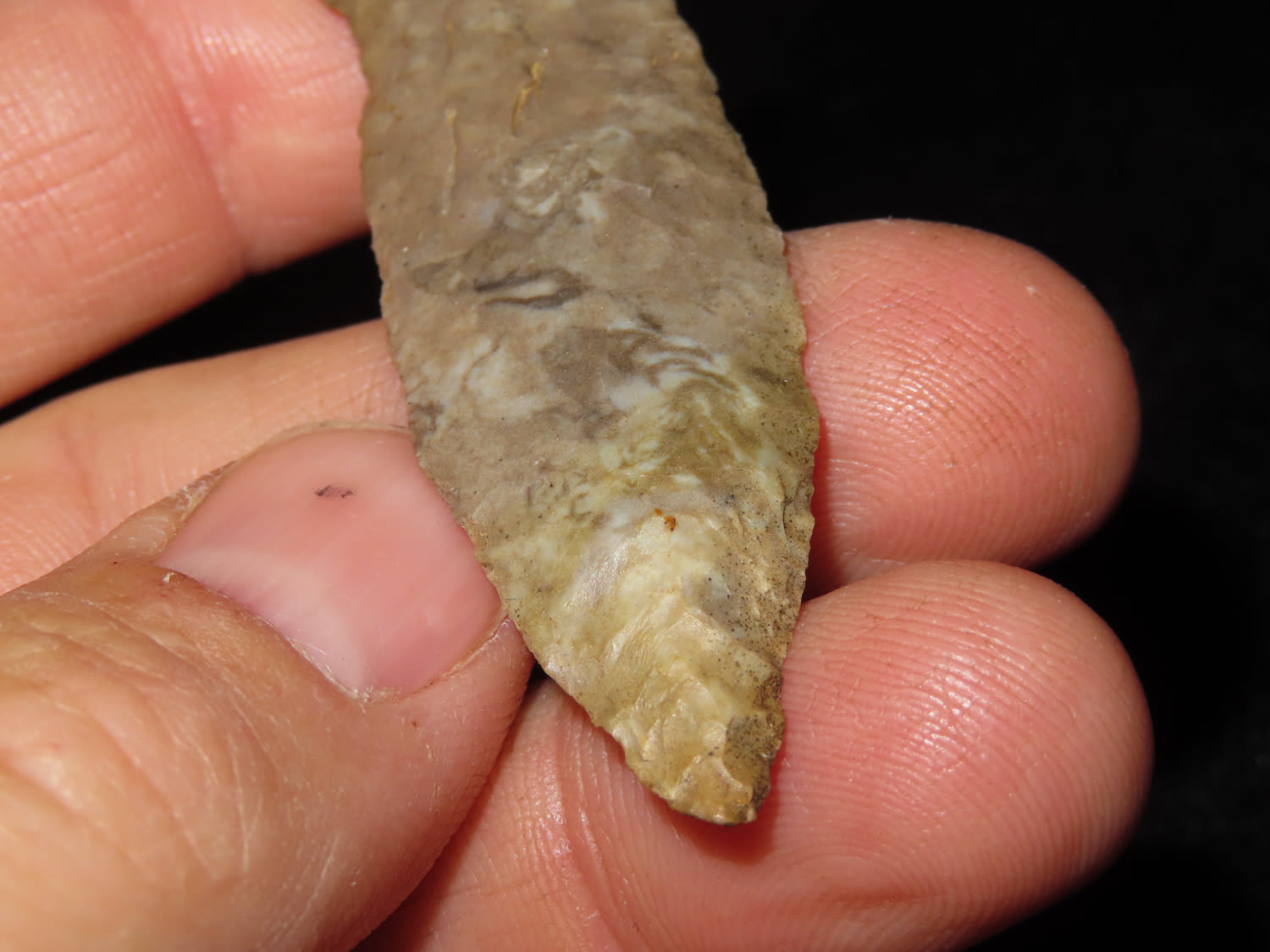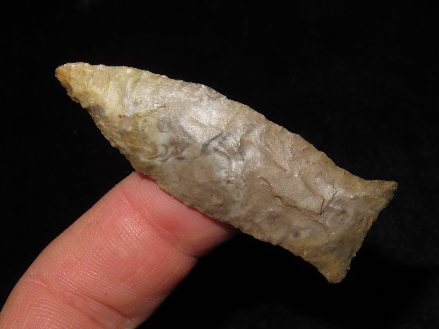 FINE!! Beaver Lake 2.1/4″ Dickey COA, found in Sumner Co Tennessee Ex Bill Pettit Dickey states this type is also sometimes refered to unfluted cumberland points. Nicely Flaked and made from Ft Payne Chert.