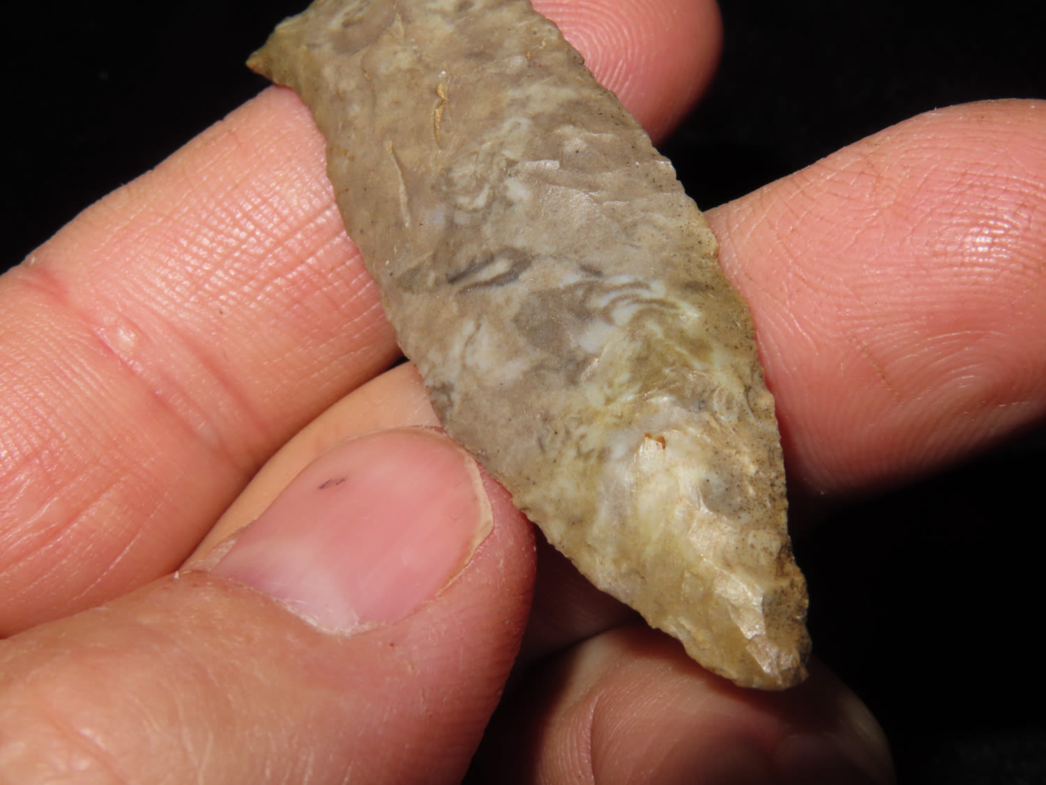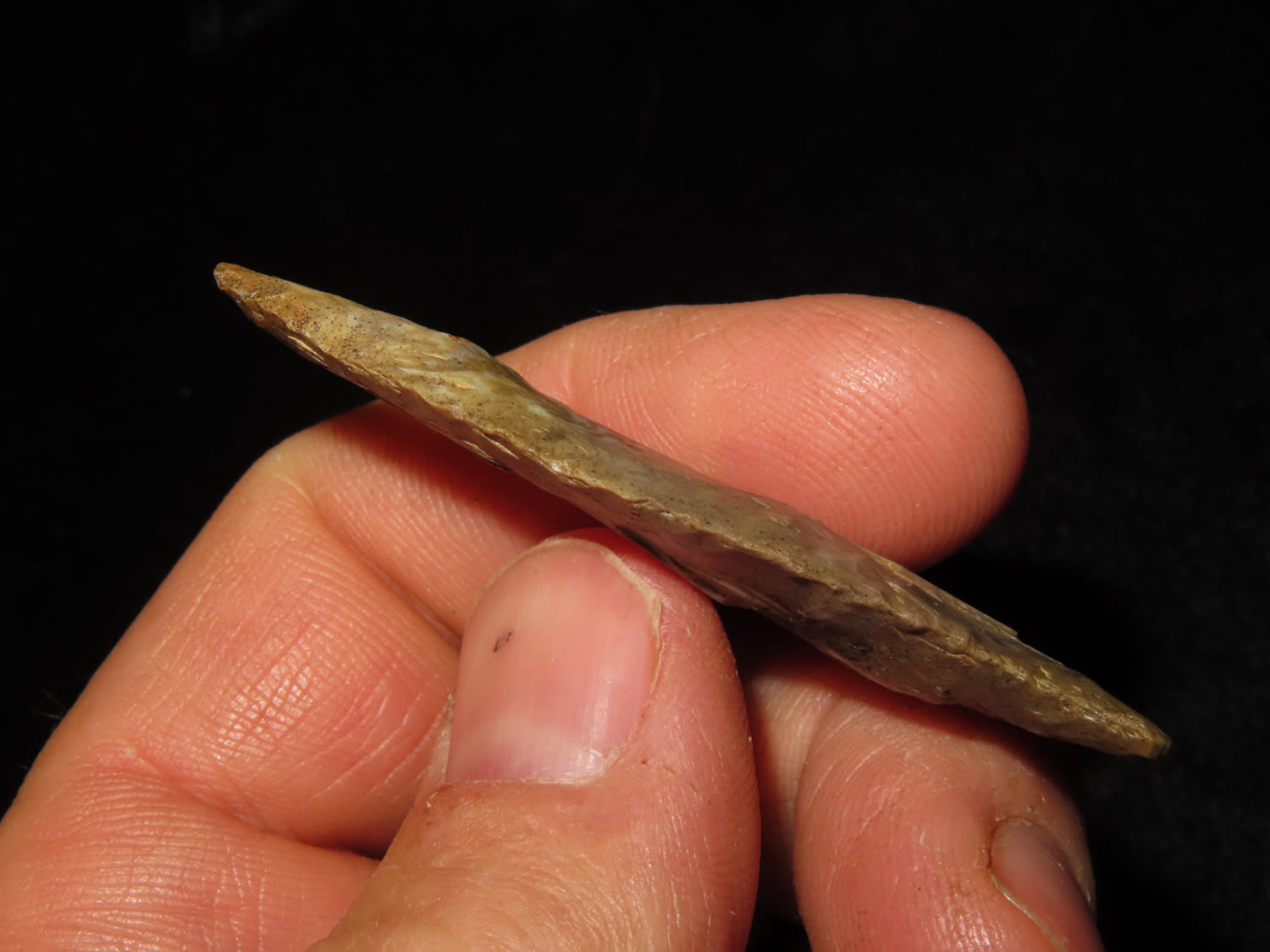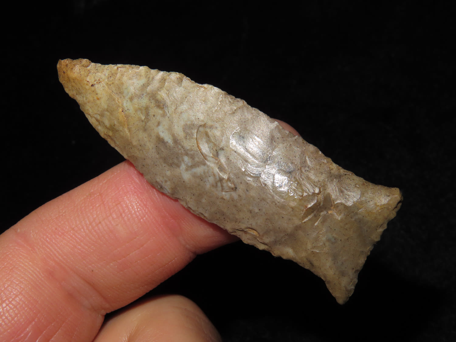 FINE!! Beaver Lake 2.1/4" Dickey COA, found in Sumner Co Tennessee Ex Bill Pettit Dickey states this type is also sometimes refered to unfluted cumberland points. Nicely Flaked and made from Ft Payne Chert.