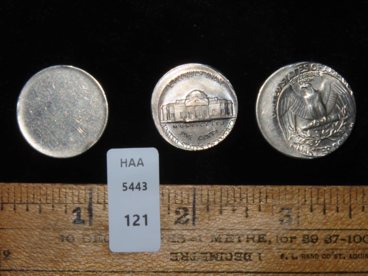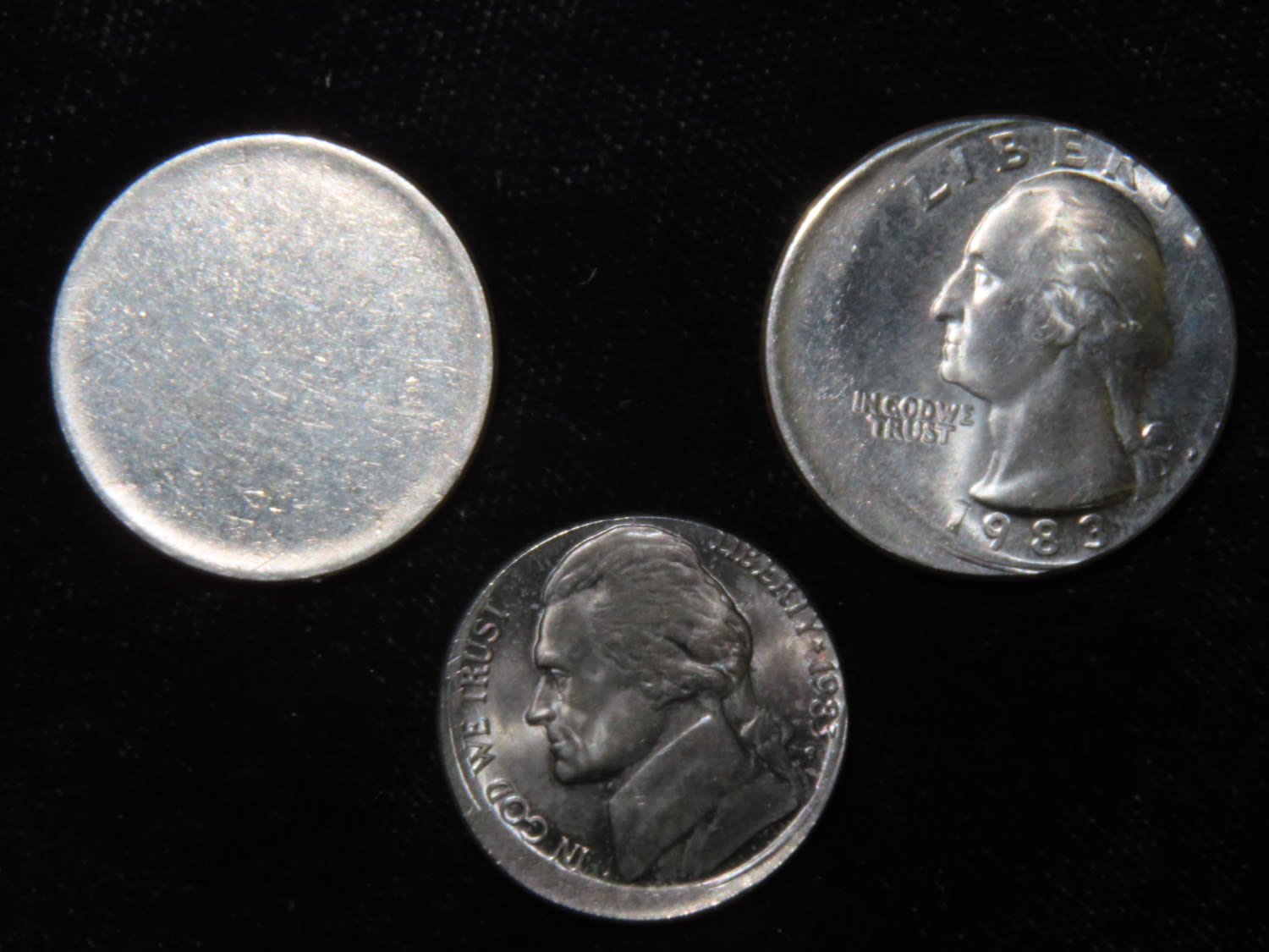 3 United States of America Coins, 1983 Nickel Off-Center Strike, 1983 Quarter Off-Center Strike, and Blank Planchett