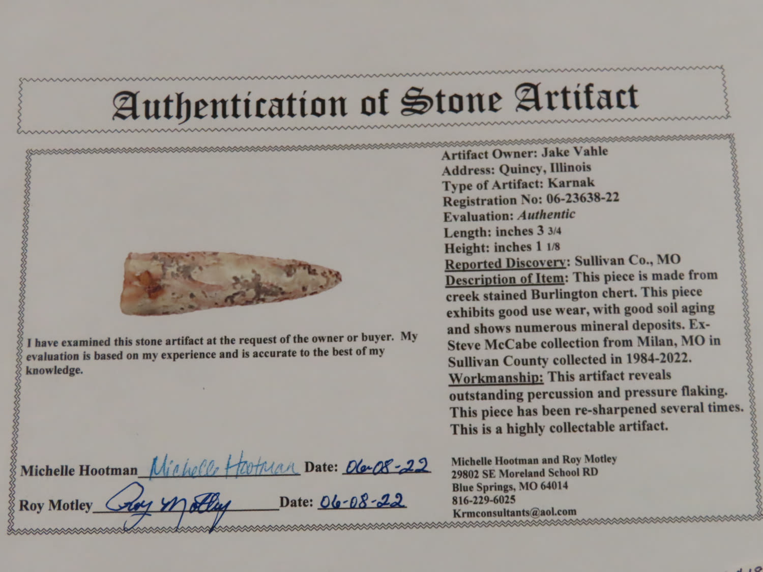 Mega Color 3.3/4″ Karnak, Motley COA, Sullivan CO MO, Ex McCabe Coll.