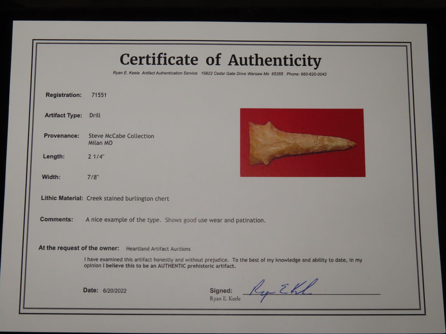 2.1/4″ Nicely Made Drill, Keele COA, Ex Steve McCabe Coll, Milan MO